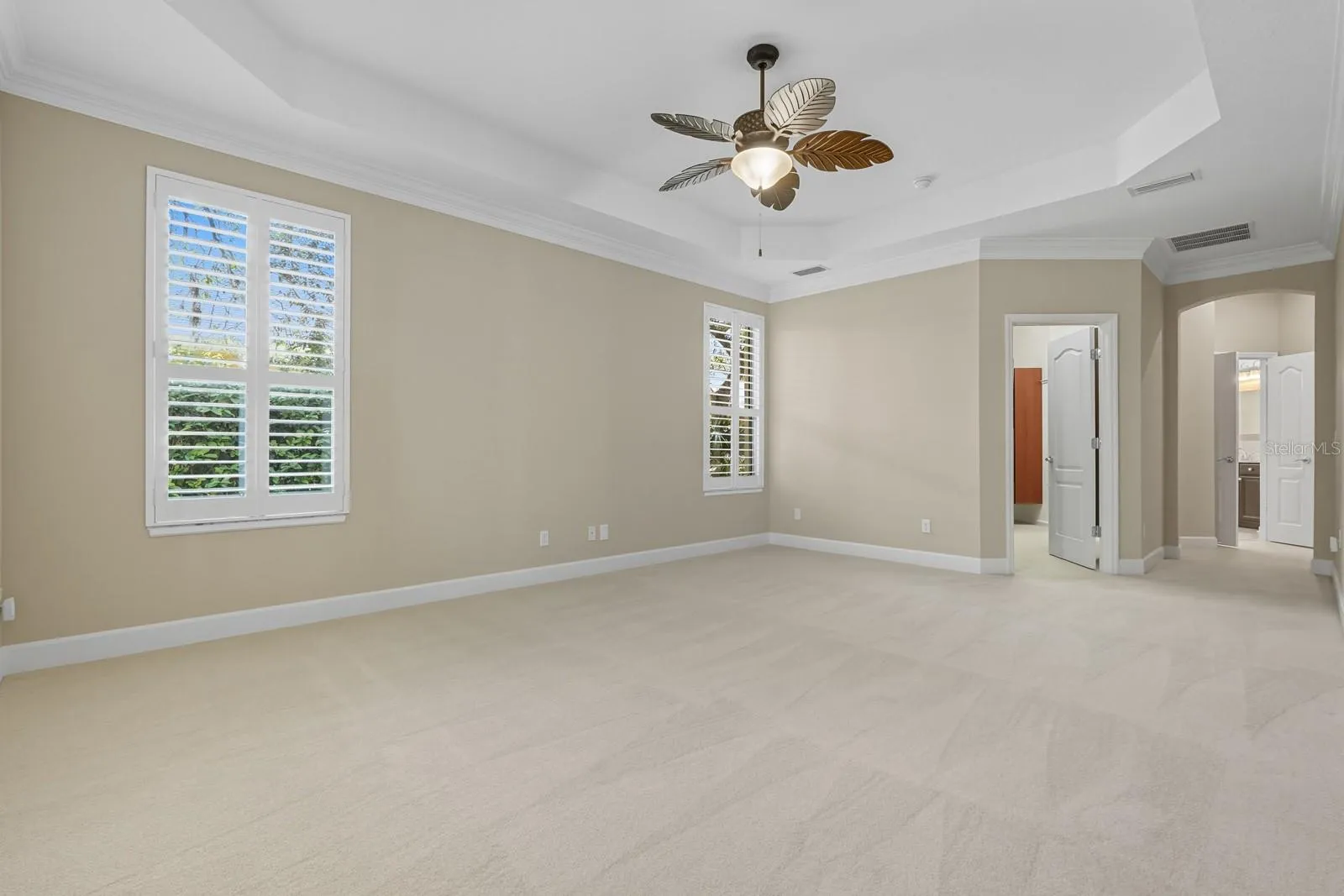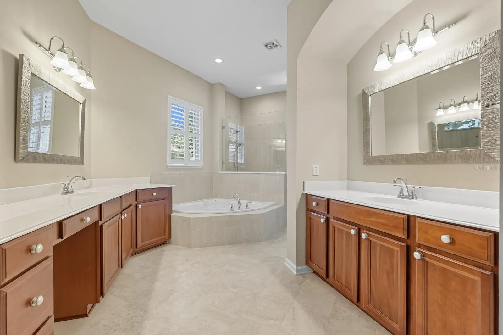 All bedrooms are on the first floor with large bonus room featuring full bathroom upstairs. The split plan offers complete privacy for your large primary bedroom suite which opens to pool and features huge his and hers walk in closet, and separate vanities. There are three guest rooms on first floor as well, one with en suite. The large upstairs bonus room could be a fifth bedroom, office, play room, craft room or separate living space.