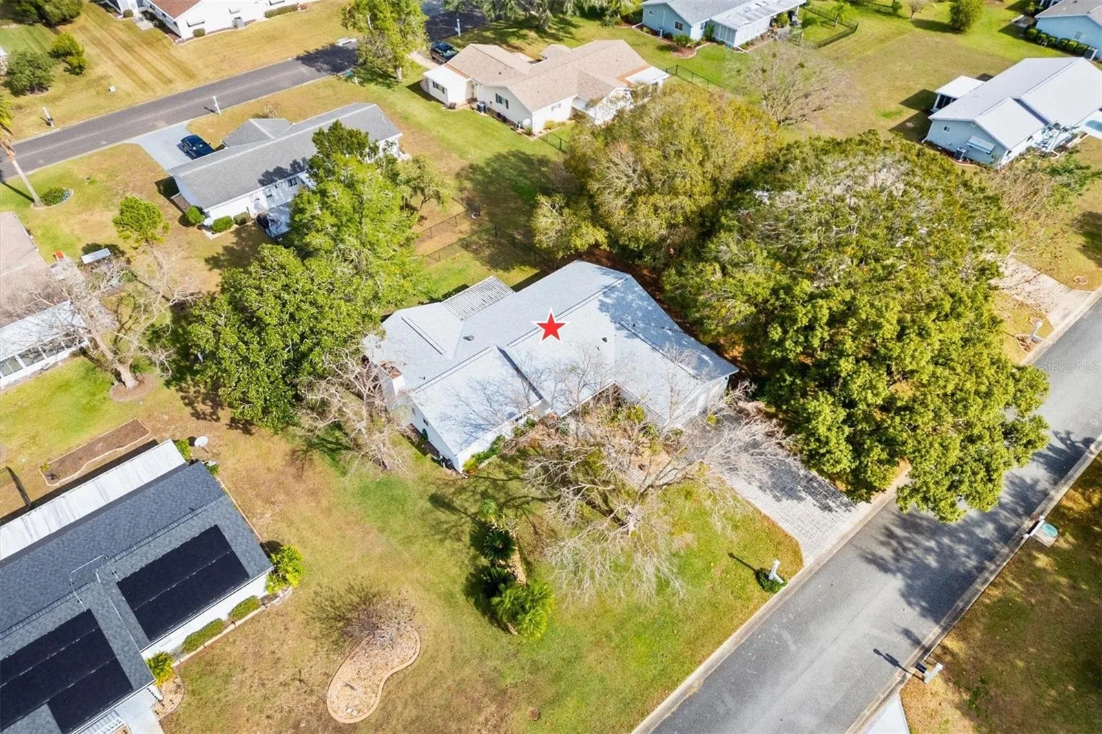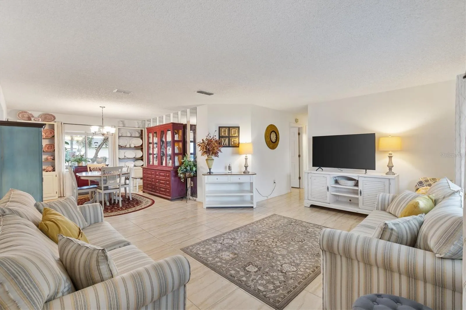 Spruce Creek South, 55+ Gated Golf Course Community just 2 miles north of The Villages. This 3/2/2 Magnolia is 1,852 sq ft of perfectly move in ready living space! You are greeted by the paved driveway and sidewalk leading you to the front entry beautiful lead glass door. As you enter the door you will find the formal living and dining room combo. The master bedroom is to the left while the two guest bedrooms are split to the right side of the living room. As you pass through the dining area you will find the newly updated kitchen with newer cabinets and high-definition laminate counter tops can lighting. The kitchen opens onto the family room with a wood burning fireplace, a rare find! As you pass through the family room you will enter the Florida room which leads to an oversized covered porch with plenty of room for your grill and outdoor dining. The large shaded fenced back yard gives ample room for your furry friends to roam. Both bathrooms have been updated with newer vanities, stone counter tops and vinyl plank floors. The master bathroom has been completely updated to include a large tiled walk-in shower, double sink vanity and an added linen closet. Beautiful ceramic tile throughout all but the bathrooms which have LVP flooring. Enjoy the Spruce Creek South Community Center, exercise facilities, saunas, dance and exercise classes, social activities, billiards, library and more! Golf cart access to shopping, physicians, pharmacies, and restaurants! Roof 10/2024; HVAC 10/2024; Hot Water Heater 2022; SS Refrigerator 2022; Washer 10/2024; Dryer 2019