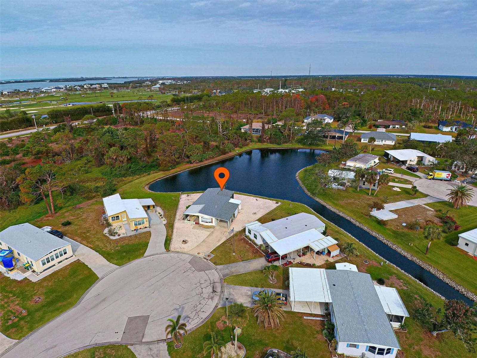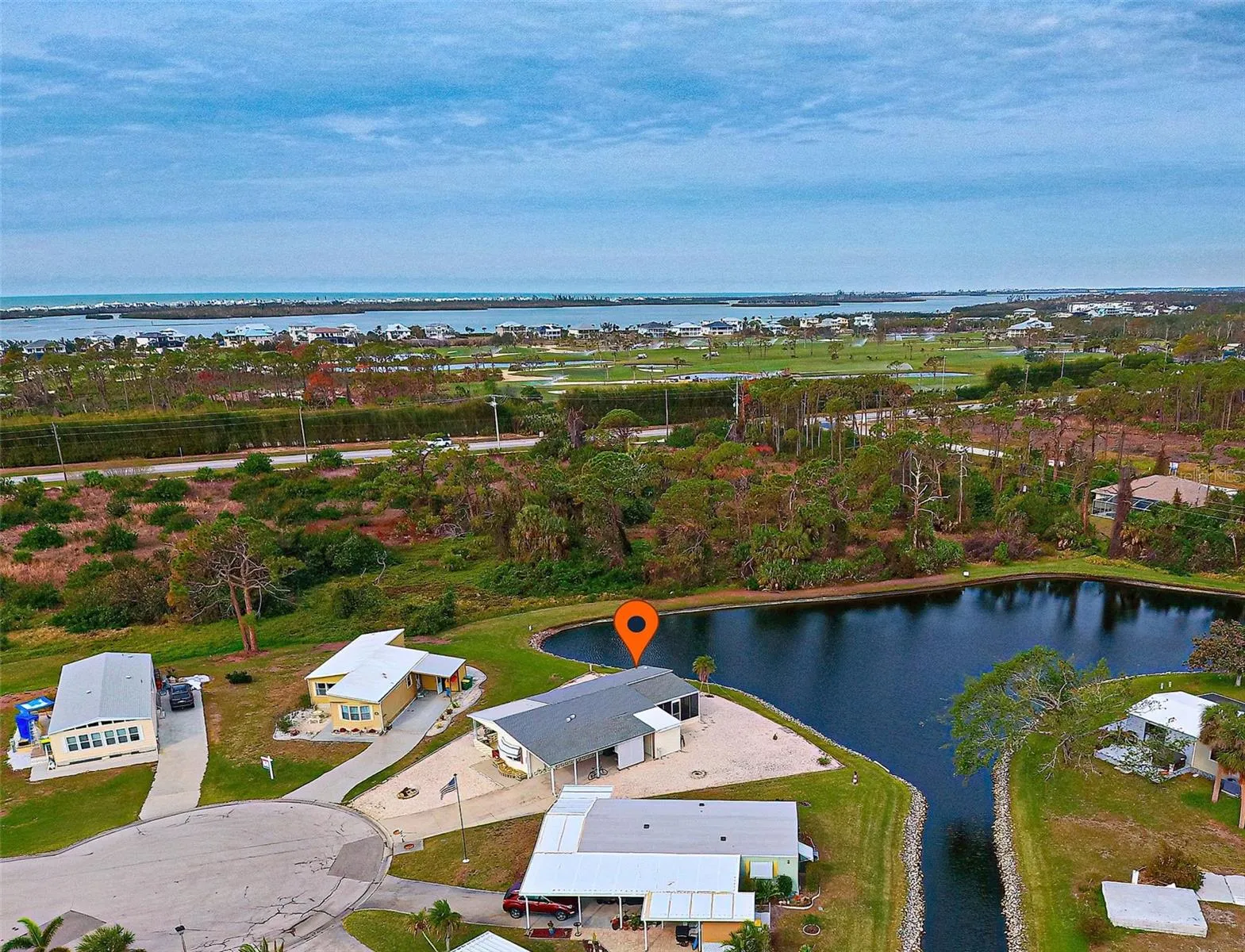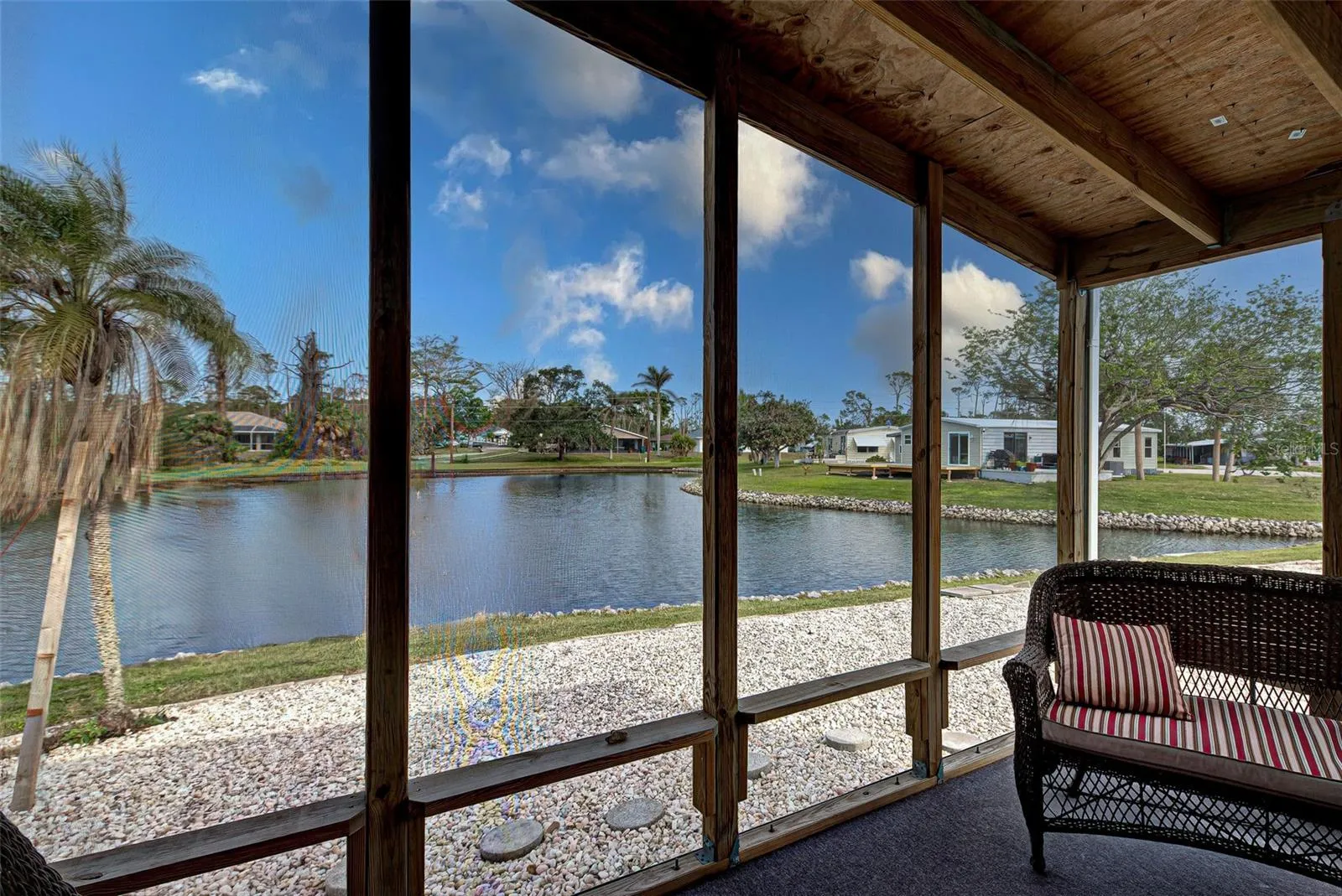 LOCATION, LOCATION, LOCATION! There’s a reason we say it 3 times. Welcome to Sandalhaven Estates/Gasparilla Pines in lovely Englewood, Florida! A +55, deed restricted, pet friendly, golf cart friendly, manufactured home community. YOU OWN THE LAND! NO LOT FEES! Being sold w/some contents included. Presenting this 1012 sq. ft., 1982, 2/bedroom, 2/bath, w/carport and back porch. This home sits beautifully overlooking a lake. Nature abounds for you to enjoy while sitting on your brand new, covered and screened back porch/lanai. Herons, Egrets, a variety of fish and wildlife call this little lake their home. Spend hours observing and enjoying “natures glory”. Many important items are new or newer-Roof 2023, Carport 2023, HVAC(Air Cinditioner) and Ducts new in 2024, Hot Water Heater 2023, Back Porch/Lanai 2023. The home has a split floorplan great for privacy when guests arrive. Kitchen opens to dining area Refrig. 2021. Primary bedroom has bath w/shower and storage. Slider leading to back porch. Attached shed has double entry doors. Shed houses washer/dryer (dryer 2024). Room for tools and yard items. Did I mention the roomy, covered front porch? So attractive and perfect for entertaining, grilling out or just lounging. No grass to mow as the entire lot is landscaped with stone. Makes the property a breeze to maintain. Located close to Boca Grande, Englewood Beach, Lemon Bay, boating, fishing and golf. Shopping and restaurants a short drive away. P.S. walkers, runners, and bikers will love the extra wide sidewalk located on Placida Road. Come enjoy SUN, FUN – that’s FLORIDA!