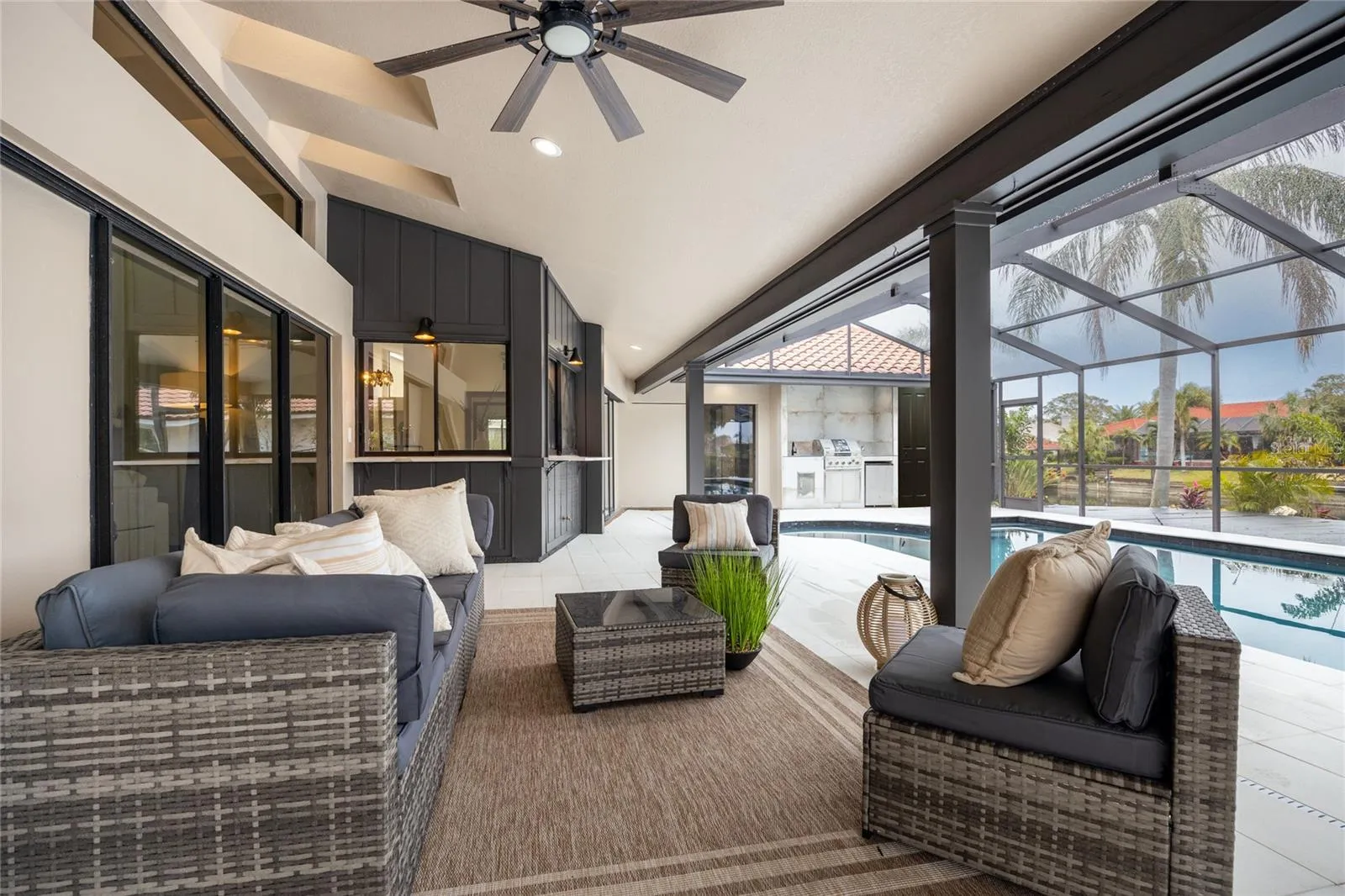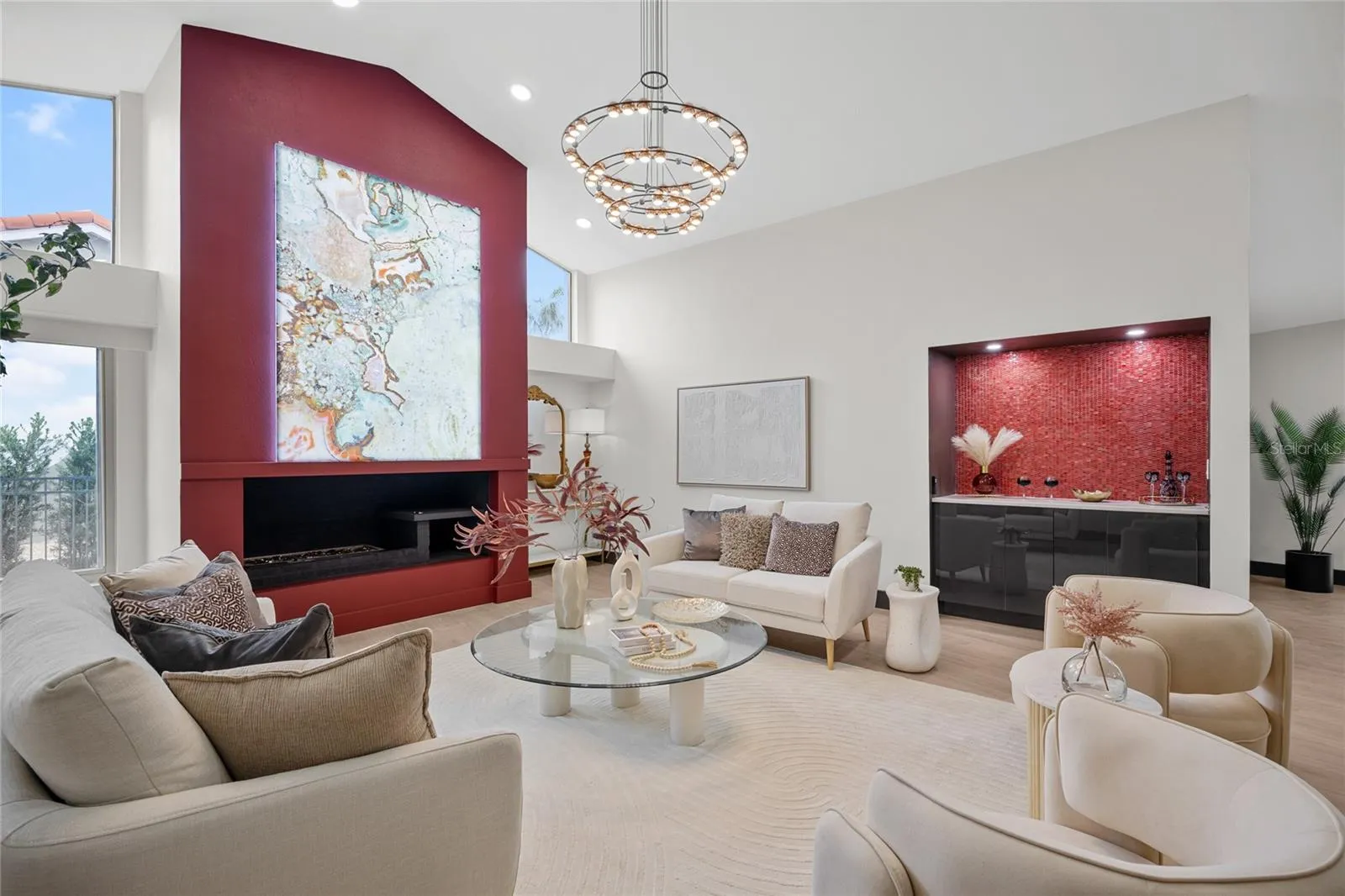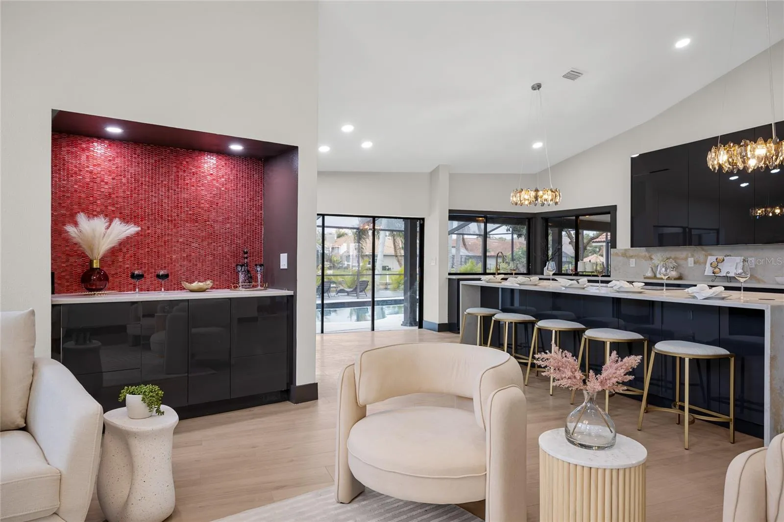 Step into the expansive family room-kitchen combo, where entertaining becomes an art form. The family room features a sleek built-in bar and an electric fireplace crowned with a custom illuminated glass art centerpiece—a true showstopper. The chef’s kitchen will steal your heart, boasting a dramatic 14-foot quartzite island, custom Italian lacquered cabinets, and Café dark stainless steel appliances. And for those perfect Florida evenings, the pass-through kitchen window leads straight to the back patio, ideal for BBQs and outdoor fun.