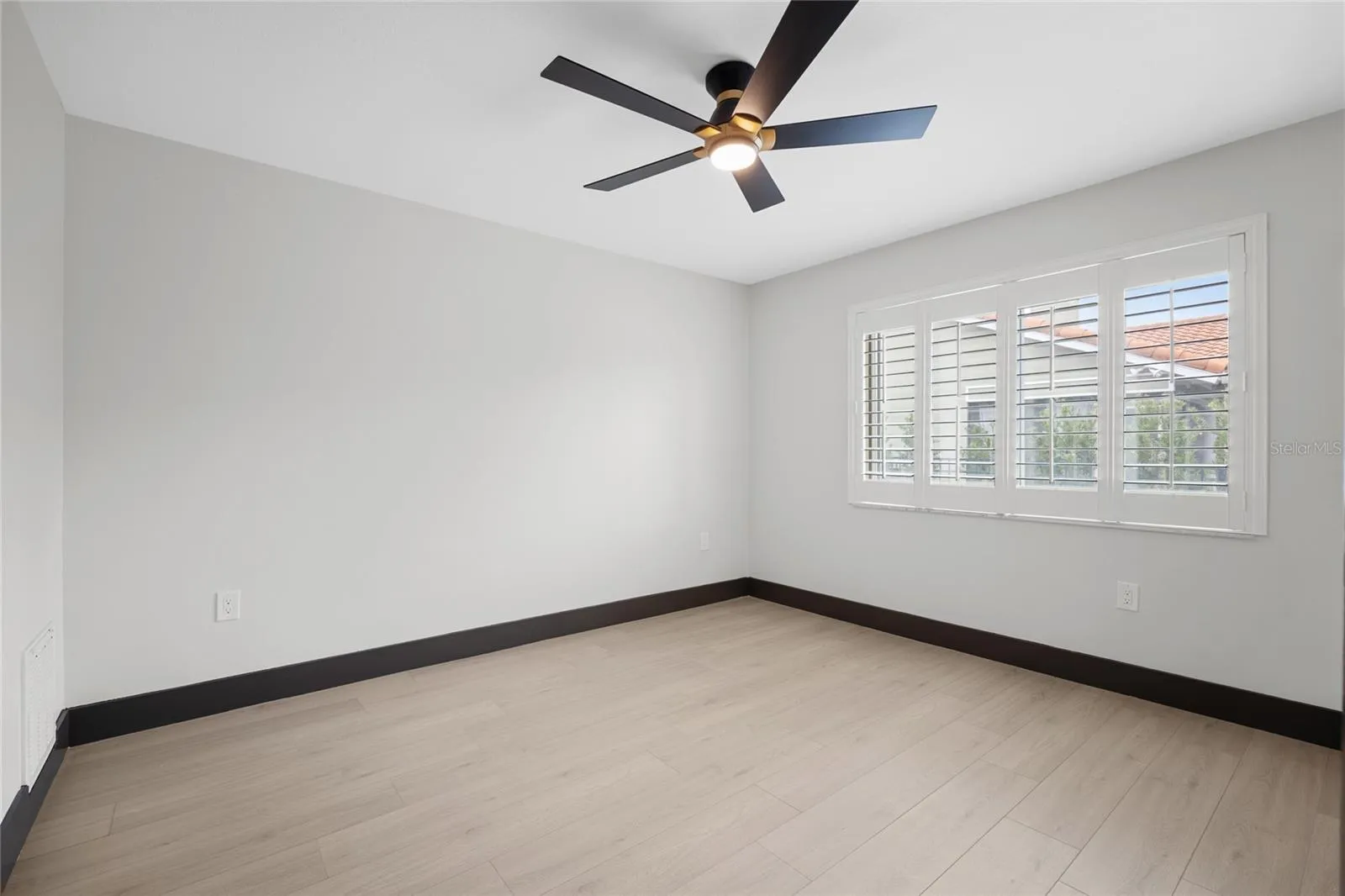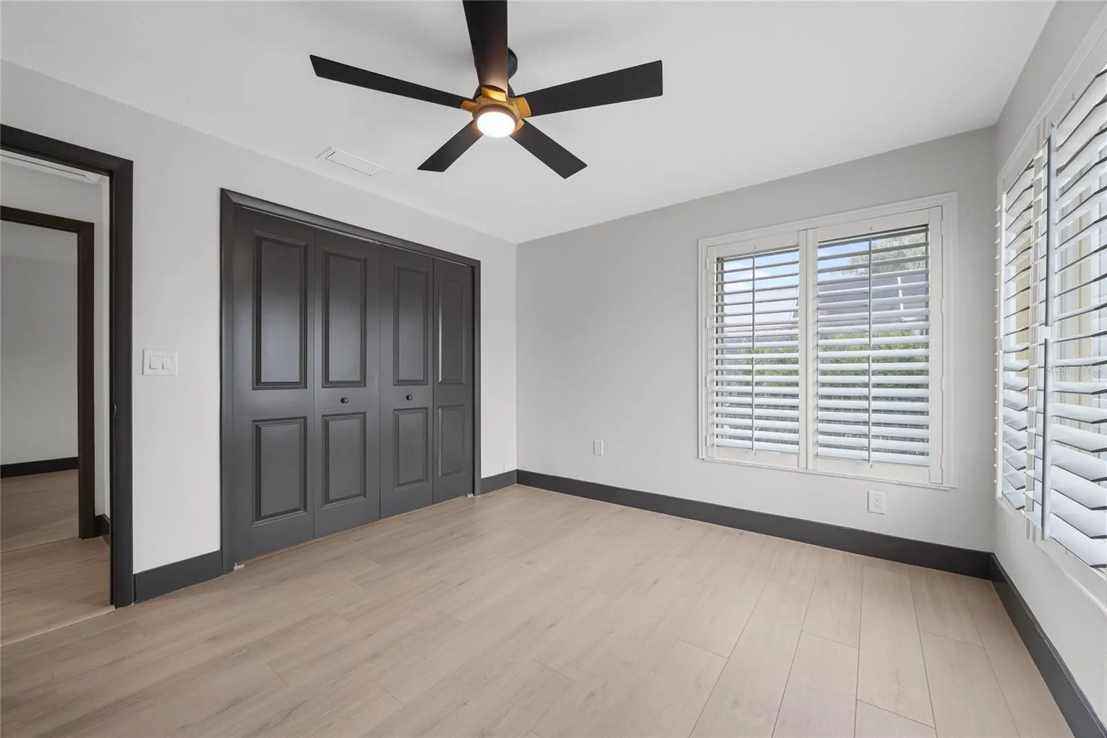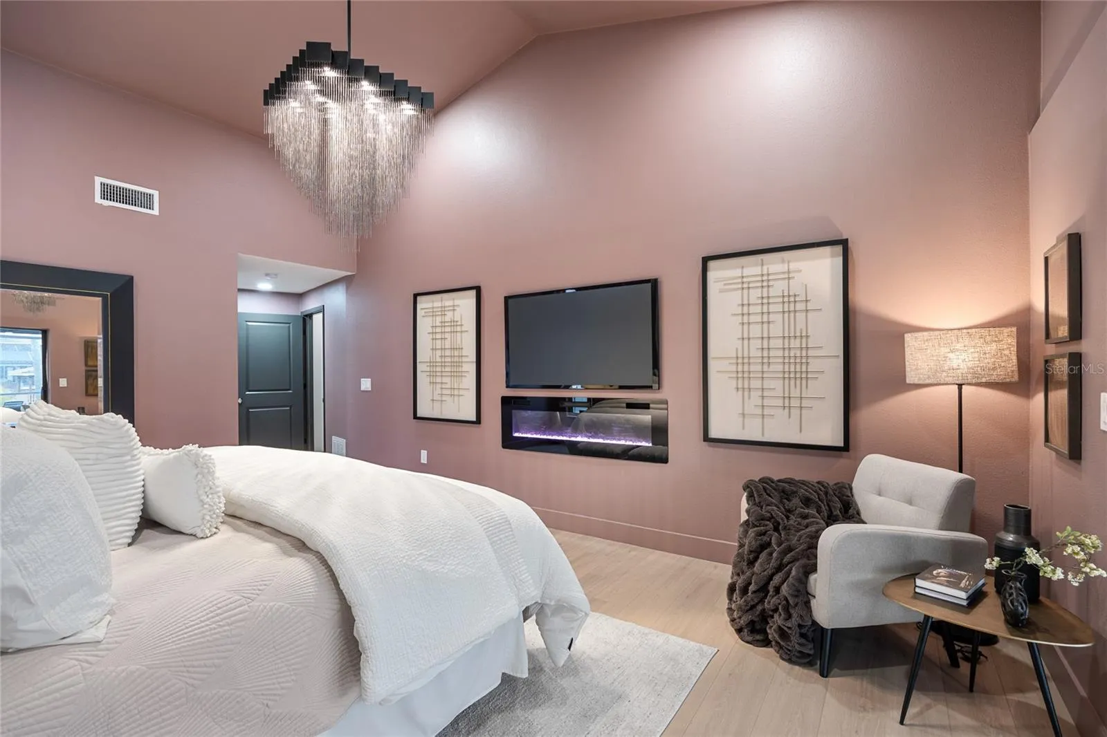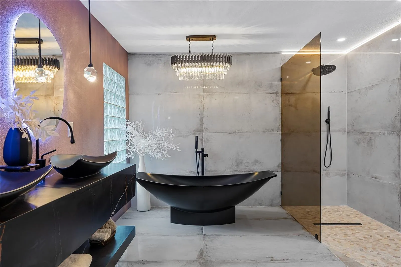 The split-bedroom floor plan ensures ultimate privacy, with the primary suite serving as your personal retreat. Wake up to tranquil views of the pool and canal, and cozy up by the electric fireplace on cooler nights. The en-suite bathroom is pure luxury, featuring a custom vanity, a one-of-a-kind faux hammock resin freestanding tub, and a walk-in shower with a frameless glass enclosure. Every detail, from the fixtures to the color palette, was chosen with care to create a space that feels like a high-end spa.