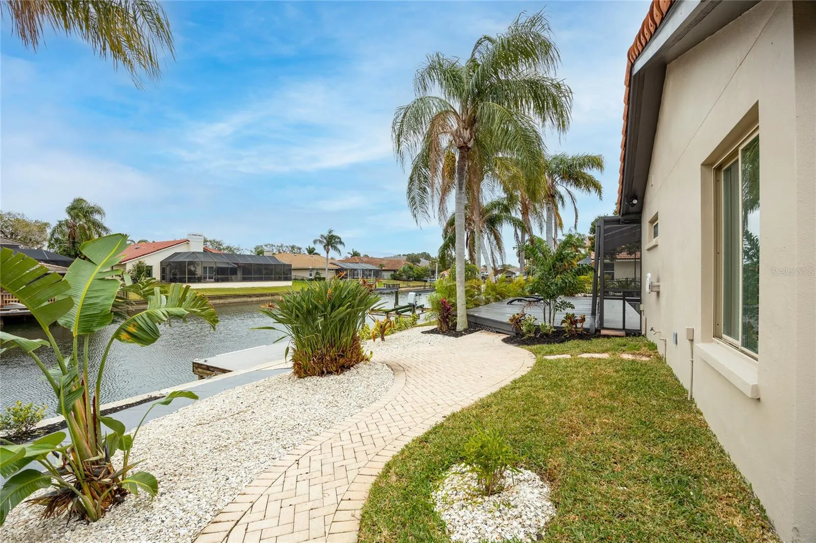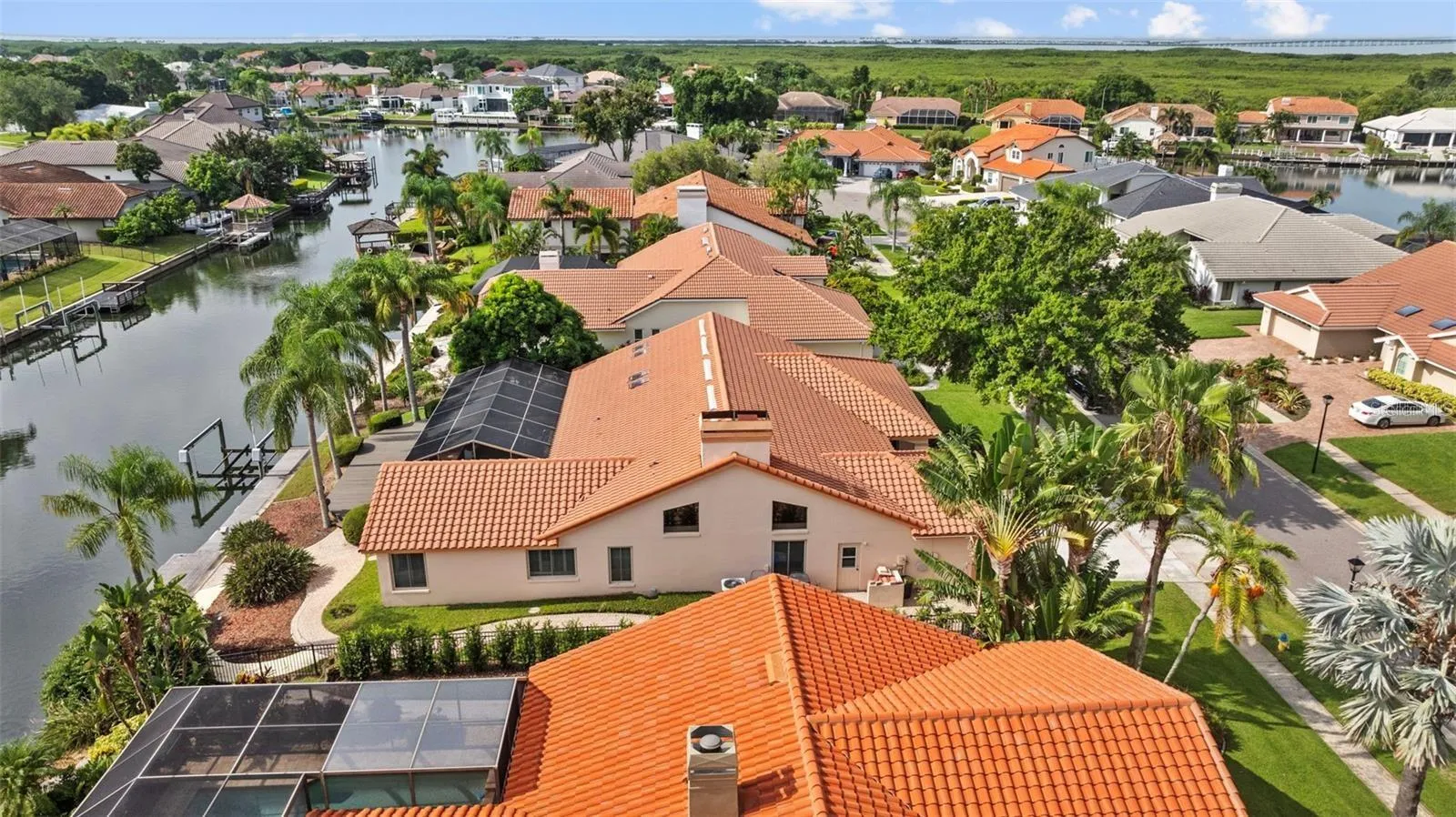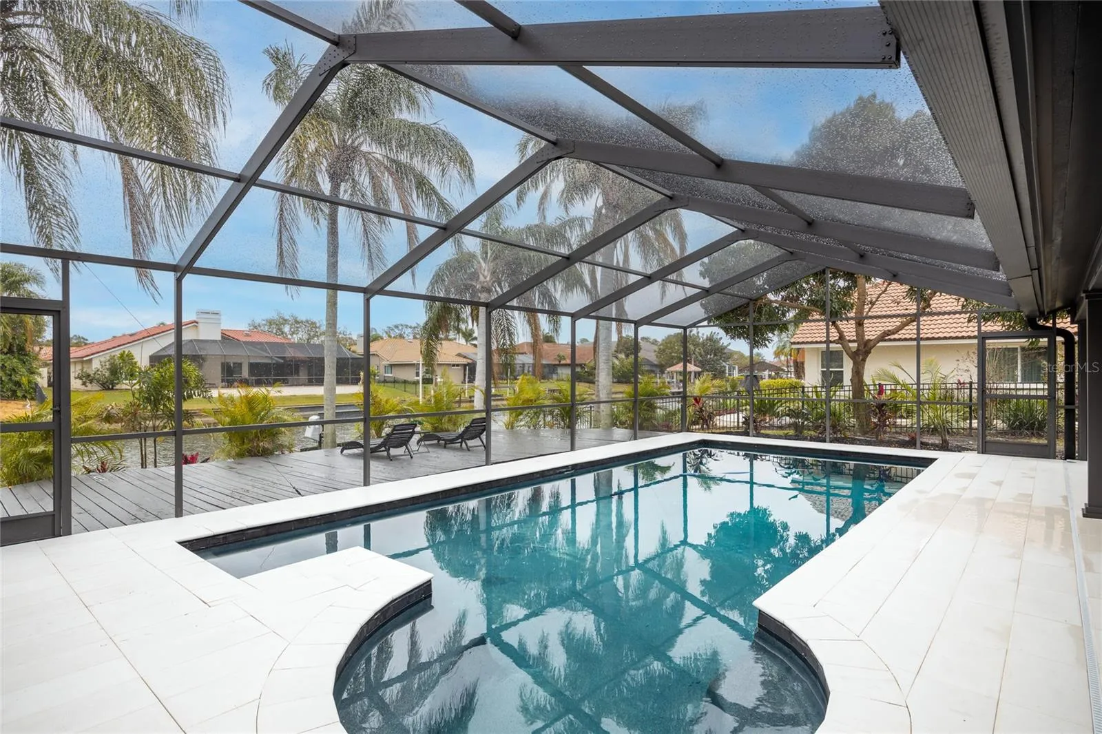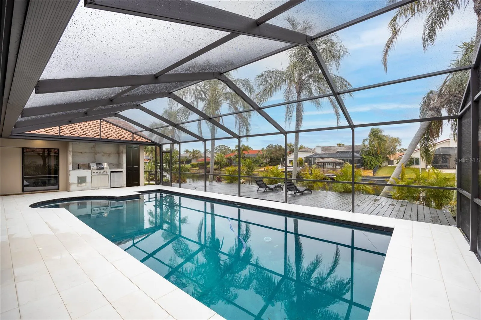 Step outside to discover a backyard that dreams are made of. With over 90 feet of water frontage, a 10,000 pound boat lift, a freshly marcited dark pool surrounded by a brand-new travertine deck, and custom outdoor kitchen this is the ultimate space to relax and entertain. The pool cage ensures year-round comfort, making this the perfect spot for morning coffee or evening cocktails.