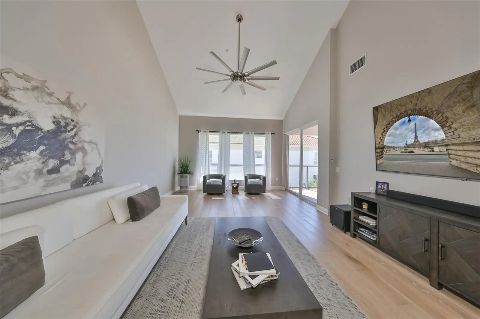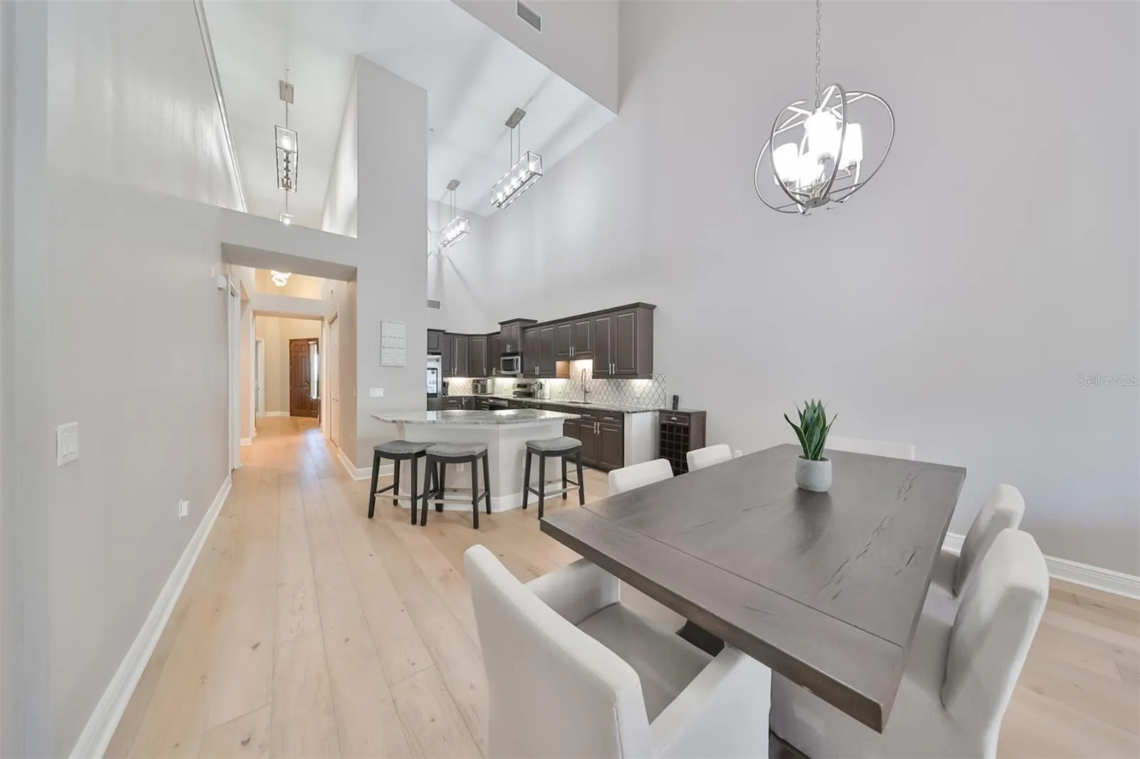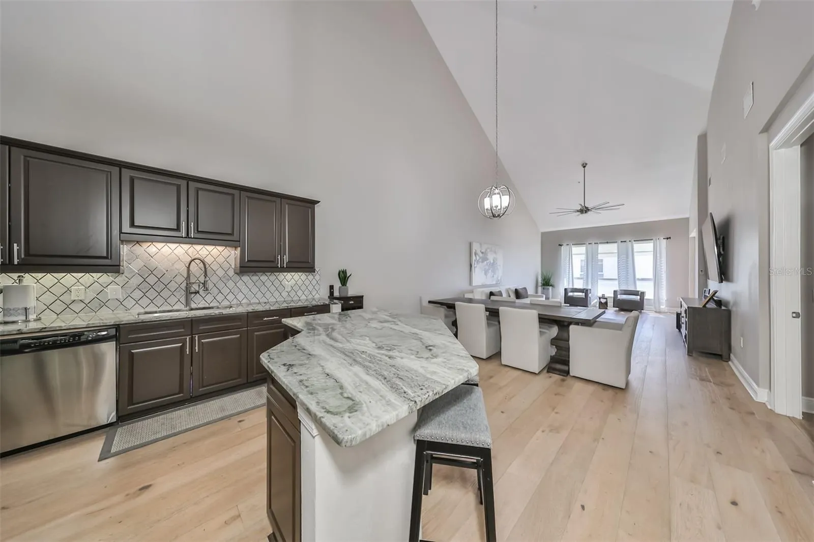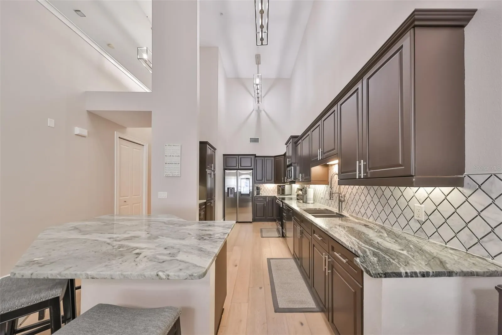 Upon entering the penthouse, you are welcomed by a grand, lighted foyer with 20-foot ceilings and beautiful hardwood floors throughout the common areas. The spacious family and dining room leads to a balcony that offers captivating water views. The newly renovated kitchen boasts Coco Brown cabinetry, granite countertops, a marble backsplash, stainless steel appliances, and an island breakfast bar. The master suite provides direct access to the balcony and includes a custom walk-in closet. The main bathroom features dual sinks, a large shower, and a separate bathtub. On the first floor are two secondary bedrooms, one of which has an ensuite bathroom. As you ascend the wood steps to the penthouse’s second floor, you’ll appreciate the view of the first floor. On the first floor are three secondary bedrooms, one of which has an ensuite bathroom. As you ascend the wooden steps to the penthouse’s second floor, you’ll enjoy an overlooking view of the first floor. The second floor includes a large bonus room and an additional bedroom with a bathroom. Enjoy maintenance-free living with fantastic amenities, including a gym, a large resort-style pool, a jacuzzi, a tiki bar, a clubhouse, and cooking grills.