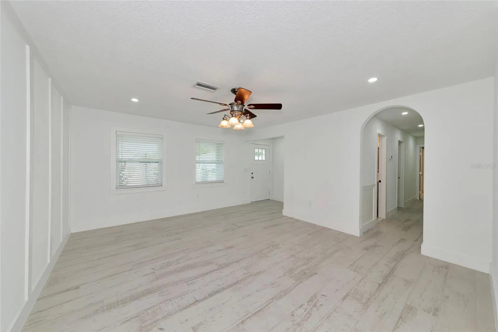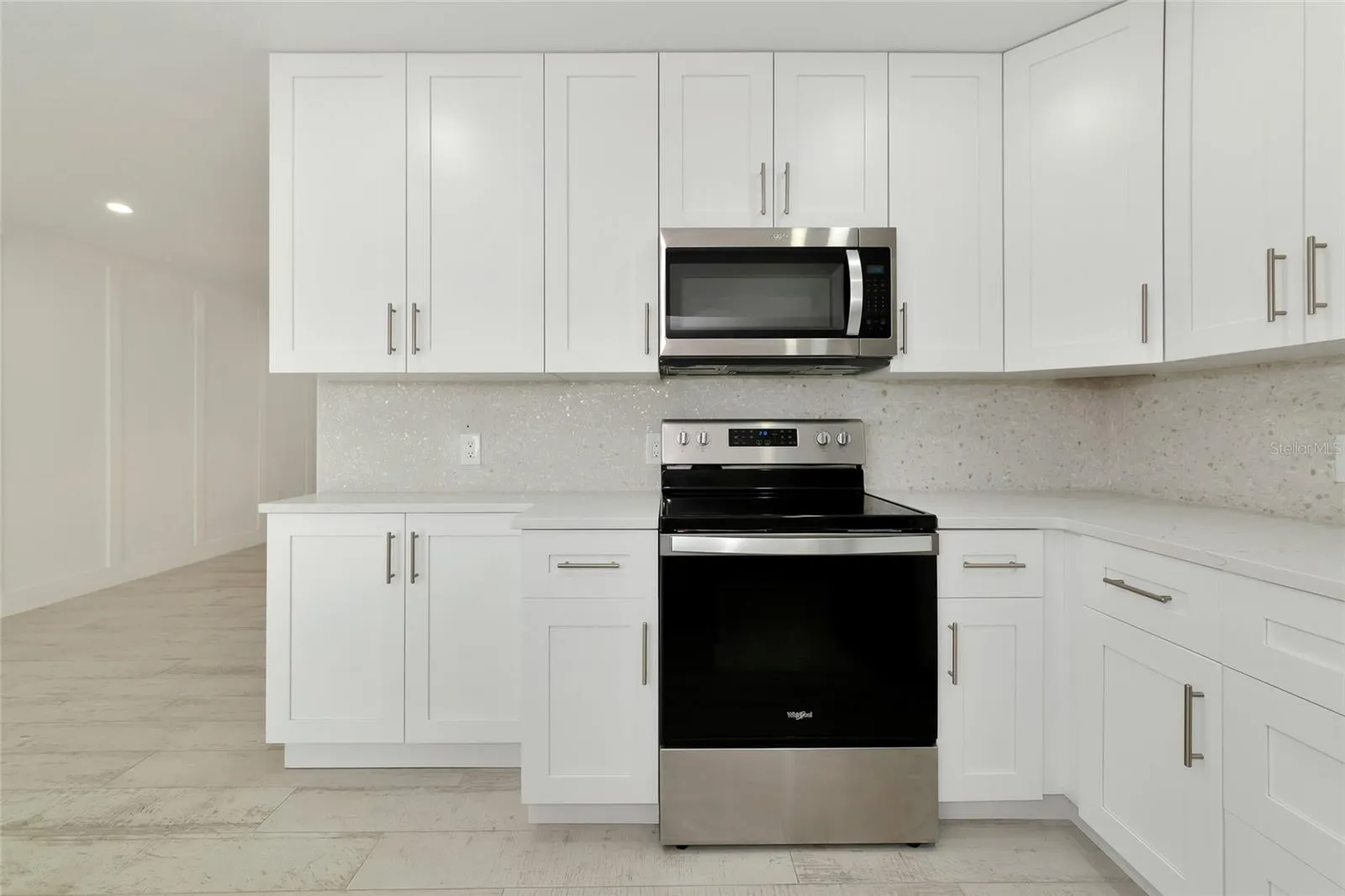 Starting with Luxury Ceramic Wood Plank flooring throughout the home and upgraded ceramic tile in the bathrooms. Next up, the kitchen, a chef’s  dream, featuring quartz countertops, ample counter space, shaker cabinets, and new stainless steel appliances.  A design feature to highlight in the kitchen is the custom Terraneo backsplash that adds a touch of luxury. The eat-in kitchen and dining areas are open and spacious leading into the family room. The large family room is great for entertaining and has an upgraded accent wall that adds charm to enhance the home’s design.