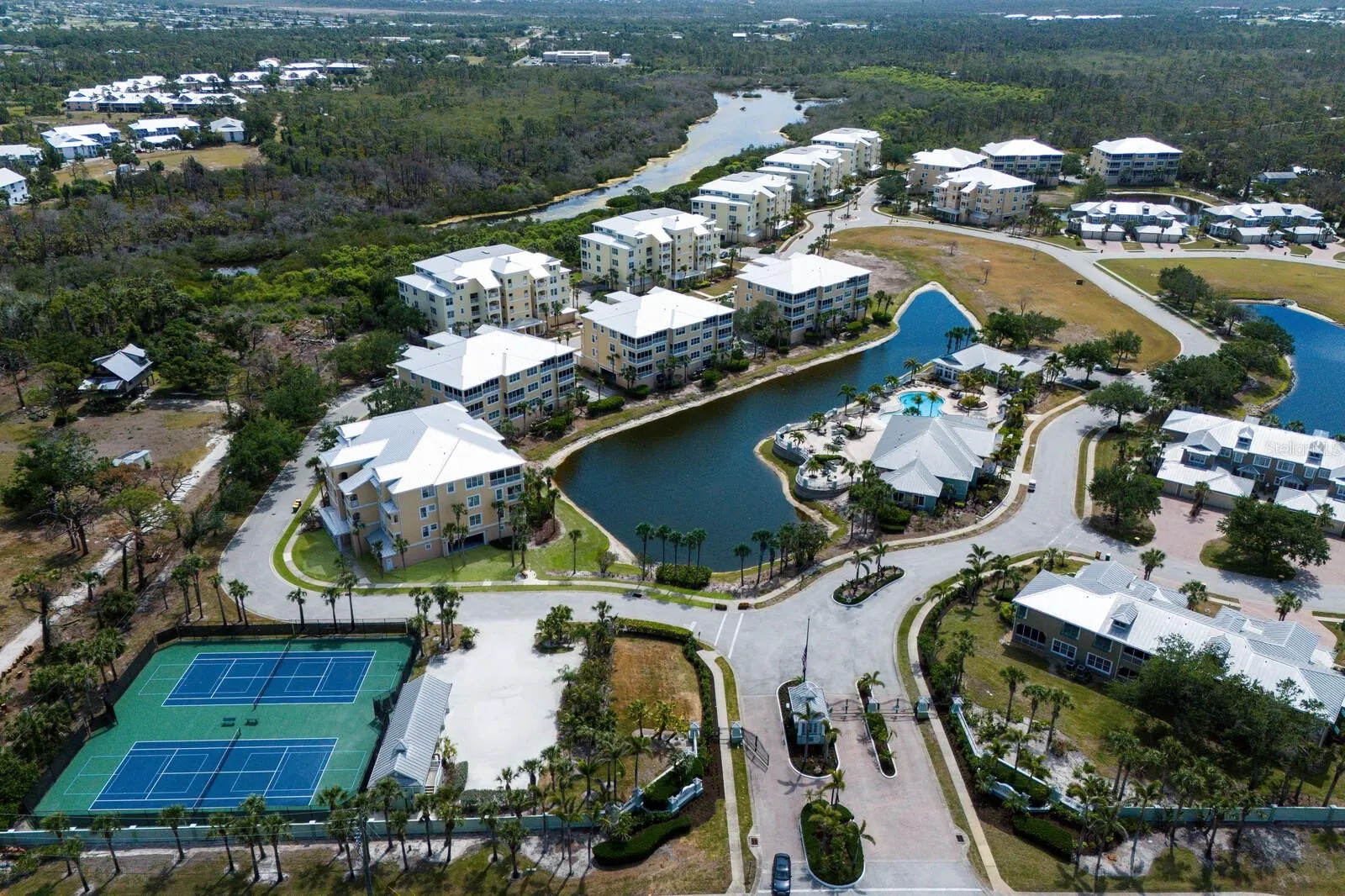 Resort-style amenities include a heated beach-entry pool and spa, a 5,600-square-foot clubhouse with billiards and lounge areas, a well-equipped fitness center, tennis and pickleball courts, a private fishing pier on Lemon Creek, and a kayak launch with scenic nature trails. Under-building parking, a dedicated storage unit, and pet-friendly access to nearby Amberjack Environmental Park make life here even more complete.