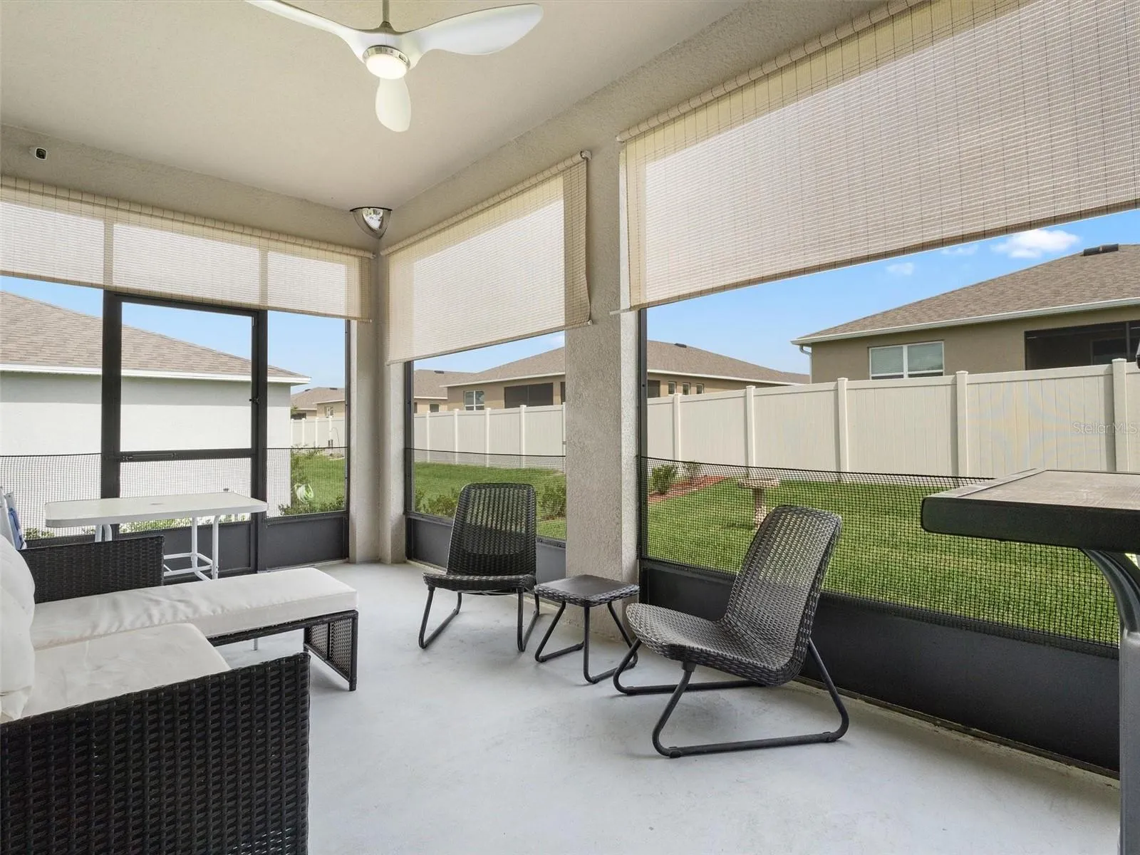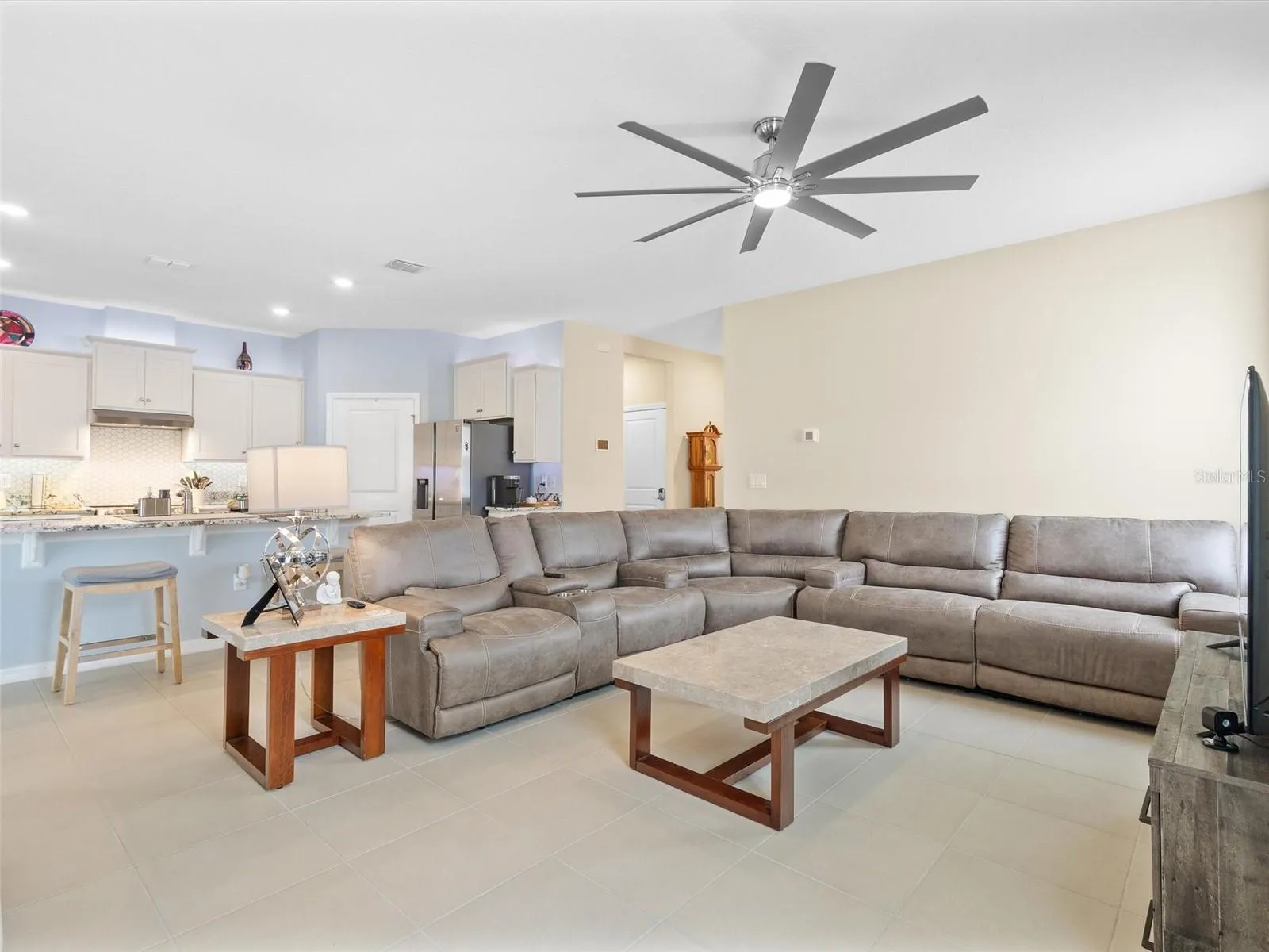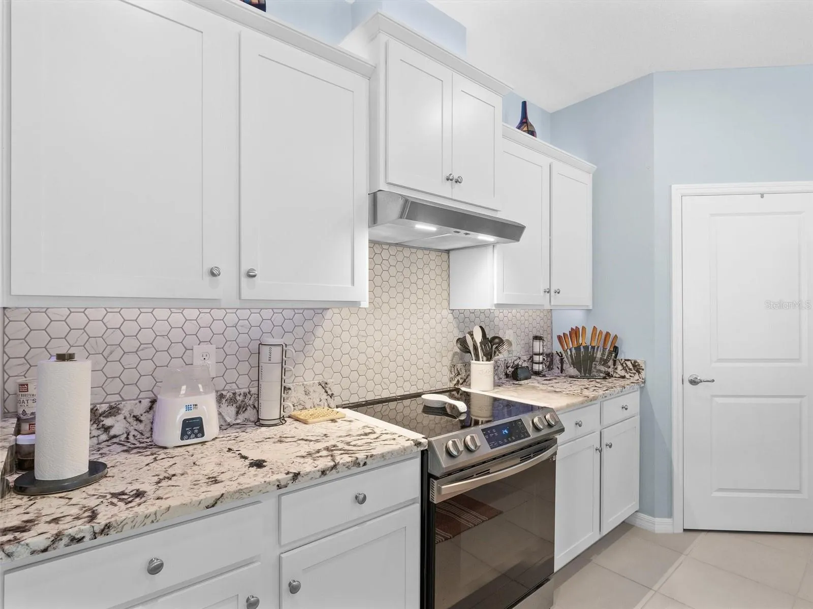 Inside, you’ll find ceramic tile throughout the main living areas, fresh professional paint, custom shelving, and high-end light fixtures and ceiling fans. The open-concept living, dining, and kitchen area is perfect for entertaining, highlighted by a large granite island with plenty of room for seating, meal prep, or serving trays. An array of premium appliances and a spacious walk-in pantry complete the chef’s kitchen. The beautiful tiled backsplash perfectly complements the color and style of the countertops and cabinetry. Sliding glass doors in the dining area lead to a covered and screened lanai—ideal for relaxing and soaking up the Florida sunshine.