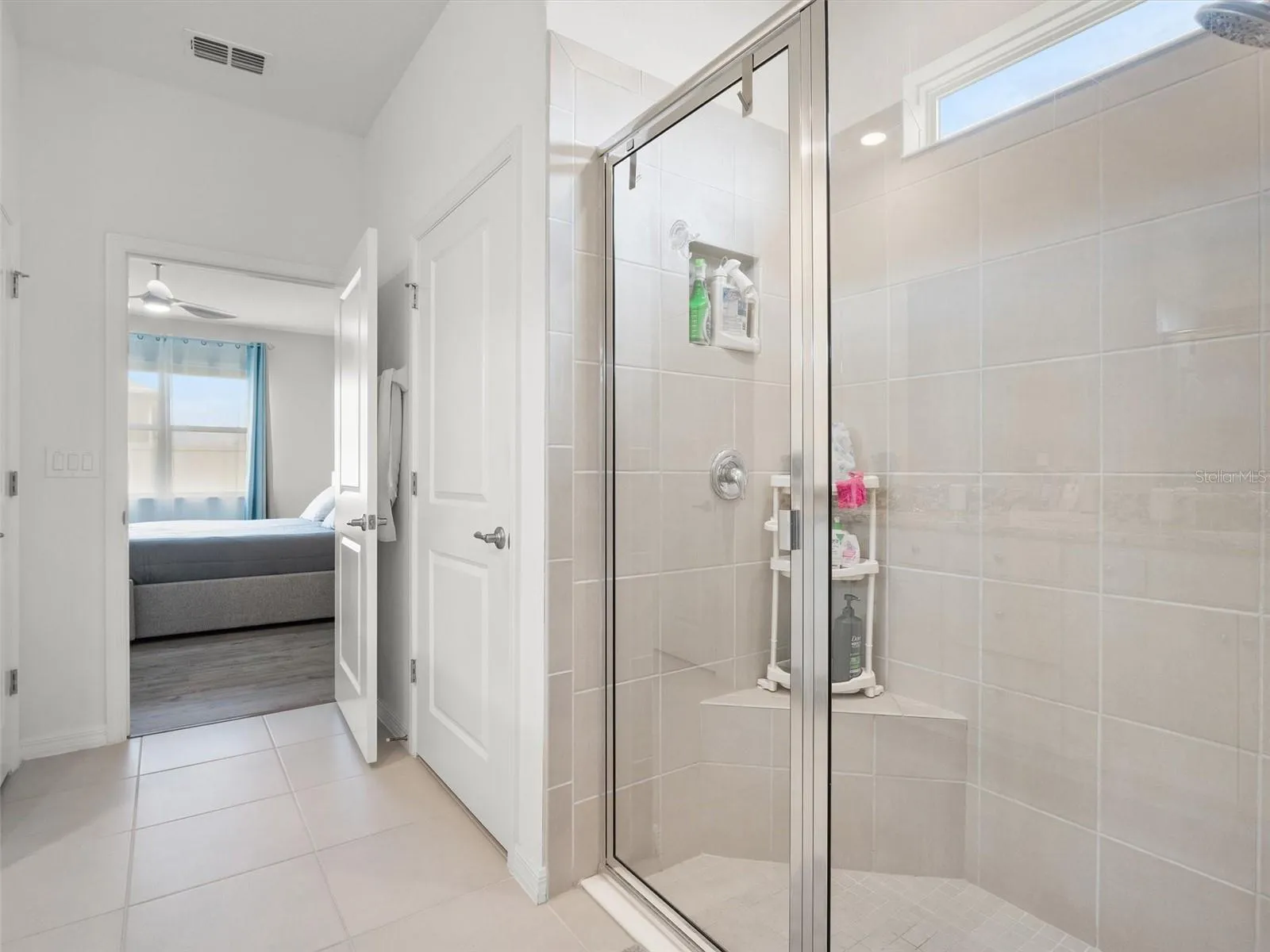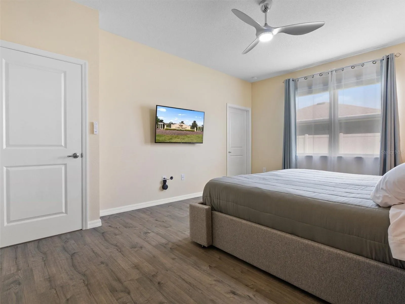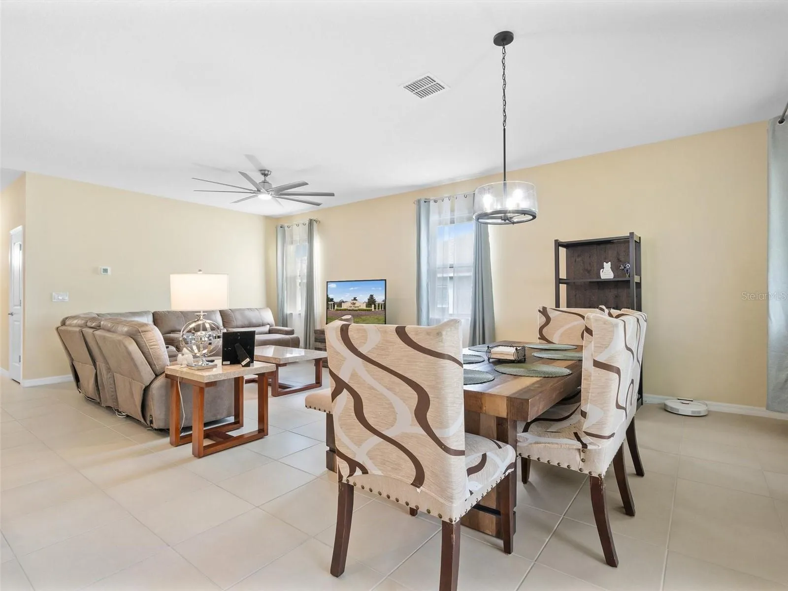 Inside, you’ll find ceramic tile throughout the main living areas, fresh professional paint, custom shelving, and high-end light fixtures and ceiling fans. The open-concept living, dining, and kitchen area is perfect for entertaining, highlighted by a large granite island with plenty of room for seating, meal prep, or serving trays. An array of premium appliances and a spacious walk-in pantry complete the chef’s kitchen. The beautiful tiled backsplash perfectly complements the color and style of the countertops and cabinetry. Sliding glass doors in the dining area lead to a covered and screened lanai—ideal for relaxing and soaking up the Florida sunshine.