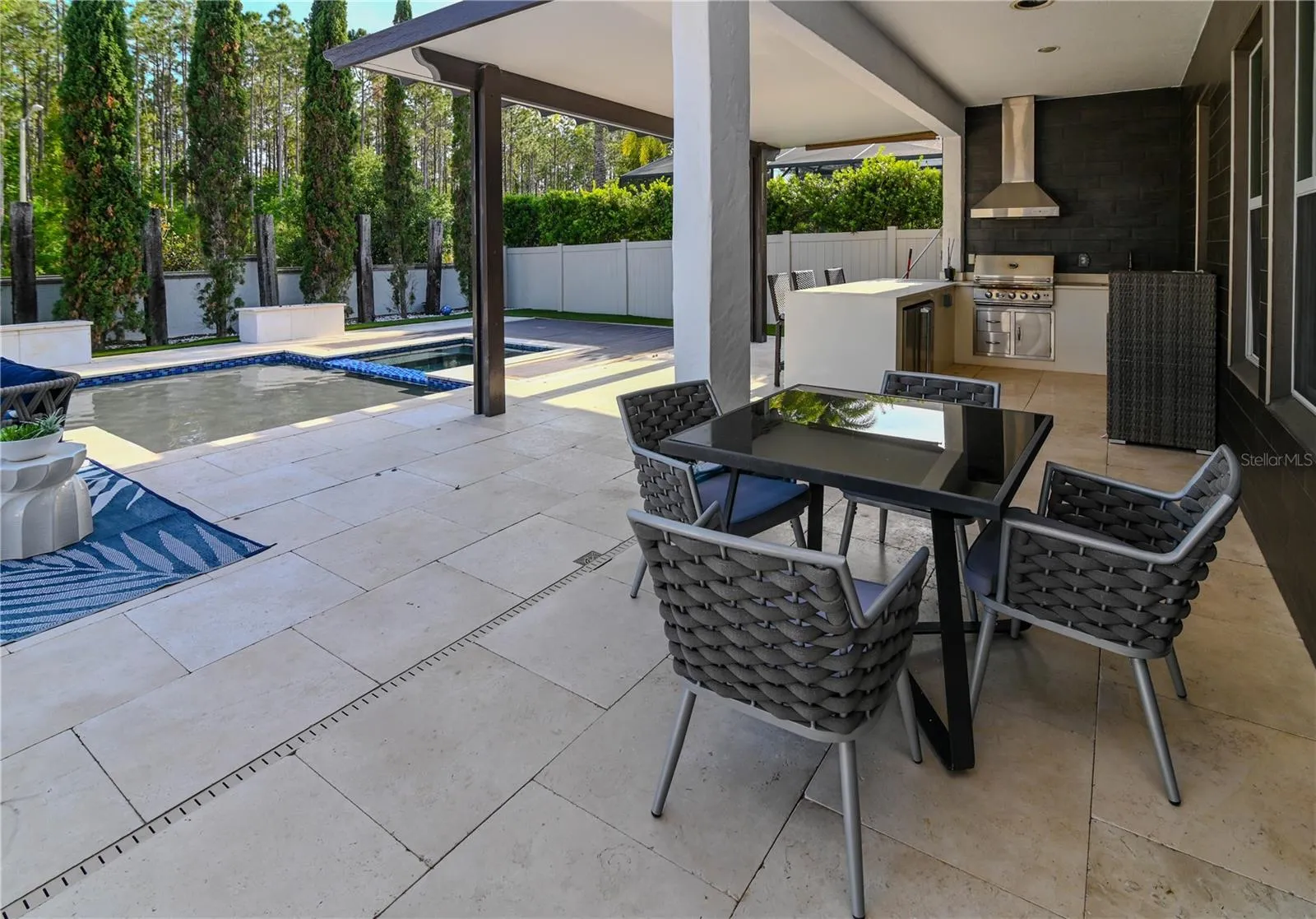 Step outside through the sliding glass doors and discover your own private retreat: a sparkling pool and spa overlooking lush landscaping, an expansive covered patio with travertine flooring, and a summer kitchen ideal for al fresco gatherings.