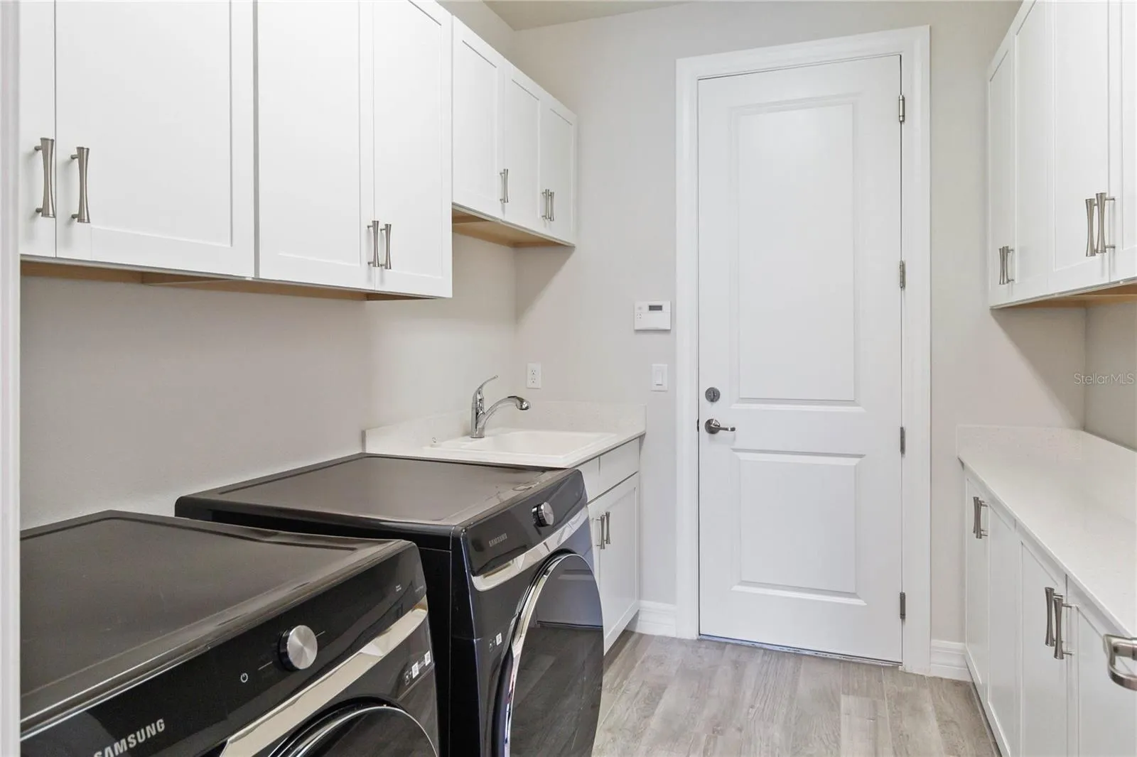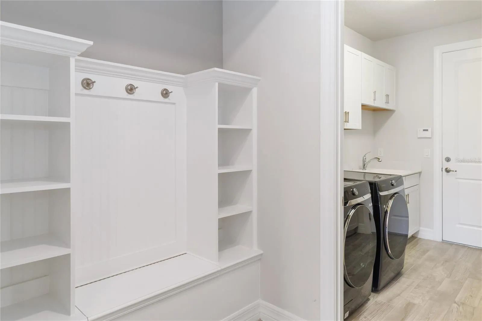 Off the kitchen is a roomy laundry room equipped with ample cabinet space, a built-in area for shoes and jackets, and a laundry sink.