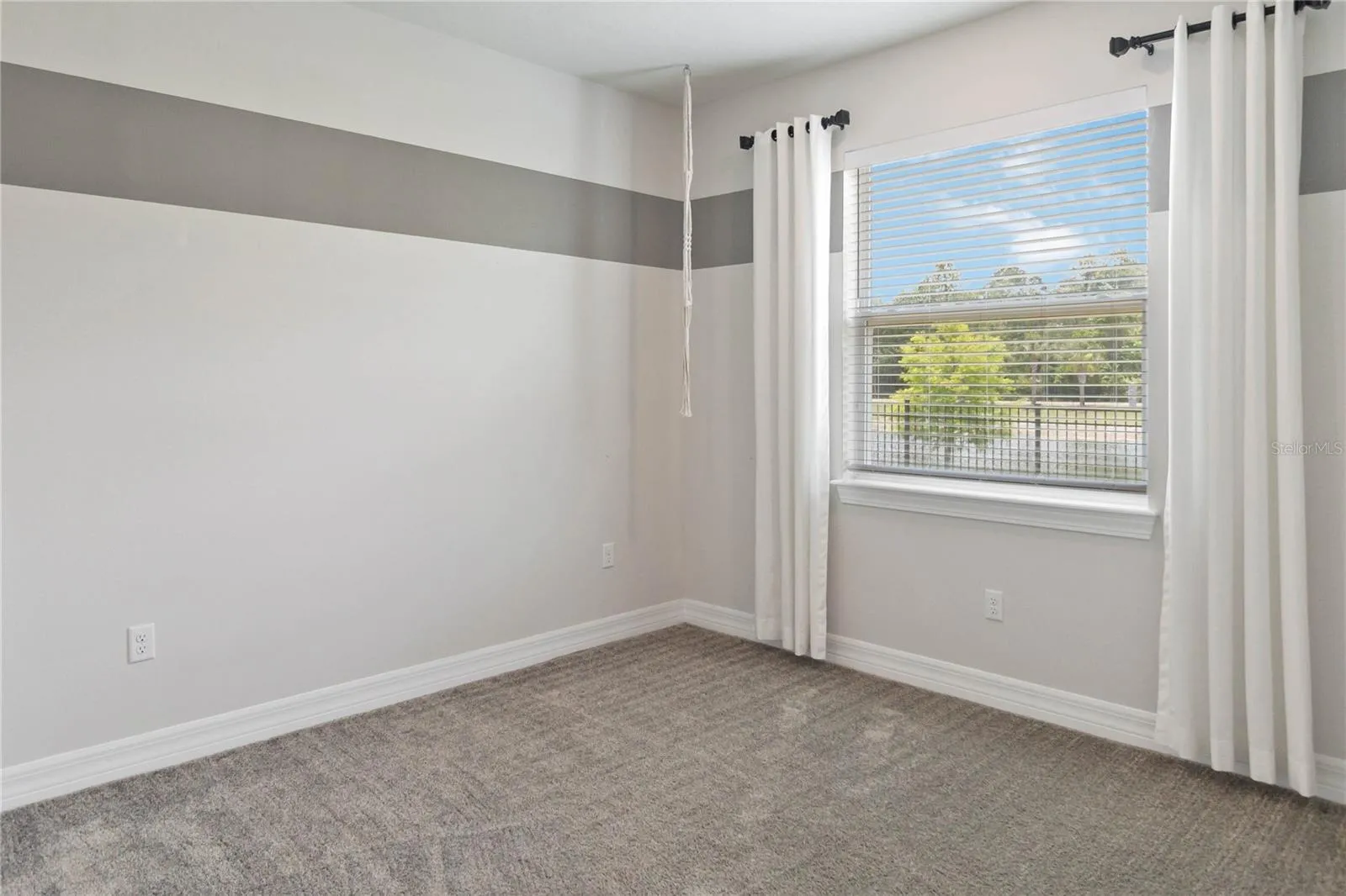 As you move towards the entryway, you’ll discover two additional carpeted bedrooms—one featuring a designer accent wall and a ceiling fan. Between these bedrooms is another full bathroom with dual vanities.