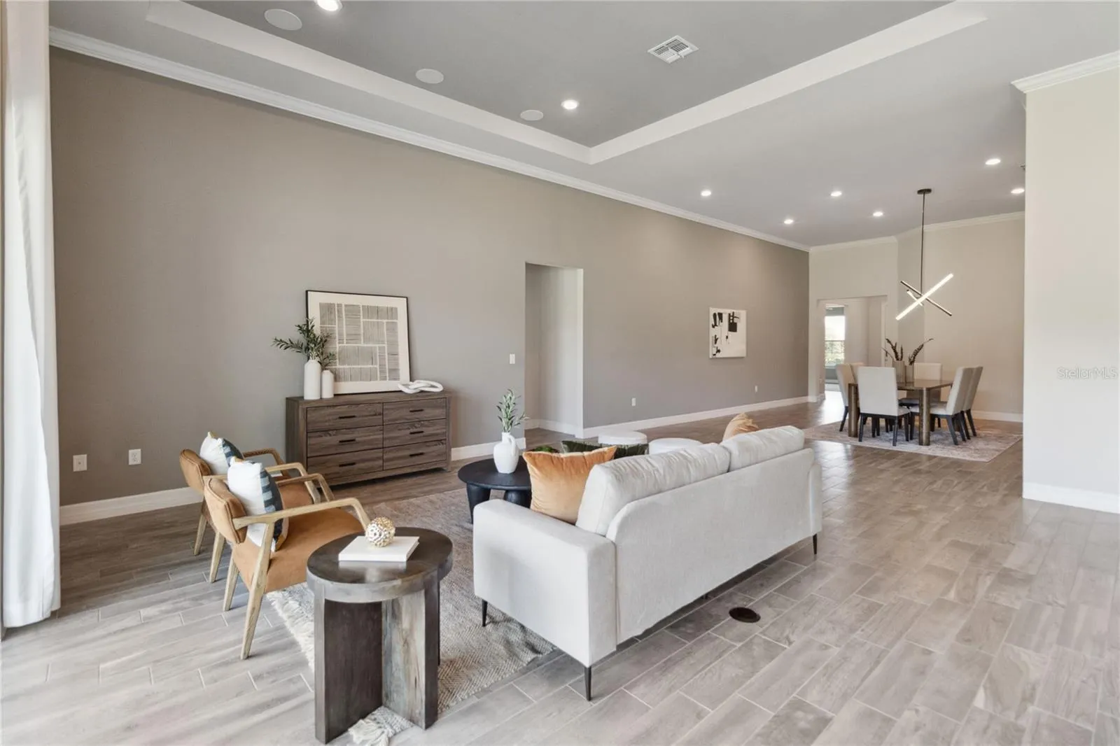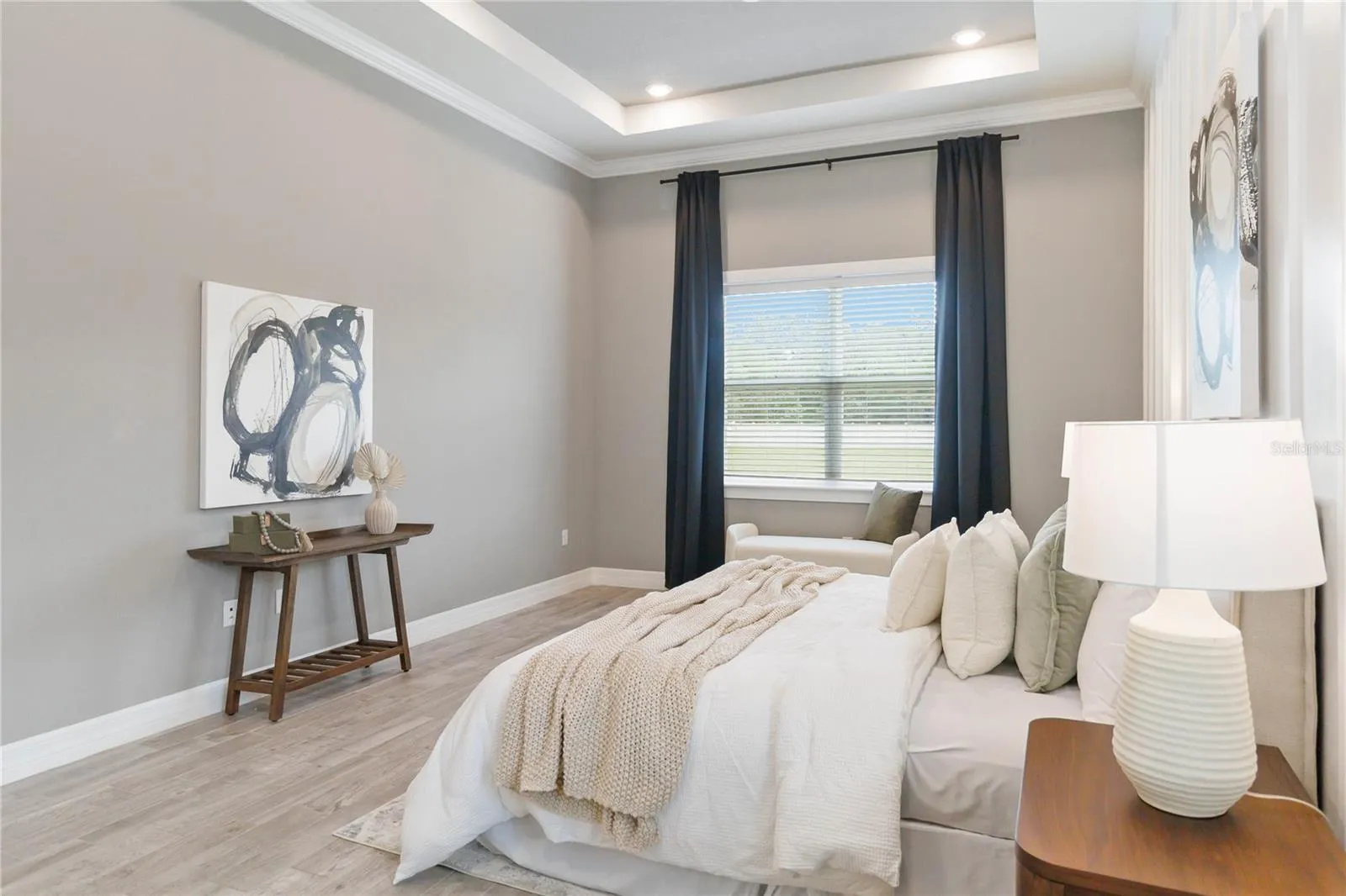 Adjacent to the kitchen is the spacious primary bedroom, showcasing a tray ceiling, recessed lighting, and a beautiful accent wall. The luxurious primary bathroom includes dual vanities and a super shower with both traditional and rain shower heads. You’ll also find an enormous walk-in closet for all your storage needs.
