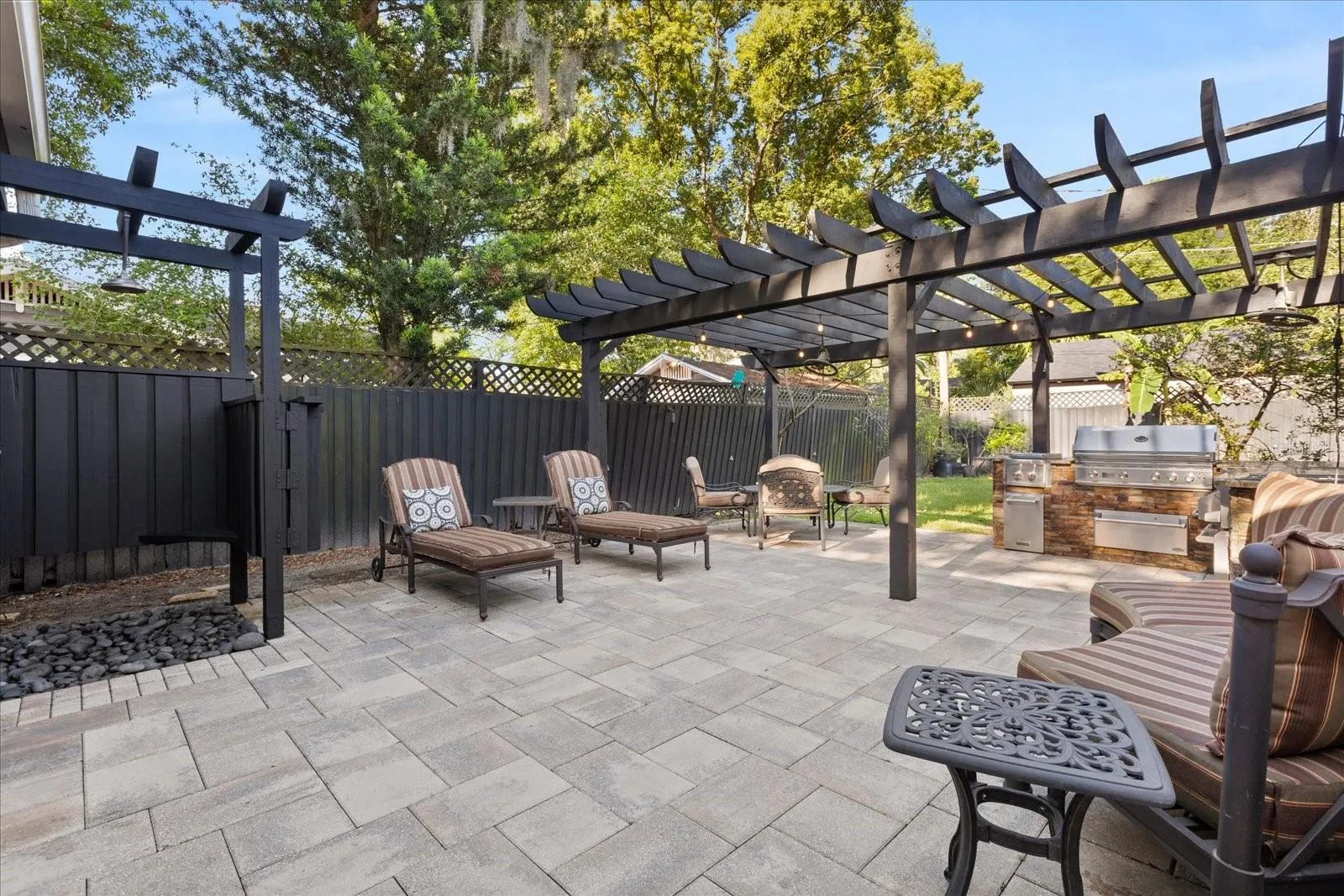 French doors lead from the updated kitchen to a 600 sq ft patio with a pergola, summer kitchen, gas grill, fridge, ice maker, outdoor shower, and more. A second patio, surrounded by raised garden beds and flowers, offers a peaceful spot for morning coffee. Mature avocado, mango, key lime, and mulberry trees enhance the serene setting.