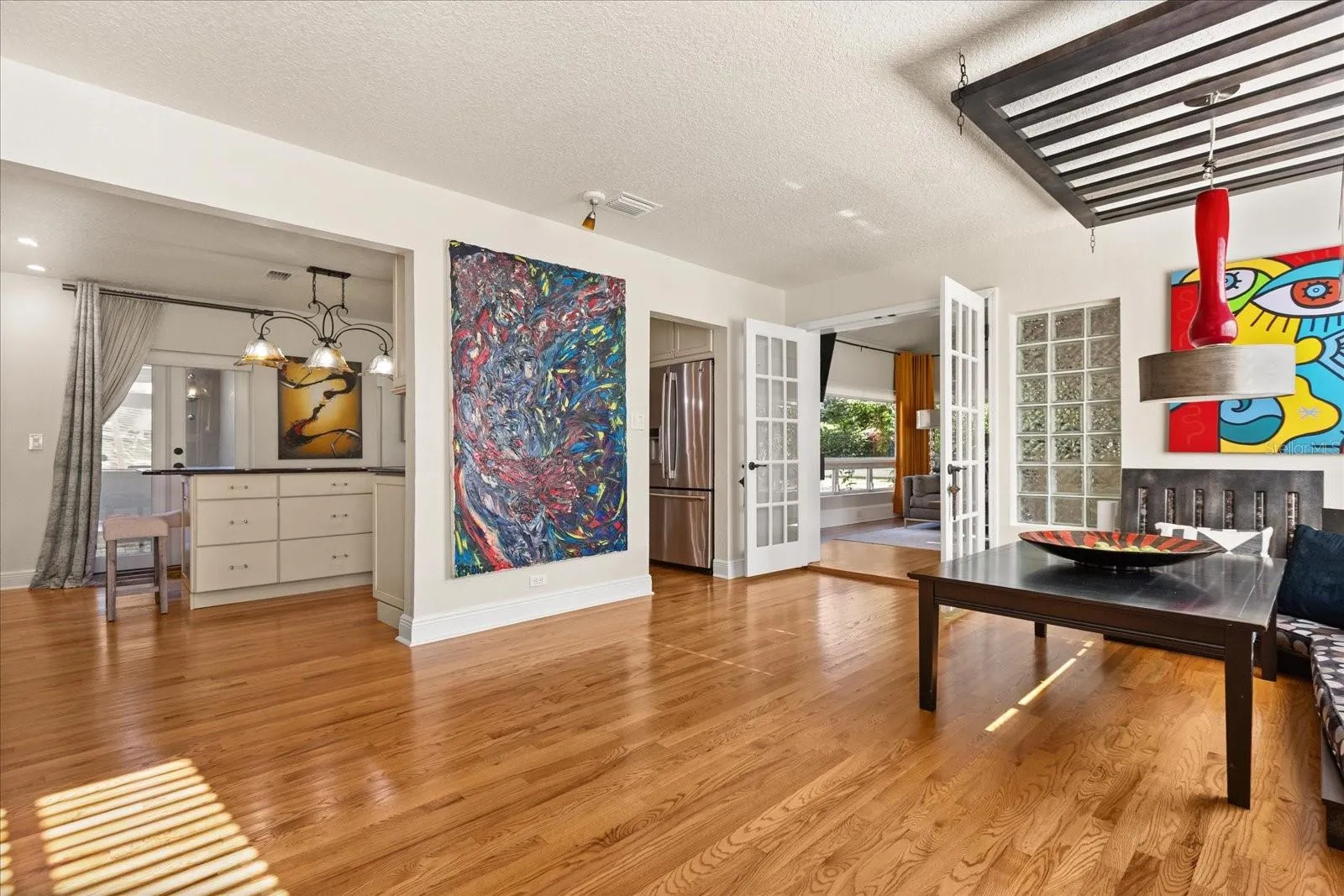 Step inside to find a bright living area with oversized windows, clean lines, curated materials, and gorgeous hardwood floors throughout. The spacious living and dining rooms flow seamlessly – ideal for both entertaining and everyday living. With three bedrooms and two baths, each space is designed for comfort. The updated primary suite includes a new bathroom and large walk-in custom closet. An oversized garage adds rare, extra storage. A smart split plan, motorized shades, and numerous upgrades make this home truly move-in ready.