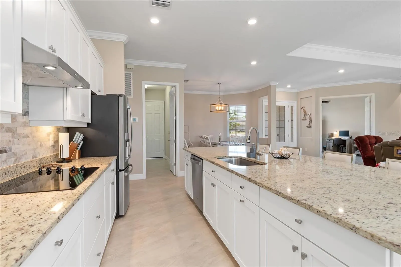 Located on an oversized lot in a small cul-de-sac with paver driveway and parking for 6+ cars, this property is centrally located in a small, friendly, gated community with only 165 homes. When you enter the front door, you immediately see the views over the pool and canal from the family room with high, trey ceiling and sliders which open to the lanai and pool area. The well-equipped kitchen has a huge granite island, designer backsplash, double oven/microwave, stainless appliances, plenty of cabinets/storage and opens to the formal dining and dinette areas, as well as overlooking the family room for maximum enjoyment of cooking or entertaining at home. This is a very popular and flexible floorplan, with split bedrooms and a separate DEN/OFFICE with double doors, perfect for hobby, library, at-home working or could even be used as a 4th bedroom.