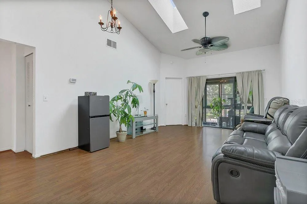 This 2 bedroom, 2 bathroom, second story condo is located in the Club Villas at Wimbledon Park. The living room is spacious with beautiful, vaulted ceilings, skylights, and wood laminate flooring. The sliding glass doors lead to a window covered, enclosed lanai – wonderful for lounging and a great mood-booster with the natural sunlight! The kitchen and laundry are side by side, perfect for multitasking. Both bedrooms feature en-suit bathrooms. The master bathroom has a private toilet closet with shower. The master bedroom also showcases a luxurious walk-in closet. The community has a fitness center, pool, tennis courts, and clubhouse. Come view this gem! It could be your next home.