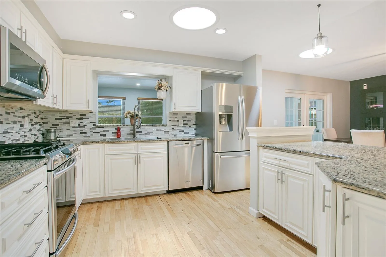 As you step inside, you’ll notice the fresh, clean feel of brand-new paint inside and out, making the entire home bright and welcoming. The kitchen is a true standout with stunning granite countertops, crisp white cabinetry, and sleek stainless steel appliances — perfect for whipping up your favorite meals. Gorgeous hardwood floors flow through the kitchen and dining room, creating a warm and inviting atmosphere. The rest of the home features easy-to-maintain tile and laminate flooring, so cleaning is a breeze.