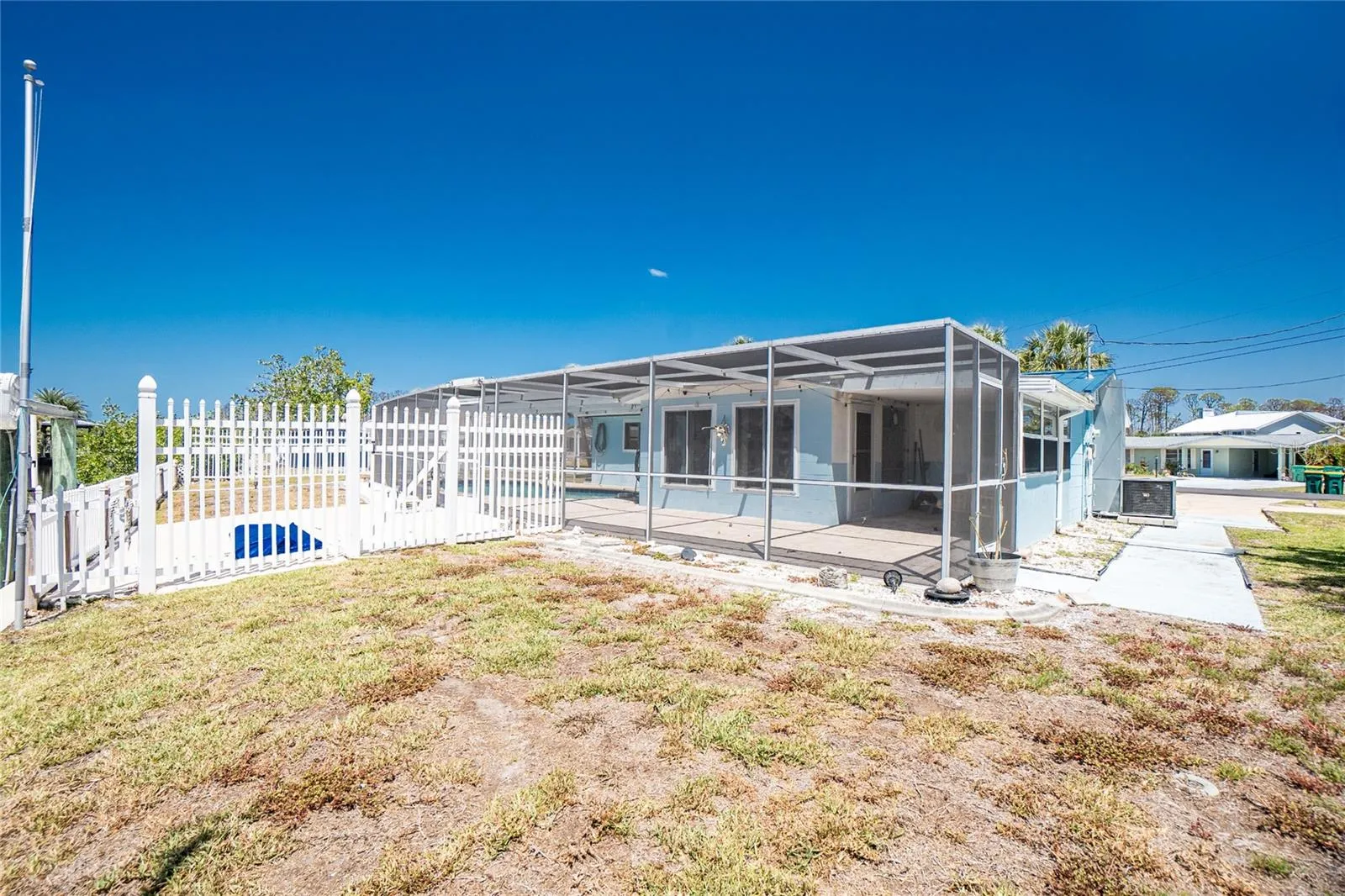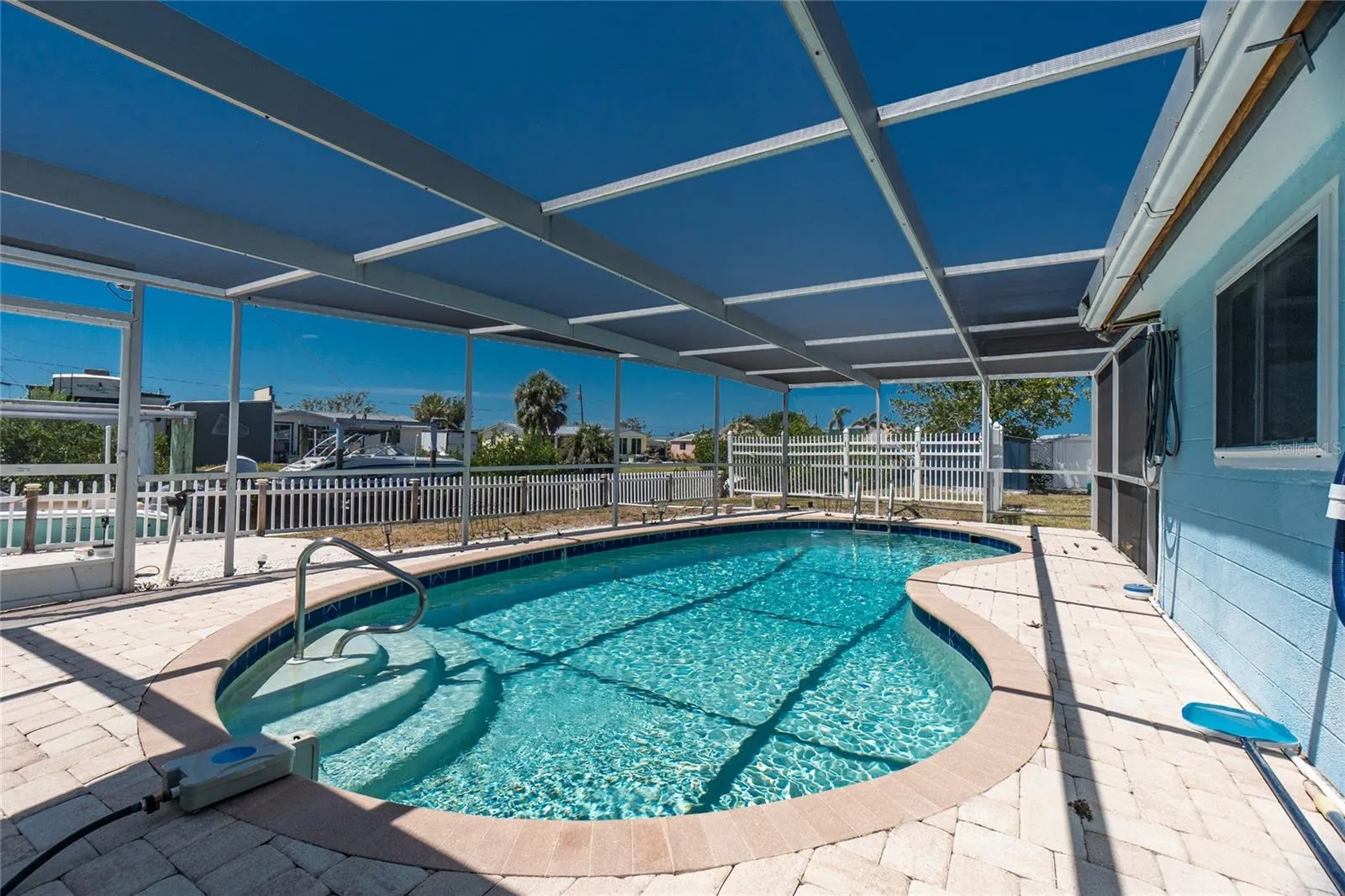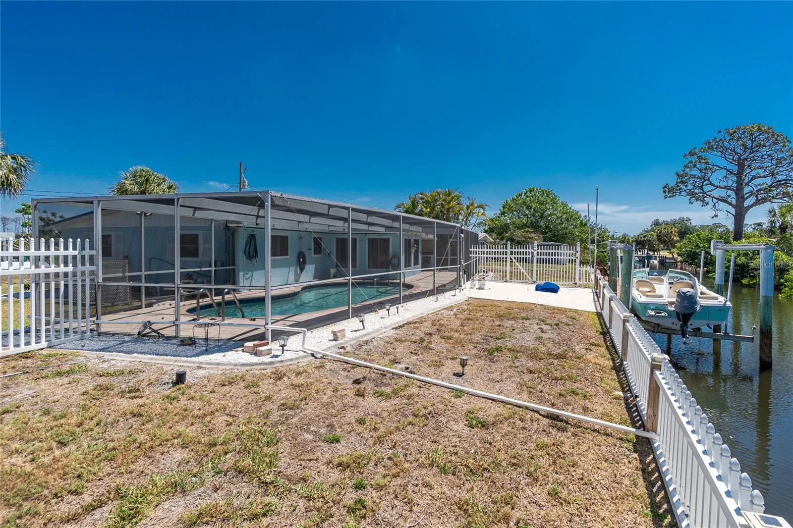 SUCH A GREAT DEAL FOR THIS WATERFRONT HOME! Two bridges to Lemon Bay, with 138′ of seawall and a BOAT LIFT! This home is situated on an oversized lot at the end of a cul de sac street. Large family room with tiled flooring as you enter – perfect for TV night or hanging out with friends and family! Living room has a ceiling fan and tiled flooring also. The GALLEY kitchen has been renovated with new cabinetry and granite countertops. Each of the bedrooms has new laminate flooring, wall closets and ceiling fan. The Bathroom has also been updated with tiled walls, updated vanity and shower with door. The laundry room is large enough that a 2nd bath could be added – in fact, there is already a toilet in place. Built in cabinetry provides additional storage and the utility sink can be used to wash the dog! The large formal dining room has tiled flooring and door to the lanai. This floor plan is very flexible – all of the main living areas could be used however best suits you! The screened lanai has paver flooring and provides a place for an evening meal in the shade. Caged pool has paver decking and is the perfect place to float around and absorb some Vitamin D! ROOF WAS REPLACED IN 2021 WITH A METAL ROOF AND AC IN 2022! Jump in your boat – just waiting for you on the lift – next to your dock and concrete seawall – for a short ride out to gorgeous area beaches! Englewood is known for it’s small town feel, yet plenty of great restaurants, shopping, Popular Thursday Farmer’s Market, numerous golf courses and so much more! Don’t wait to see this one!