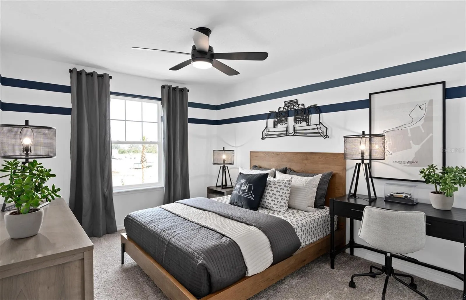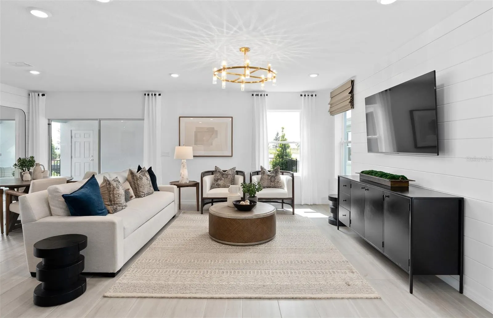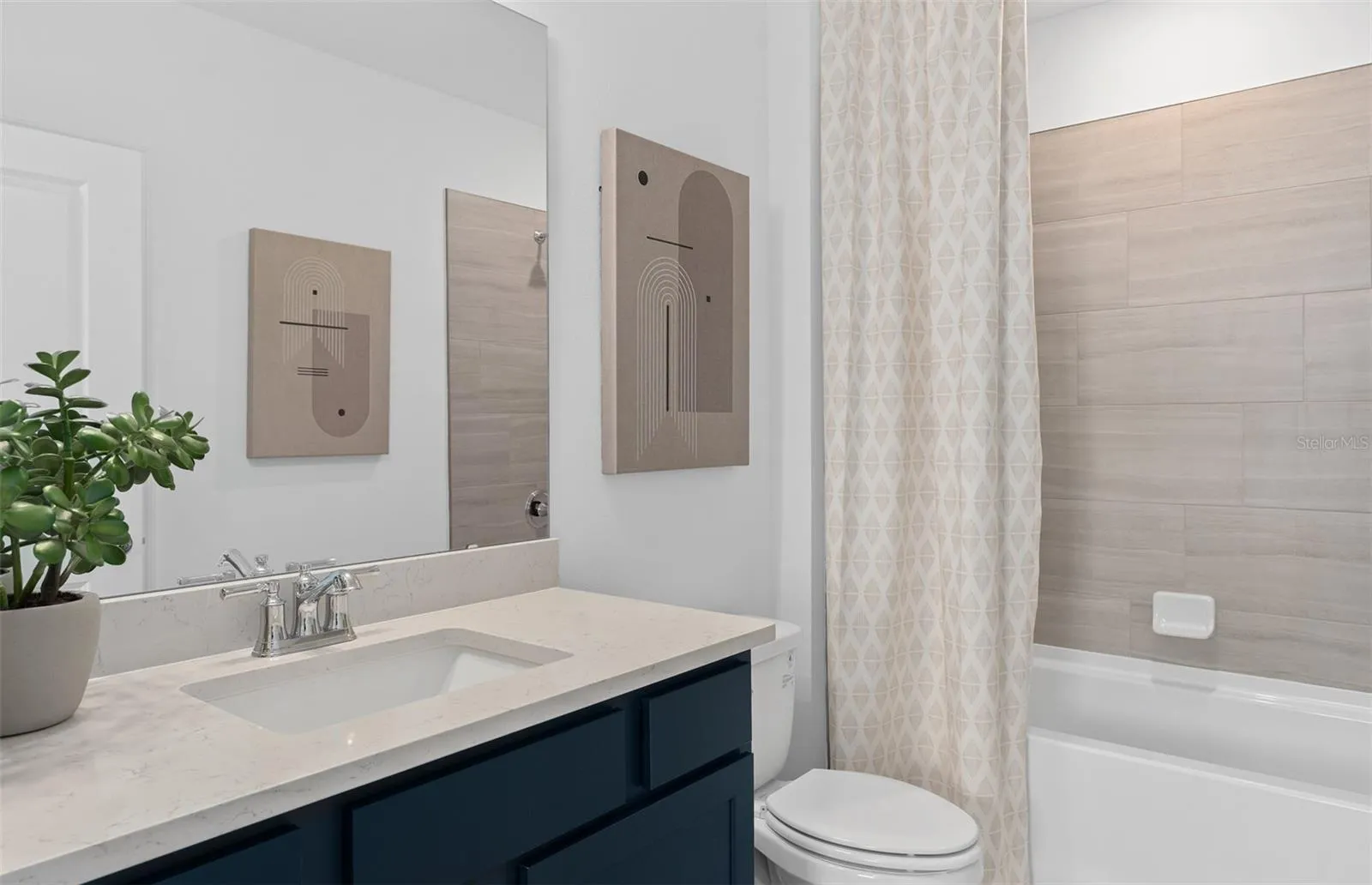 Welcome to the luxurious Mabel bungalow by Pulte, a stunning new construction that perfectly blends modern design with everyday convenience. This Farmhouse-inspired home offers 4 bedrooms, 3 bathrooms, a loft, a covered lanai, and a 2-car rear-load garage. Upon entry, you’ll be greeted by a grand foyer with ample storage, including two closets, leading into an open-concept living space. A private hallway off the foyer offers a guest bedroom and full bath, creating an ideal space for visitors. The heart of the home unfolds into a spacious kitchen, café, and gathering room, with seamless access to the covered lanai—ideal for indoor-outdoor living. The chef’s kitchen is a true standout, featuring a large center island, corner walk-in pantry, and Whirlpool stainless steel appliances, including a vented microwave and a refrigerator. Elegant Tilden Stone Gray cabinetry, a decorative tile backsplash, and Lyra quartz countertops complete the space, ensuring both style and functionality. Upstairs, the luxurious owner’s suite provides the perfect retreat, tucked at the rear of the home for ultimate privacy. The spa-inspired en suite bathroom boasts a glass-enclosed shower, a quartz-topped dual vanity, and a spacious walk-in closet, creating a sanctuary of relaxation. Two additional bedrooms, sharing their own dedicated hallway, offer added privacy and comfort, while a full bathroom serves the space. The second floor also includes two linen closets, a laundry room, and a large loft area—ideal for flexible living. Thoughtful luxury touches throughout the home include Wood-Look Luxury Vinyl flooring on the first floor (except the first-floor bedroom, which features plush, stain-resistant Shaw brand carpeting and the bathroom which is tile), carpeting on the staircase and second-floor bedrooms, tile in the bathrooms and laundry room, and pre-wiring for pendant lighting. Smart technology features like a smart thermostat, smart doorbell, and additional LED downlights ensure this home is as advanced as it is beautiful. For added convenience from day one, this home comes complete with 2″ faux wood blinds, as well as a washer and dryer! This exquisite home offers the ultimate in luxury, convenience, and modern design—everything you need to live and relax in style.