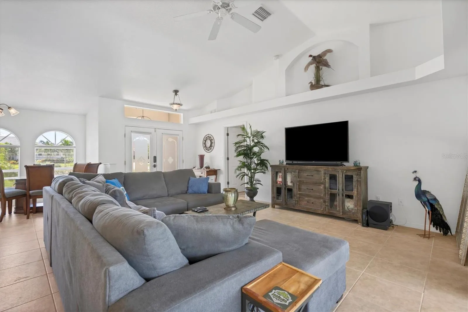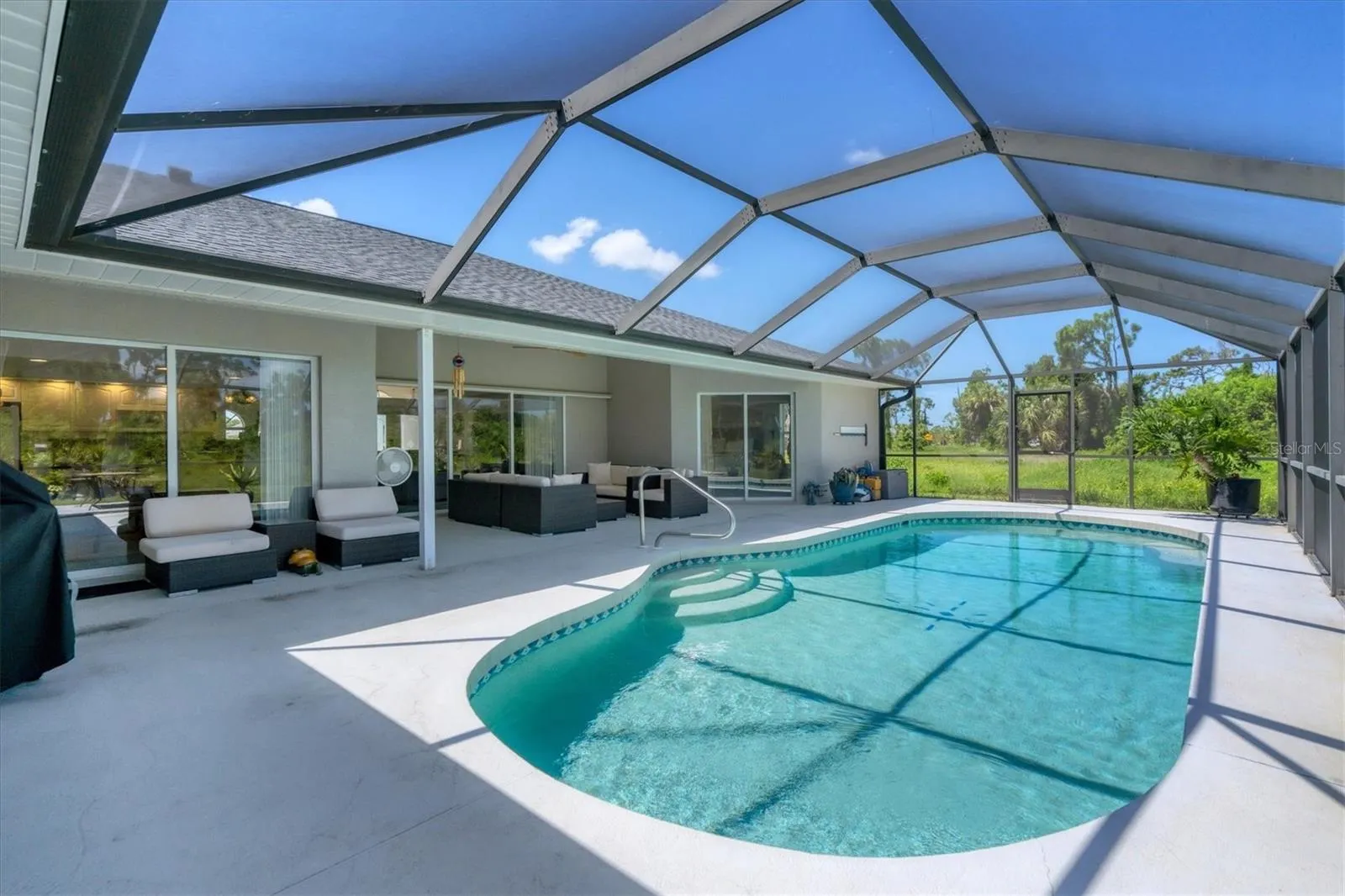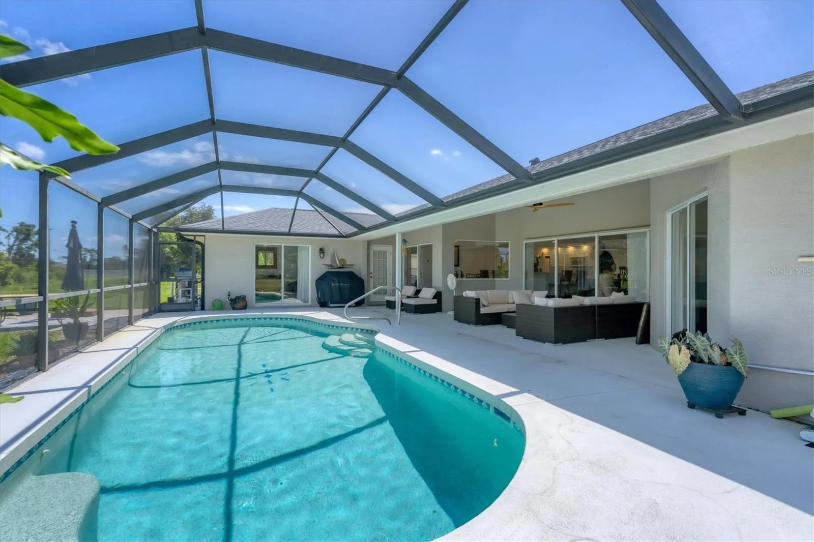 Welcome to your bright and cheerful new home, perfectly nestled in the peaceful and highly sought-after golf community of Rotonda West?just minutes from the pristine Gulf beaches! Step inside and be immediately drawn to the spacious screened lanai and sparkling inground pool, beautifully visible through triple sliding glass doors. Soaring vaulted ceilings and abundant natural light from large windows and sliders create an airy, seamless indoor-outdoor lifestyle. Located on an oversized lot backing up to a tranquil greenbelt, this Boardwalk-built Cassandra model offers the ultimate in privacy and serene nature views. Inside, the home is tastefully appointed with neutral décor and tile flooring throughout the main living areas. The open-concept layout includes a large great room, an elegant dining area, and a bright breakfast nook with an aquarium window overlooking the pool. The all-white kitchen offers plenty of cabinetry and is adjacent to a generous laundry room with ample storage. The primary suite is a true retreat with private access to the lanai, dual walk-in closets, double vanities, and a walk-in shower. Two additional bedrooms and a full bath offer space for guests or a home office. Enjoy evenings on the extended outdoor patio by the firepit, or make use of the convenient fish-cleaning/potting station. The oversized three-car garage provides plenty of room for vehicles, storage, and hobbies.