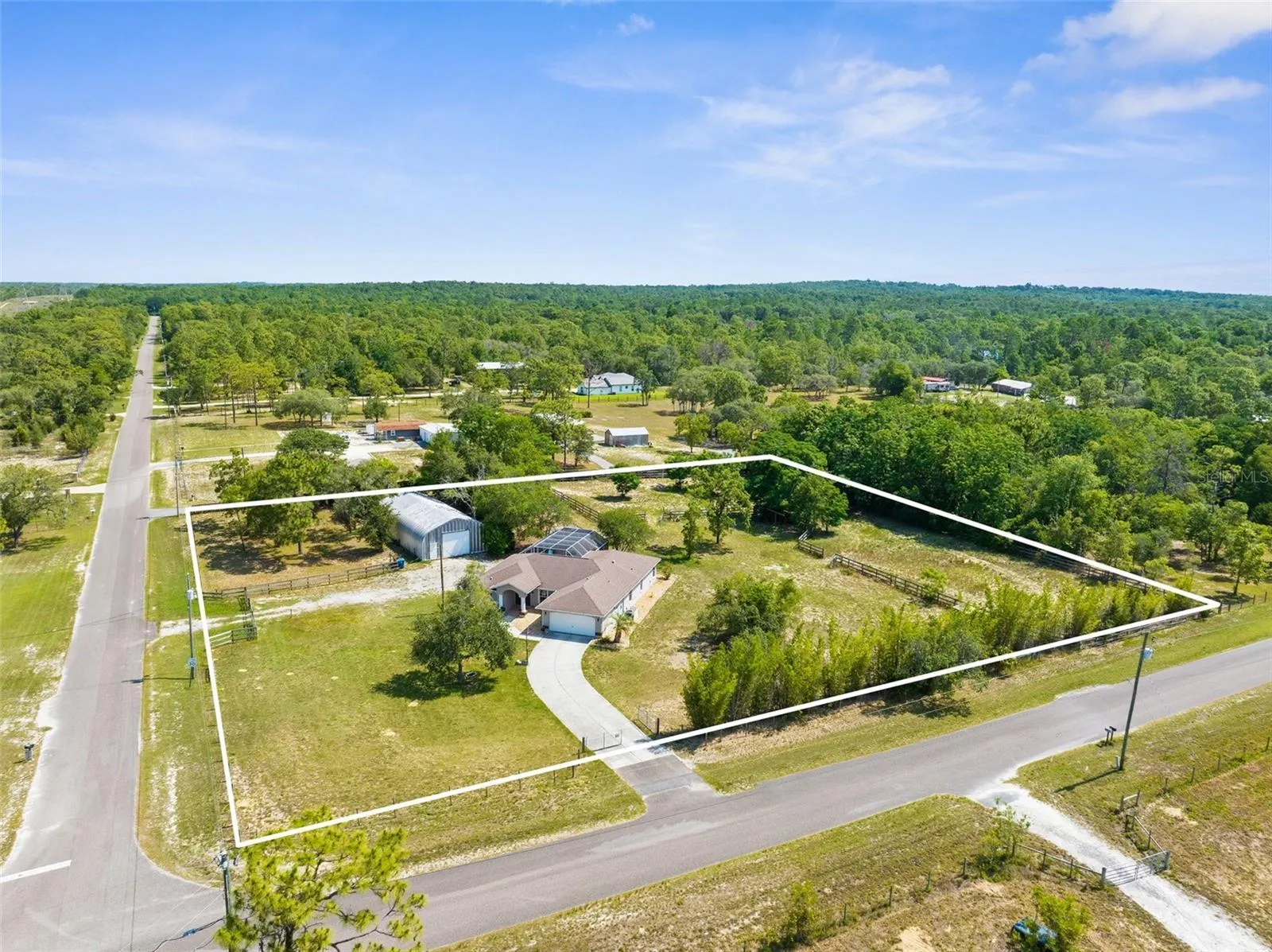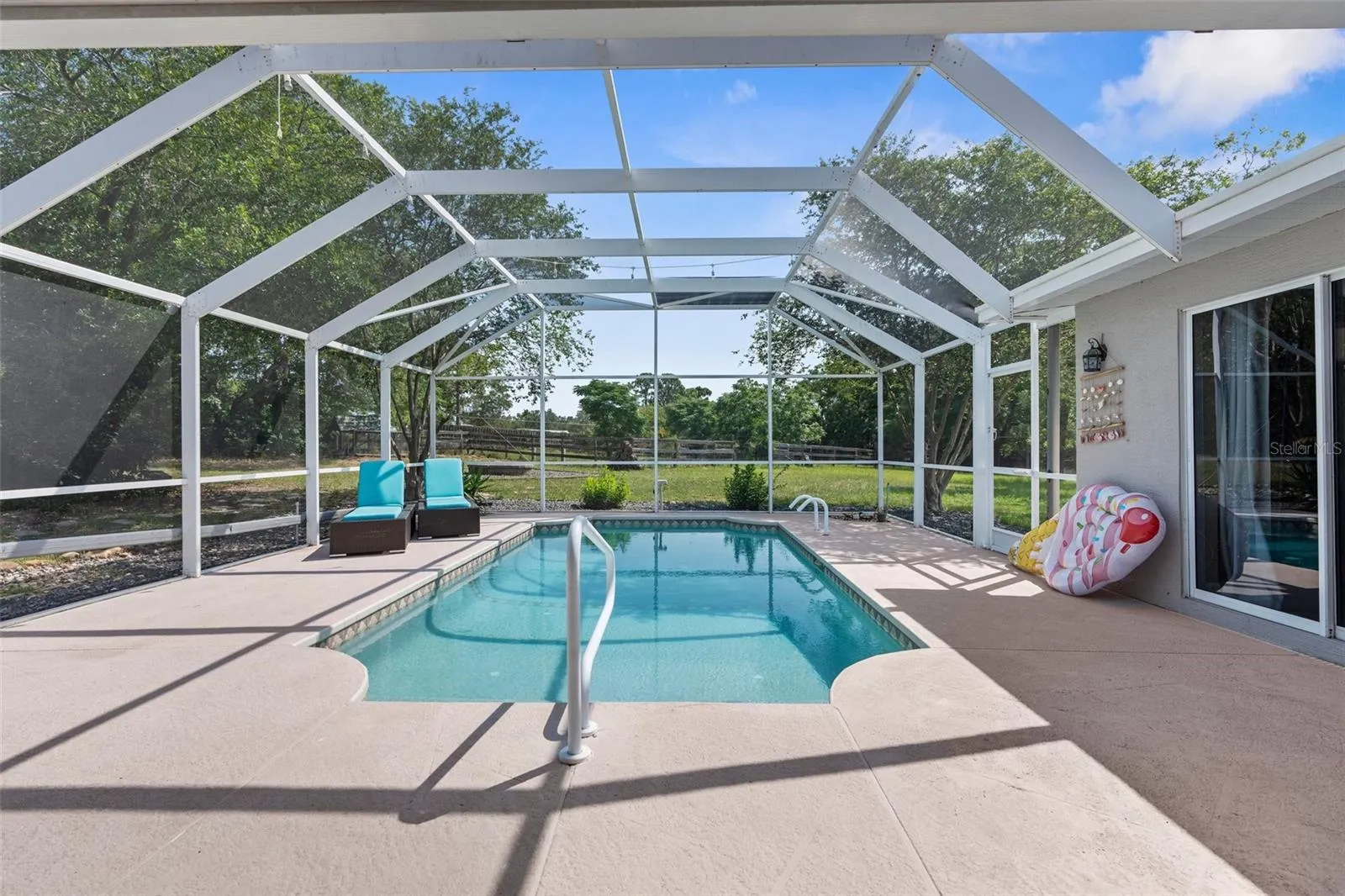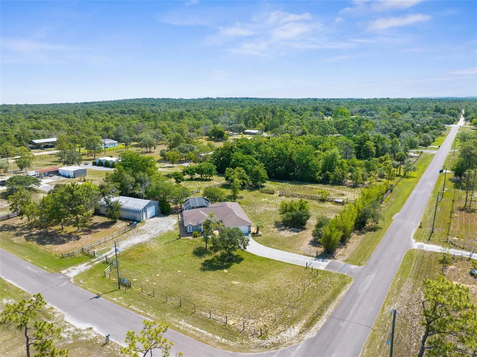 Country Living Meets Versatile Potential on 2 Acres! Welcome to your dream homestead—a move-in-ready 3-bedroom, 2-bathroom pool home with a 2-car garage and a massive steel-structure workshop/barn designed for flexibility, business, and animals alike! Step inside to a bright, open great room with a flex space ideal for dining or entertaining. Bathed in natural light from expansive windows and sliding glass doors, the home offers seamless indoor-outdoor living—perfect for entertaining. Whether you’re prepping in the kitchen or relaxing inside, the open sightlines to the pool all around the home lets you stay effortlessly connected to the fun outside. Enjoy granite countertops, black stainless steel appliances, and a vibe that blends comfort with functionality. Step out back and you’ll find your own personal paradise: a screen-enclosed in-ground pool with a 2025 brand-new pump, a lanai, and covered patio space, and fire pit—perfect for relaxing or hosting guests. Beyond the home the property continues to impress — The 30×60 steel building is a game-changer built on a concrete slab with electric, water, internet, and phone hookups. The front area is fully insulated with it’s own A/C unit, floor-to-ceiling storage, and a large exhaust fan—perfect for a business, workshop, or creative space. Divided by a non-structural steel wall, the back half boasts 2 large horse stalls with rubber-matted flooring throughout, with room to expand into more stalls or animal pens. Zoned Agricultural, this High-and-Dry 2-acre parcel features multiple pastures, a ready-to-go chicken coop, and farm fencing—ideal for hobby farming, side hustles, or full-on homesteading. Whether you’re starting a small business, raising animals, or simply craving space and serenity, this home has everything you need to live, work, and thrive all in one place. With so much country charm, modern upgrades, and unlimited opportunity all wrapped into one incredible property — Don’t miss your chance to step into the lifestyle you’ve been waiting for—schedule your showing today.