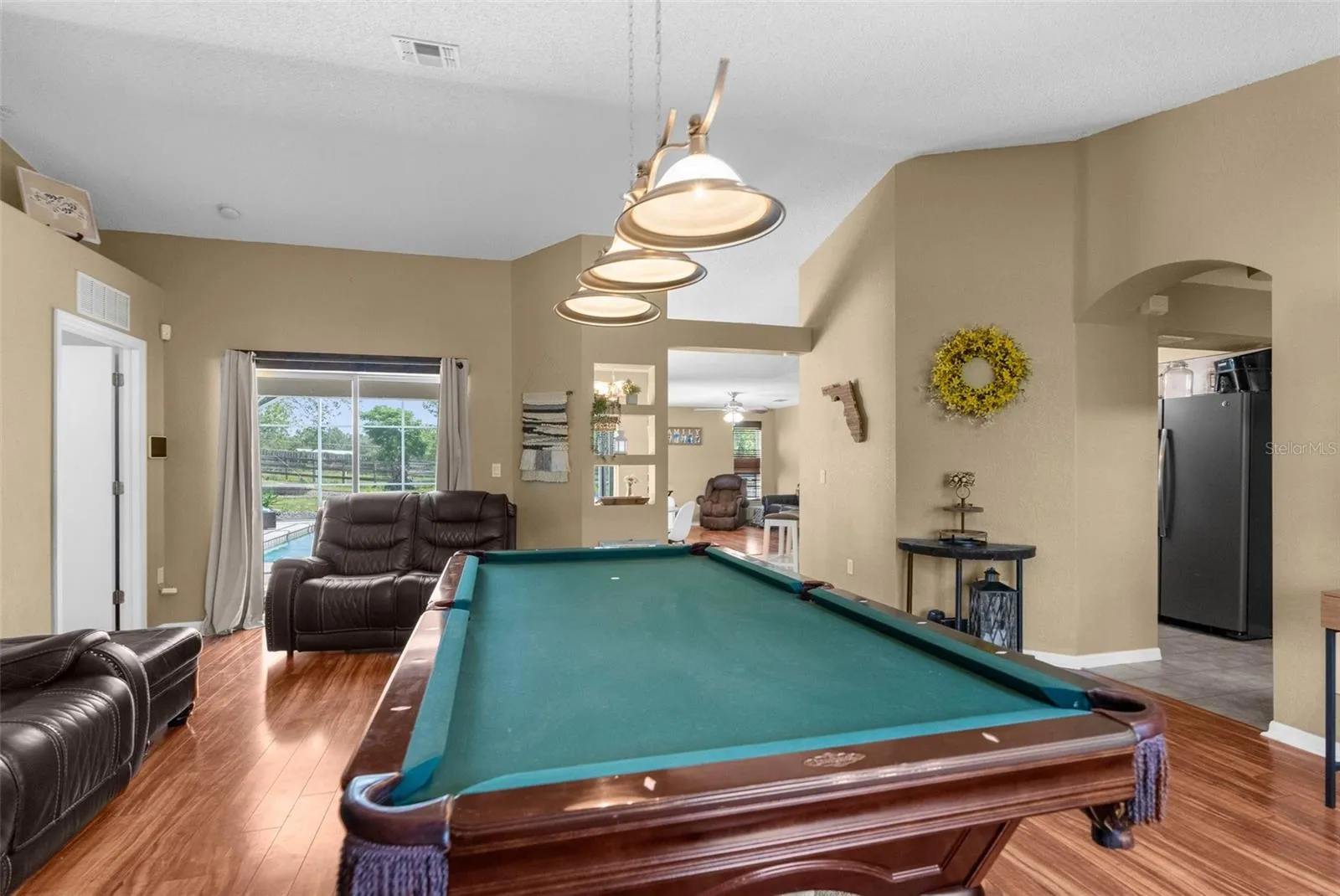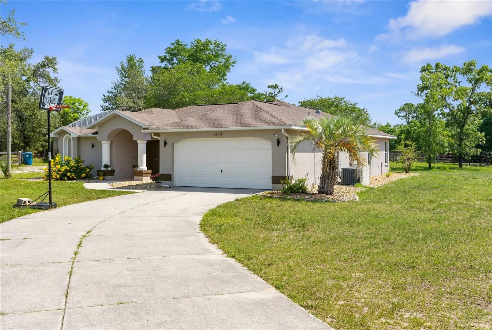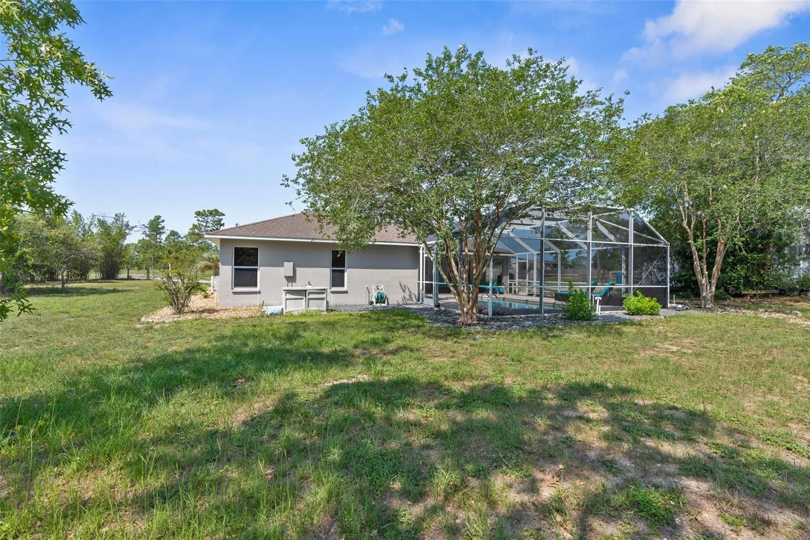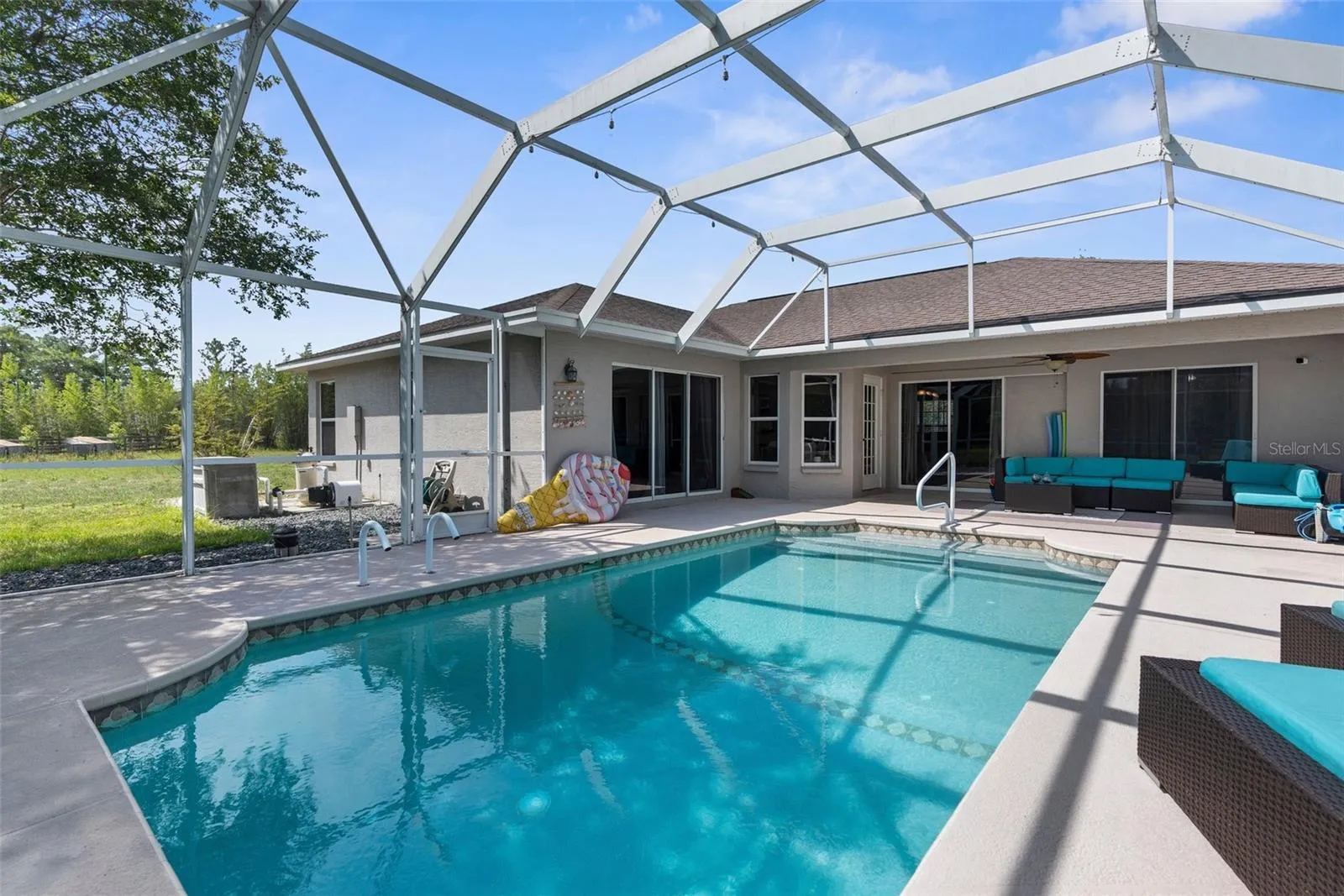 Country Living Meets Versatile Potential on 2 Acres! Welcome to your dream homestead—a move-in-ready 3-bedroom, 2-bathroom pool home with a 2-car garage and a massive steel-structure workshop/barn designed for flexibility, business, and animals alike! Step inside to a bright, open great room with a flex space ideal for dining or entertaining. Bathed in natural light from expansive windows and sliding glass doors, the home offers seamless indoor-outdoor living—perfect for entertaining. Whether you’re prepping in the kitchen or relaxing inside, the open sightlines to the pool all around the home lets you stay effortlessly connected to the fun outside. Enjoy granite countertops, black stainless steel appliances, and a vibe that blends comfort with functionality. Step out back and you’ll find your own personal paradise: a screen-enclosed in-ground pool with a 2025 brand-new pump, a lanai, and covered patio space, and fire pit—perfect for relaxing or hosting guests. Beyond the home the property continues to impress — The 30×60 steel building is a game-changer built on a concrete slab with electric, water, internet, and phone hookups. The front area is fully insulated with it’s own A/C unit, floor-to-ceiling storage, and a large exhaust fan—perfect for a business, workshop, or creative space. Divided by a non-structural steel wall, the back half boasts 2 large horse stalls with rubber-matted flooring throughout, with room to expand into more stalls or animal pens. Zoned Agricultural, this High-and-Dry 2-acre parcel features multiple pastures, a ready-to-go chicken coop, and farm fencing—ideal for hobby farming, side hustles, or full-on homesteading. Whether you’re starting a small business, raising animals, or simply craving space and serenity, this home has everything you need to live, work, and thrive all in one place. With so much country charm, modern upgrades, and unlimited opportunity all wrapped into one incredible property — Don’t miss your chance to step into the lifestyle you’ve been waiting for—schedule your showing today.
