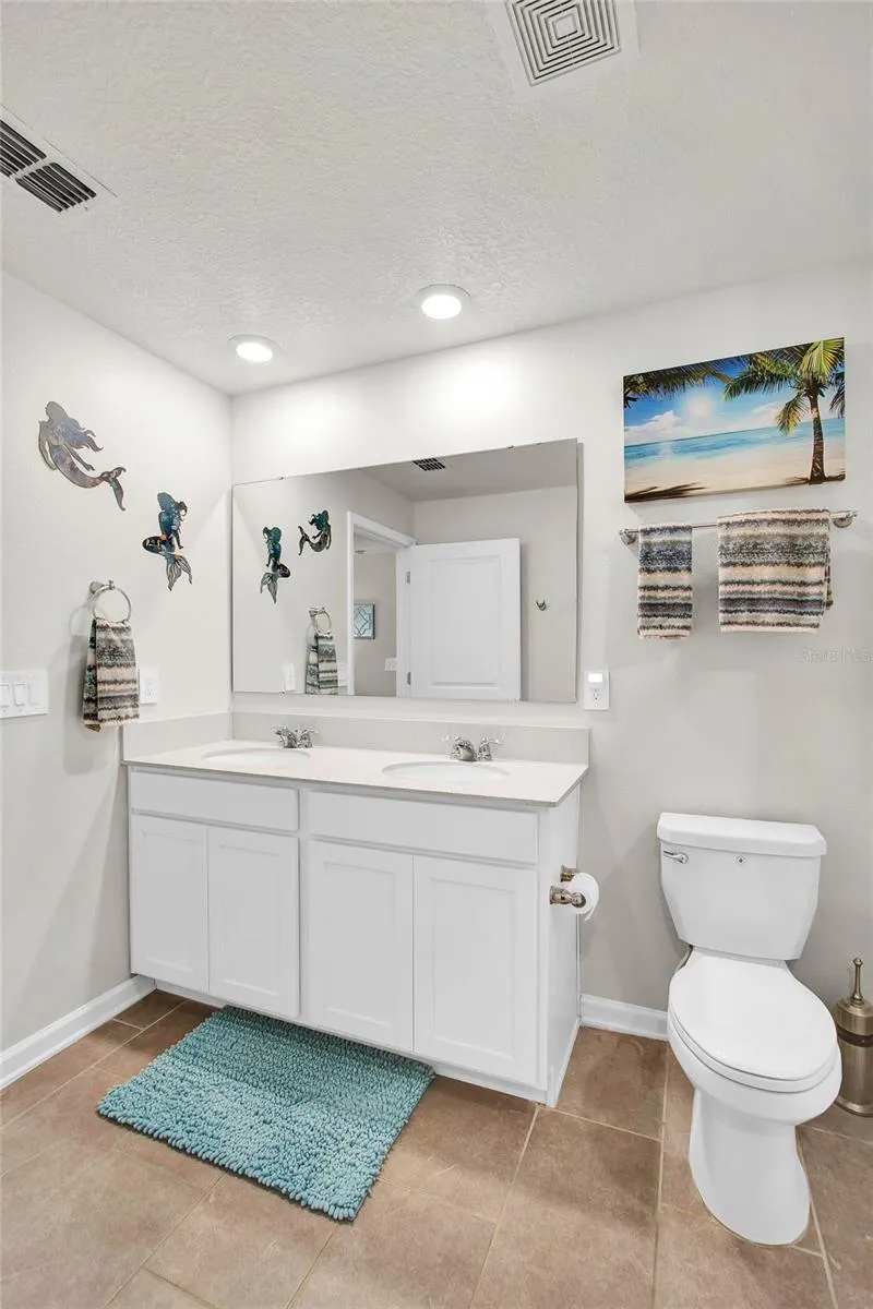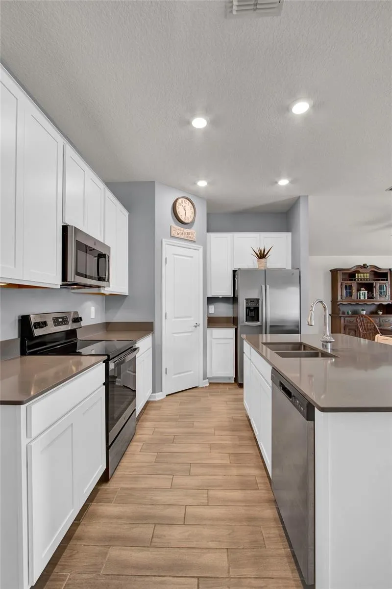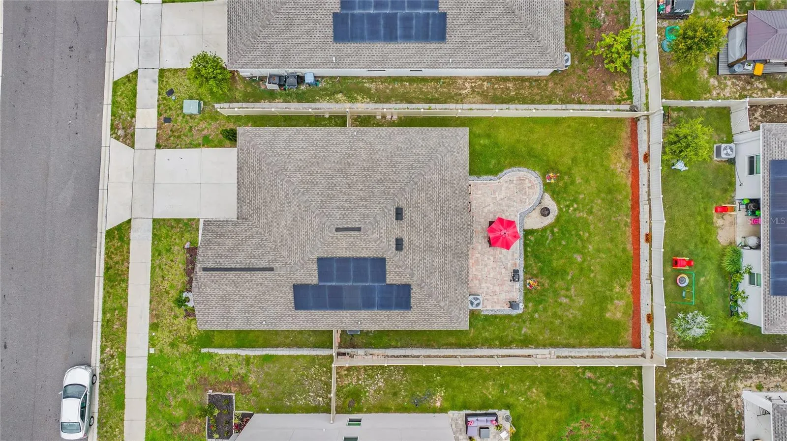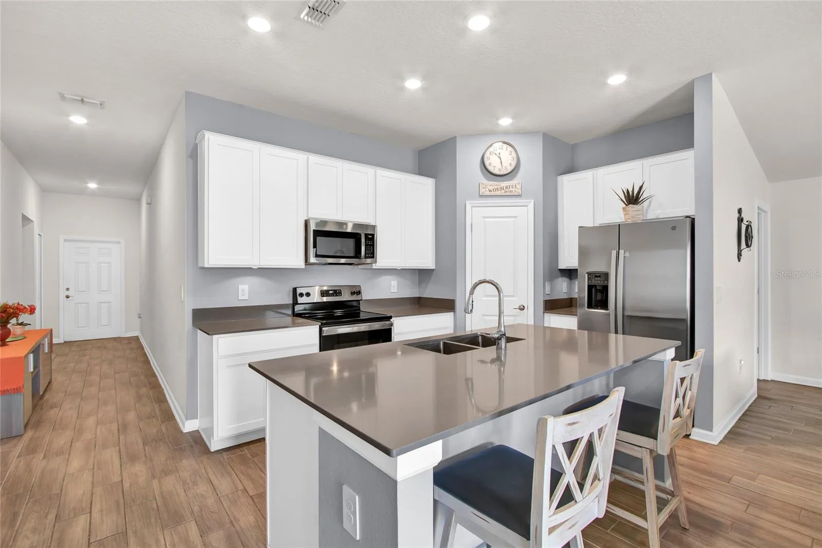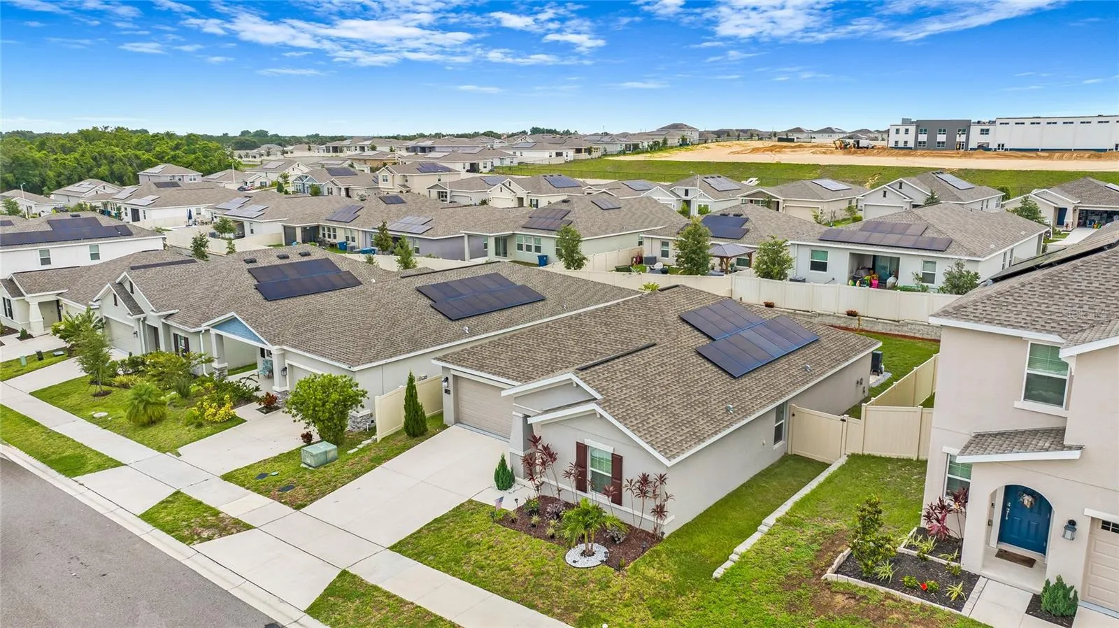 The modern kitchen features quartz countertops, island with breakfast bar, pantry, 42-inch white shaker cabinets, and stainless steel appliances. The owner’s suite is privately situated and includes a large walk-in closet and a dual-sink en-suite bath. This smart home includes keyless entry, a video doorbell, and solar panels for added energy efficiency and peace of mind.