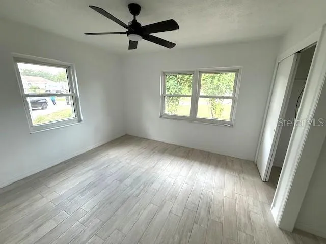 The primary bedroom is generously sized and includes ceramic tile flooring and a modern ceiling fan.