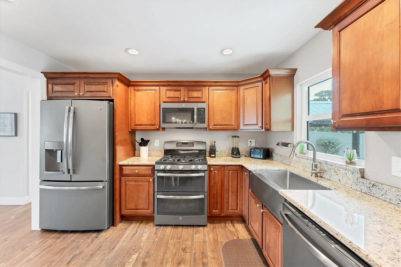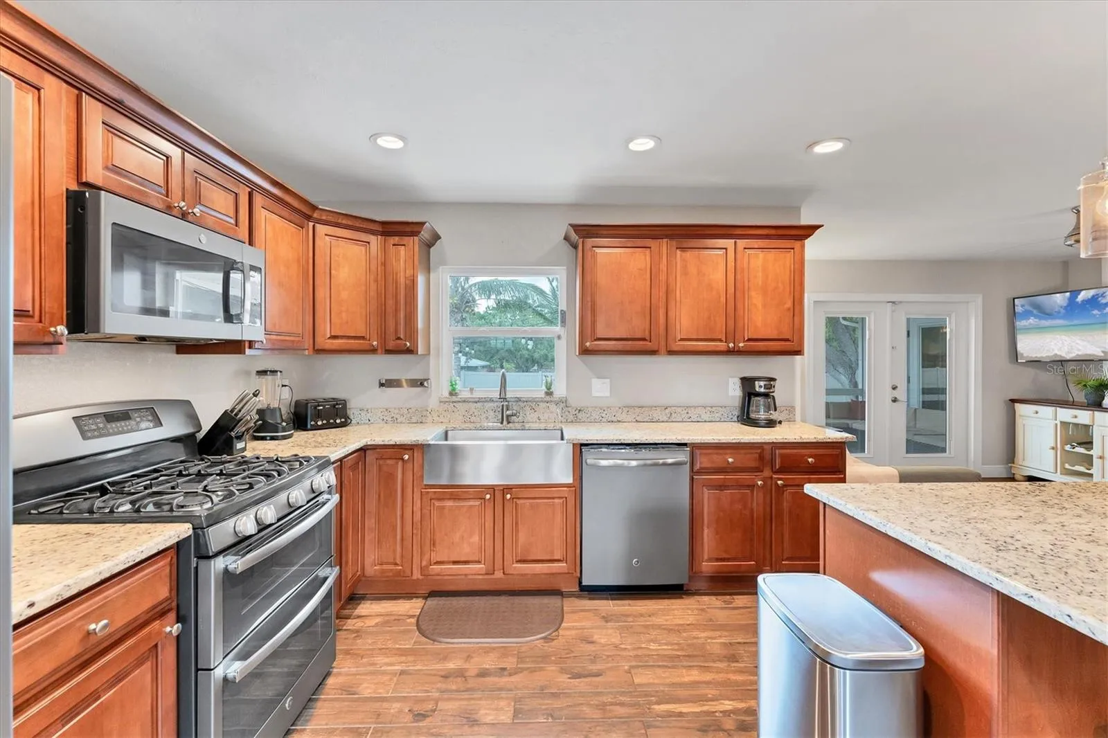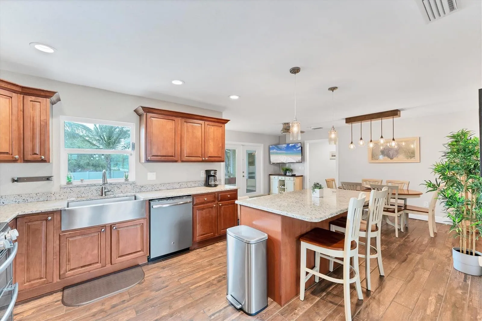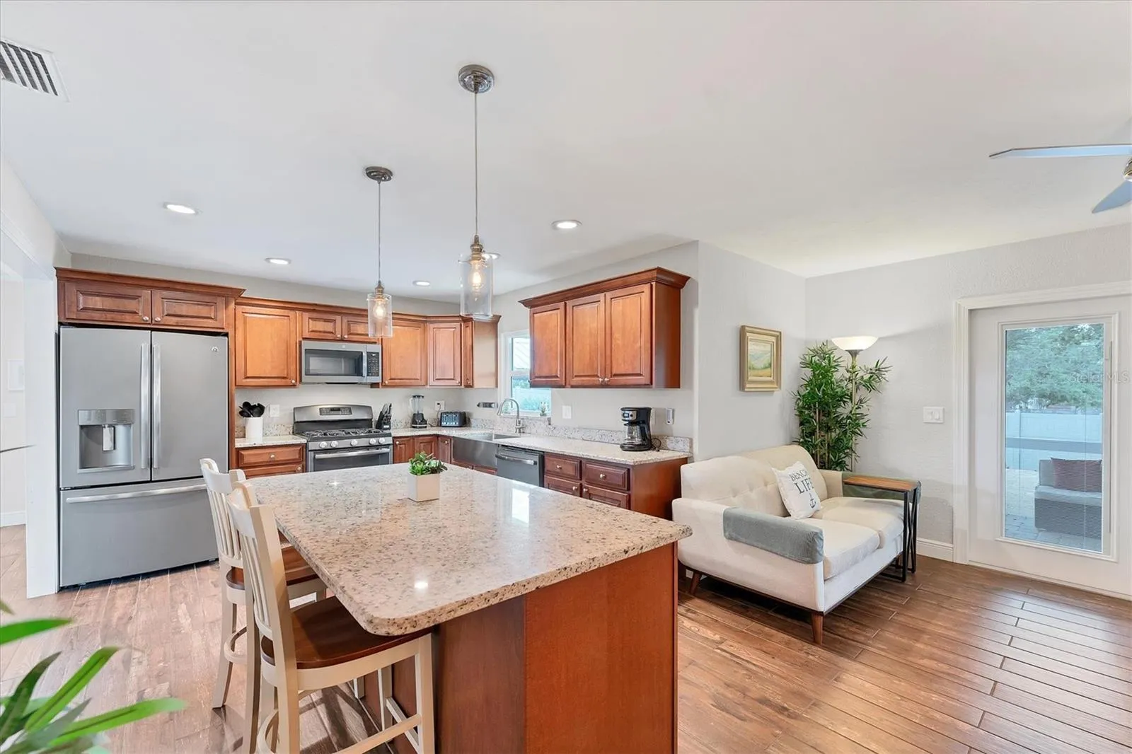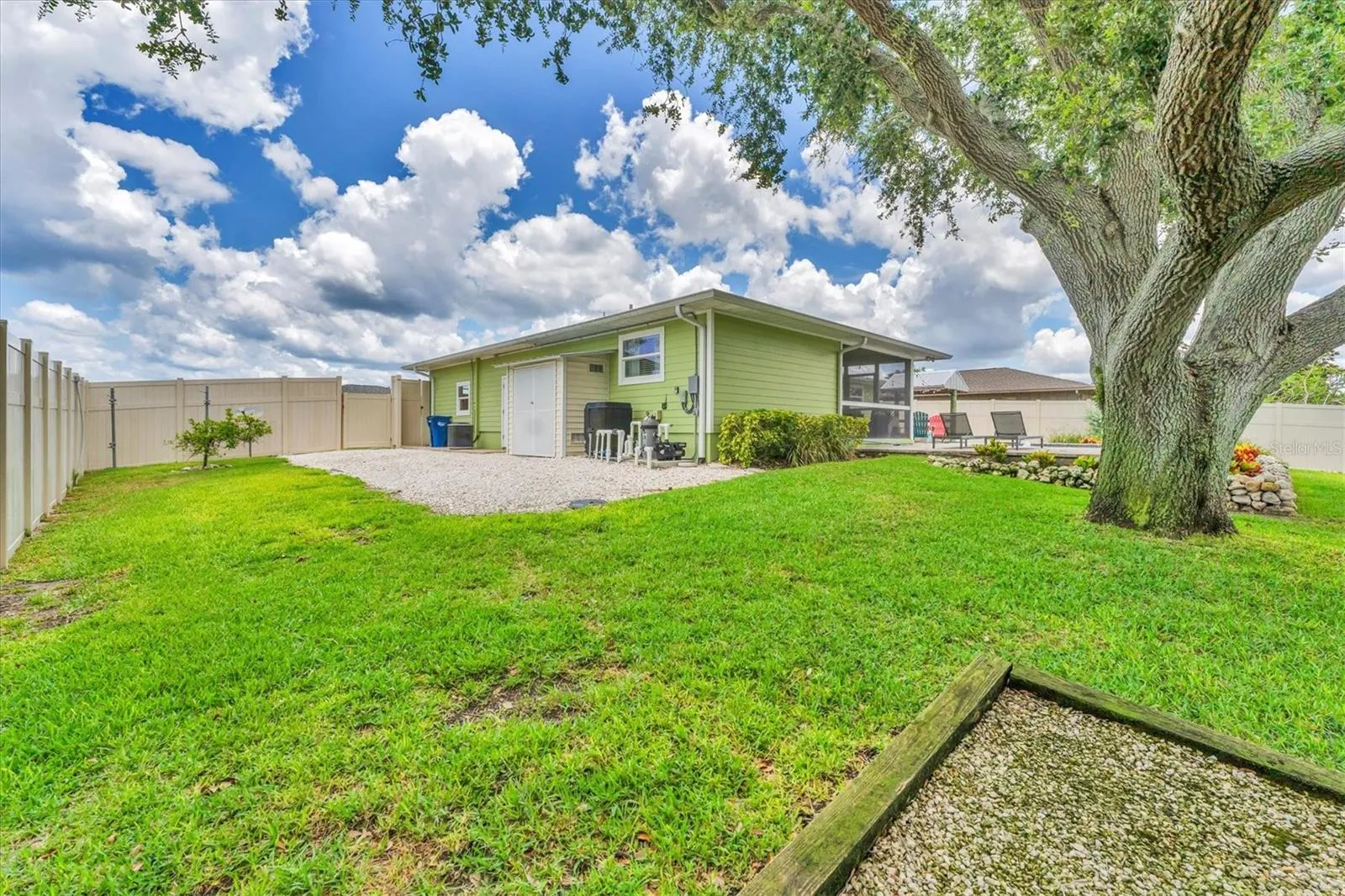 Discover Florida, living at its finest in this breathtaking home, perfectly positioned on a spacious corner lot. As you step inside, you’ll be welcomed by a warm, inviting living room filled with natural light, seamlessly connecting to a generous kitchen, dining area, and cozy TV space — all enhanced by elegant French doors that open to the lanai. The kitchen is a chef’s dream, offering ample cabinets, abundant counter space, and a large island that provides extra storage and a perfect spot for casual dining. With sleek stainless steel appliances and stunning quartz countertops, this space is not only functional but designed for unforgettable entertaining experiences. This thoughtfully designed split floor plan ensures privacy for everyone. On one side of the home, discover two spacious bedrooms accompanied by a full bath, while the luxurious primary suite awaits on the opposite side. The primary features a large walk-in closet and an exquisite ensuite bathroom, complete with quartz countertops and an oversized tiled walk-in shower with double showerheads. Easy access to the lanai through French doors makes this suite even more enticing. Step outside to the lanai and be captivated by the picturesque view of the sparkling pool and beautifully landscaped backyard. The backyard boasts a pool with stunning fountains, a built-in fire pit for cozy nights, and a covered dining area with quartz countertops — a perfect spot to unwind and entertain. There is an oversized shed and other small storage units. There is also ample space to park your RV or boat on either side of the house. Located close to the scenic Robinson’s Preserve and DeSoto National Memorial. This home could be sold turn key, perfect opportunity for an investor or second home. Newer metal roof (2021). Newer A/C (2021). New electrical (2021). Is this your perfect match? Book your showing today!