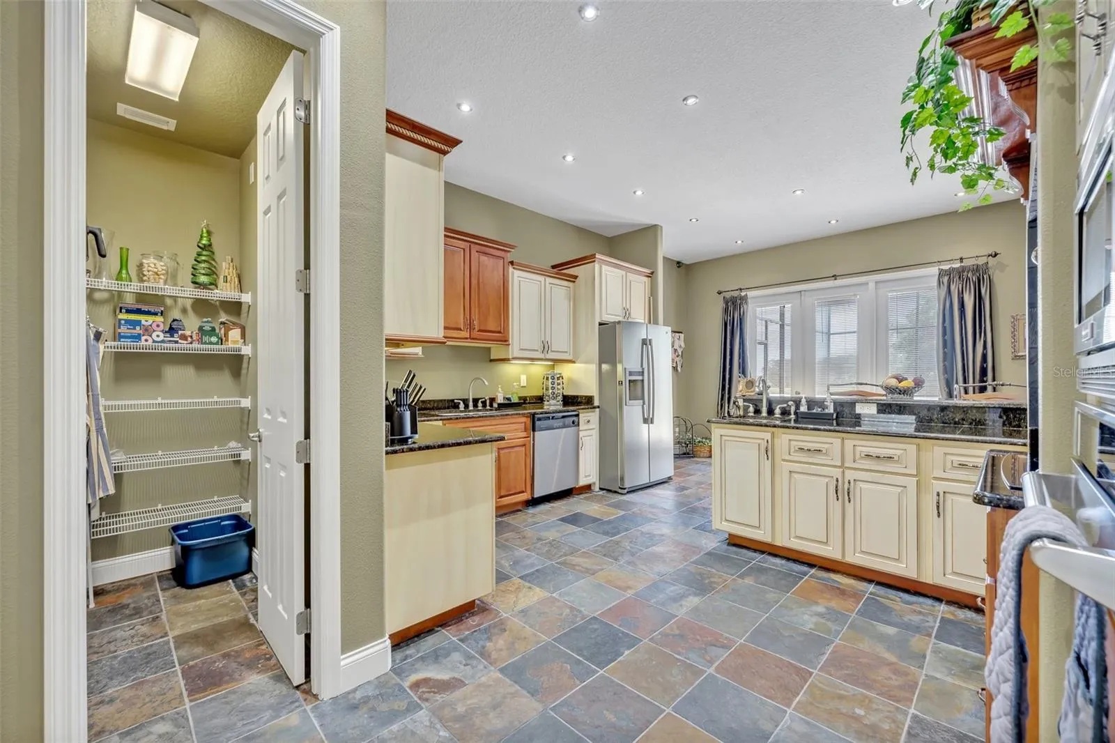 The chef’s kitchen features custom cabinetry with crown molding, stainless steel appliances, two Kohler ceramic sinks, and a breakfast nook with three-panel French doors leading to the resort-style screened pool area. Perfect for entertaining, the pool deck features a double-height Mansard enclosure, covered lanai, granite summer kitchen, wind-down sun screens, pre-wired speakers, and paver flooring.
