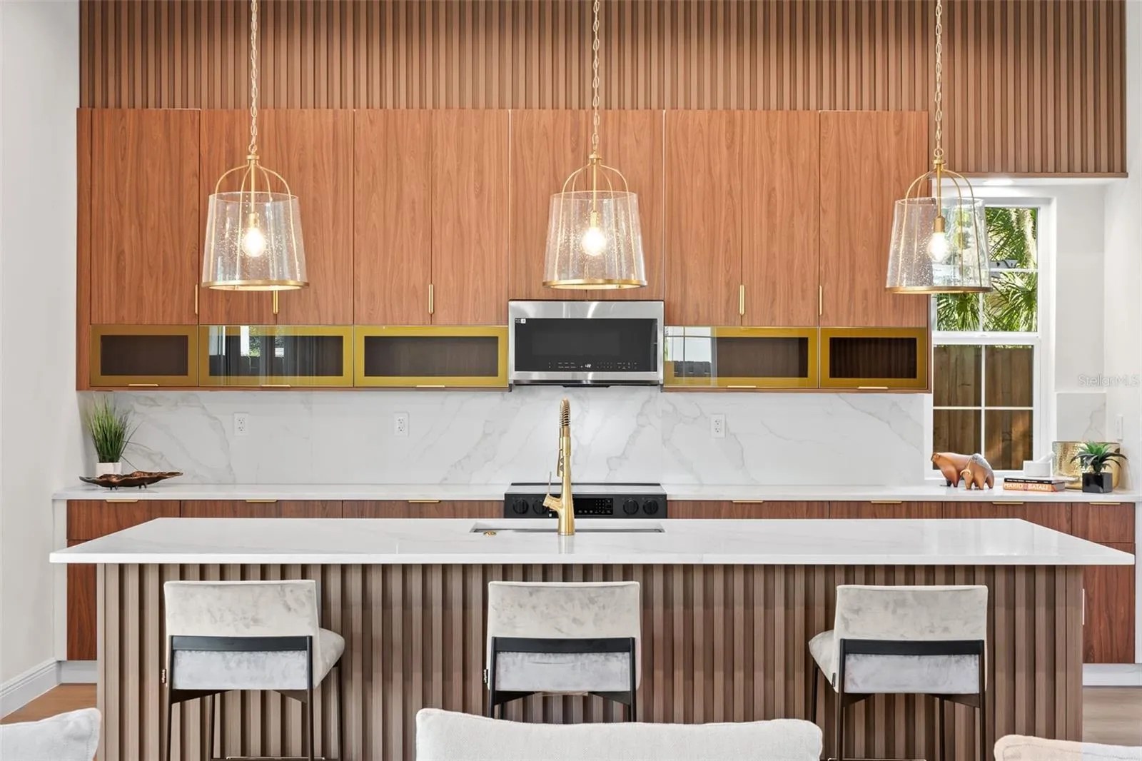 • Gourmet kitchen with quartz countertops, custom cabinetry, stainless steel appliances & oversized island
