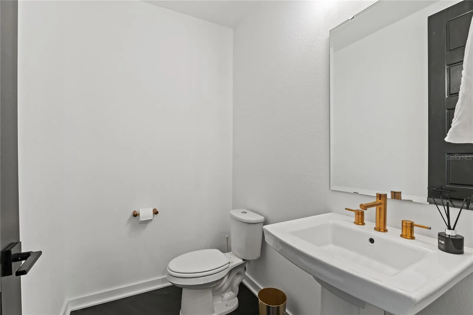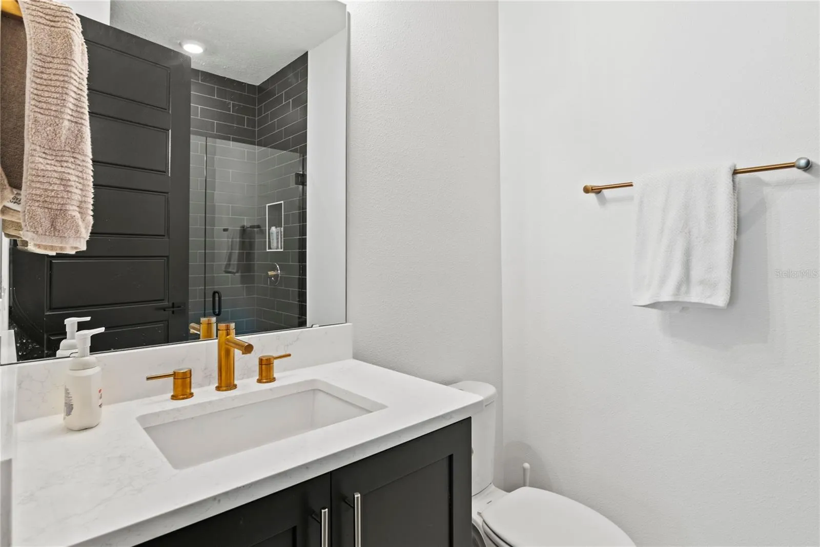 On the main level, the heart of the home opens around a designer kitchen complete with stone countertops, waterfall island with breakfast bar, 42″ cabinets with crown molding, stainless steel appliances, and a walk-in pantry. The layout flows seamlessly between the front living room and a relaxed family room, offering flexibility for entertaining or everyday comfort. Step outside to a covered balcony just off the kitchen, the perfect spot to enjoy your morning coffee or unwind in the evening. A powder room and extra storage complete this level with ease.