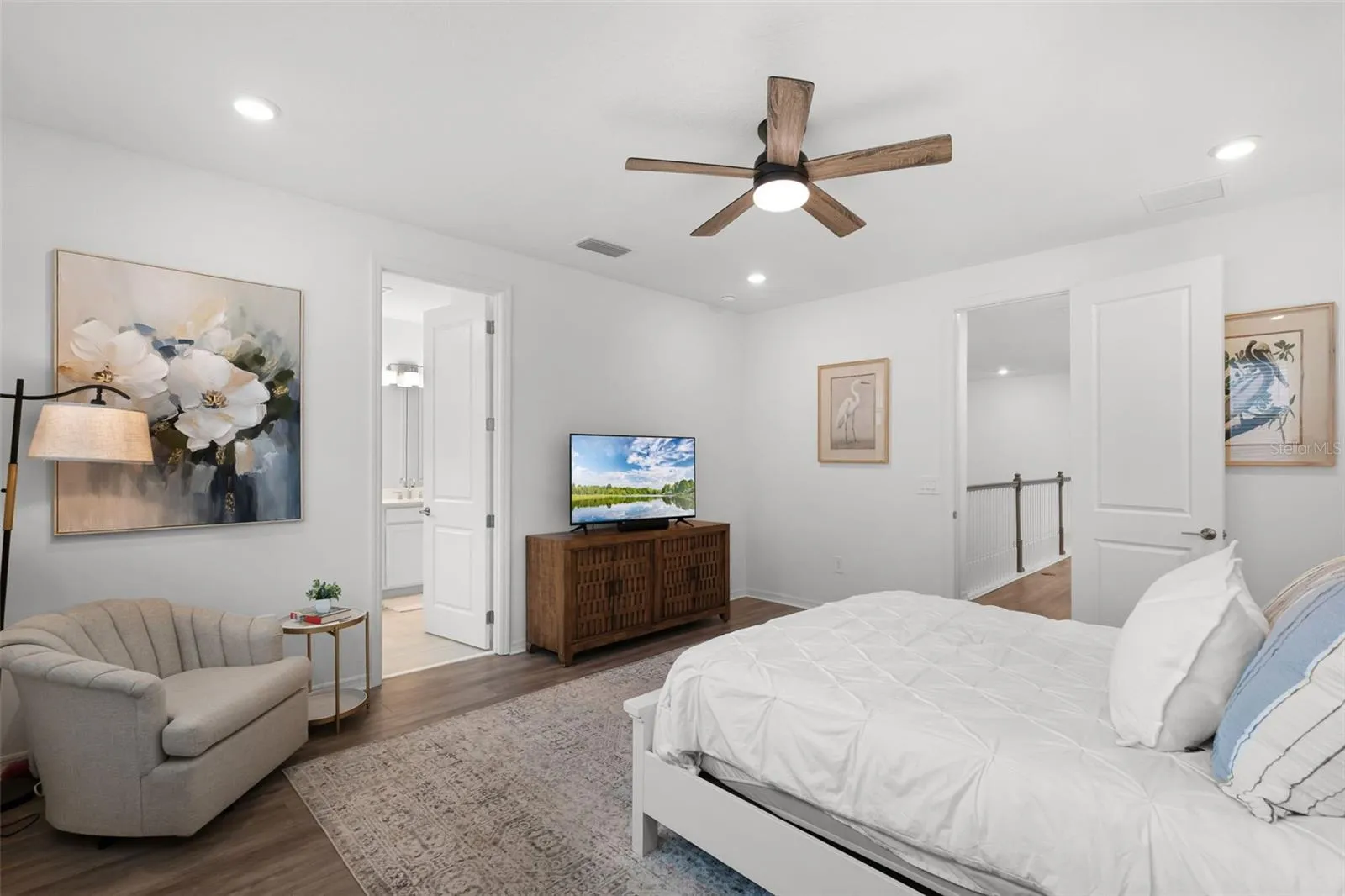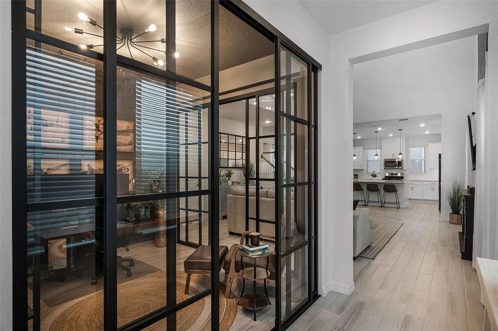 Step through the foyer into a spacious and light-filled gathering room. Along the way, you’ll find a dedicated home office enhanced with glass sliding doors for added style and functionality. The open-concept designer kitchen boasts 42” cabinetry, quartz countertops, upgraded appliances and lighting fixtures, island seating with built-in storage, and overlooks the great room with soaring ceilings complete with a stunning 20-foot custom fireplace surround — an impressive focal point for entertaining. Adjacent to the kitchen is a large dining room, ideal for family meals or hosting guests. Step out back to a covered lanai with extended pavers, a fully fenced backyard, and upgraded landscaping, offering a private and serene outdoor living space. A first-floor guest suite with matching tile adds convenience for overnight visitors.