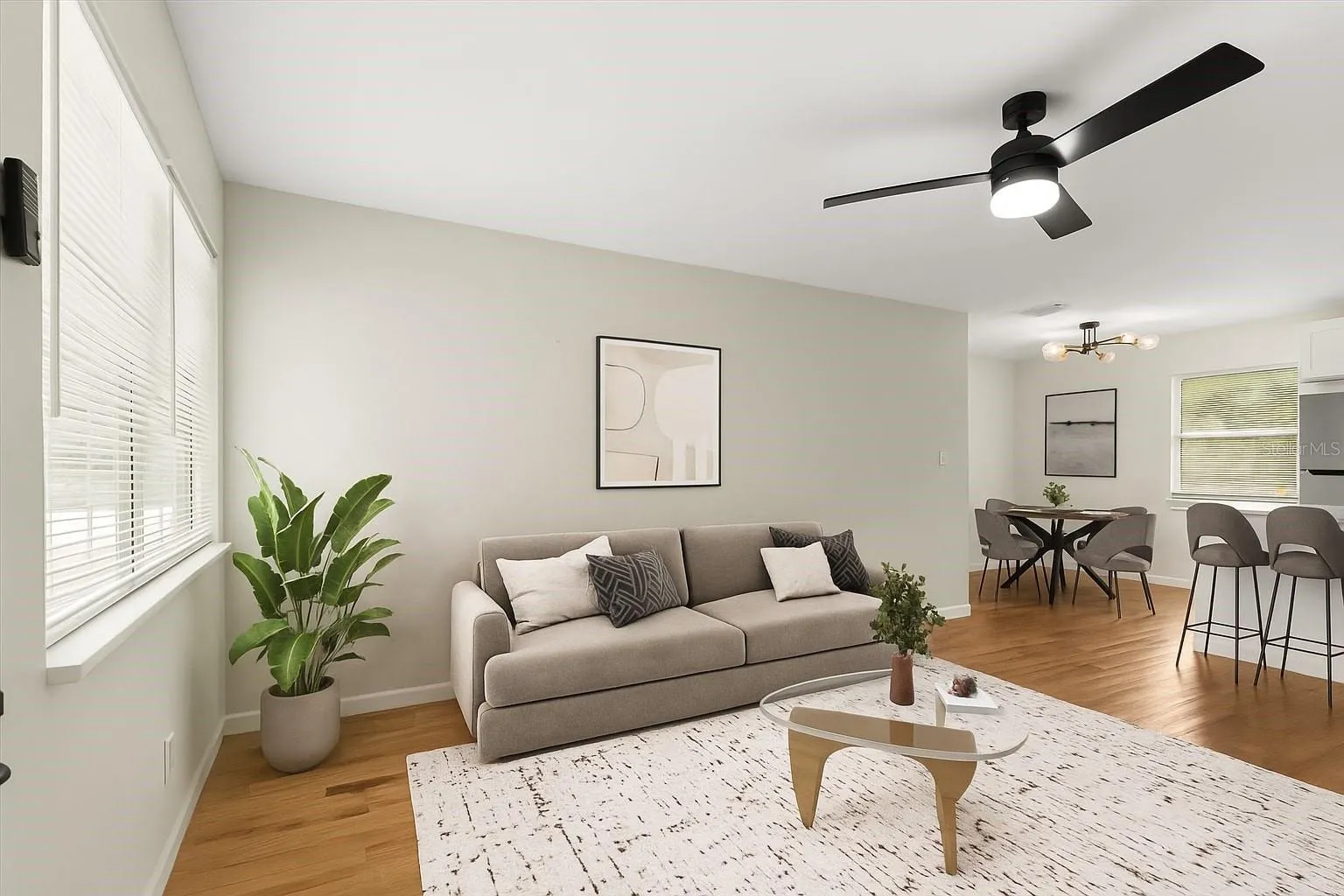 At the center of the home is a completely updated kitchen with white shaker cabinets, quartz countertops, stainless steel appliances, and upgraded lighting and hardware. The kitchen flows effortlessly into the dining and living areas, creating a warm, inviting space ideal for everyday living or entertaining.