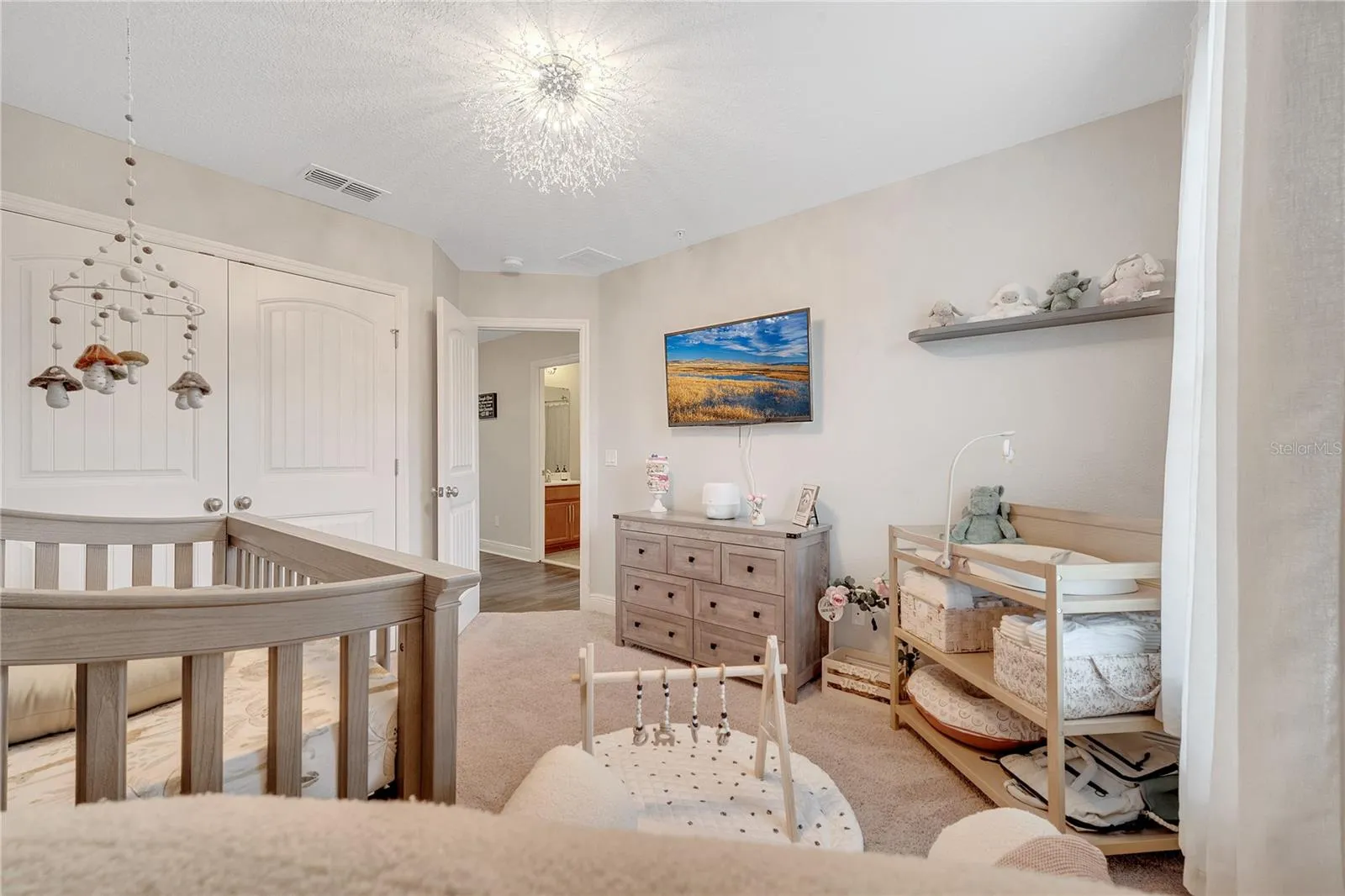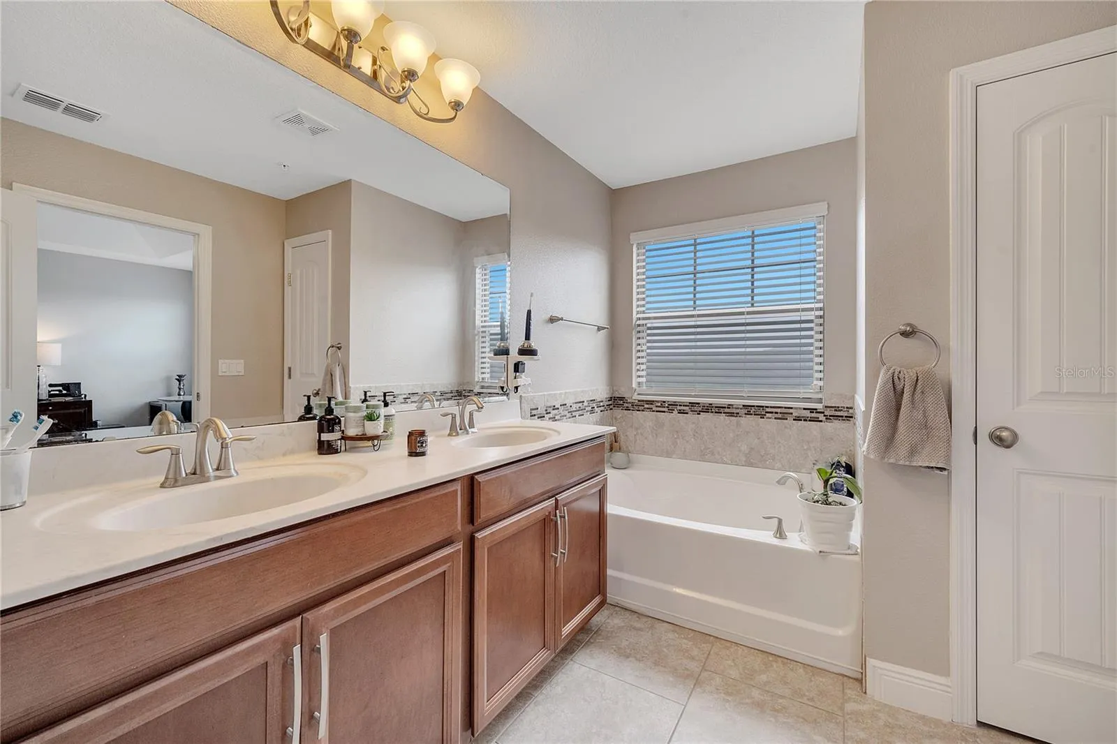 Upstairs, the spacious primary suite offers a tray ceiling, walk-in closet, and tranquil pond views. The en-suite bath includes a soaking tub, dual vanities, walk-in shower, and private water closet. Two additional bedrooms, a full bath, and a conveniently located laundry closet with washer and dryer complete the upper level.
