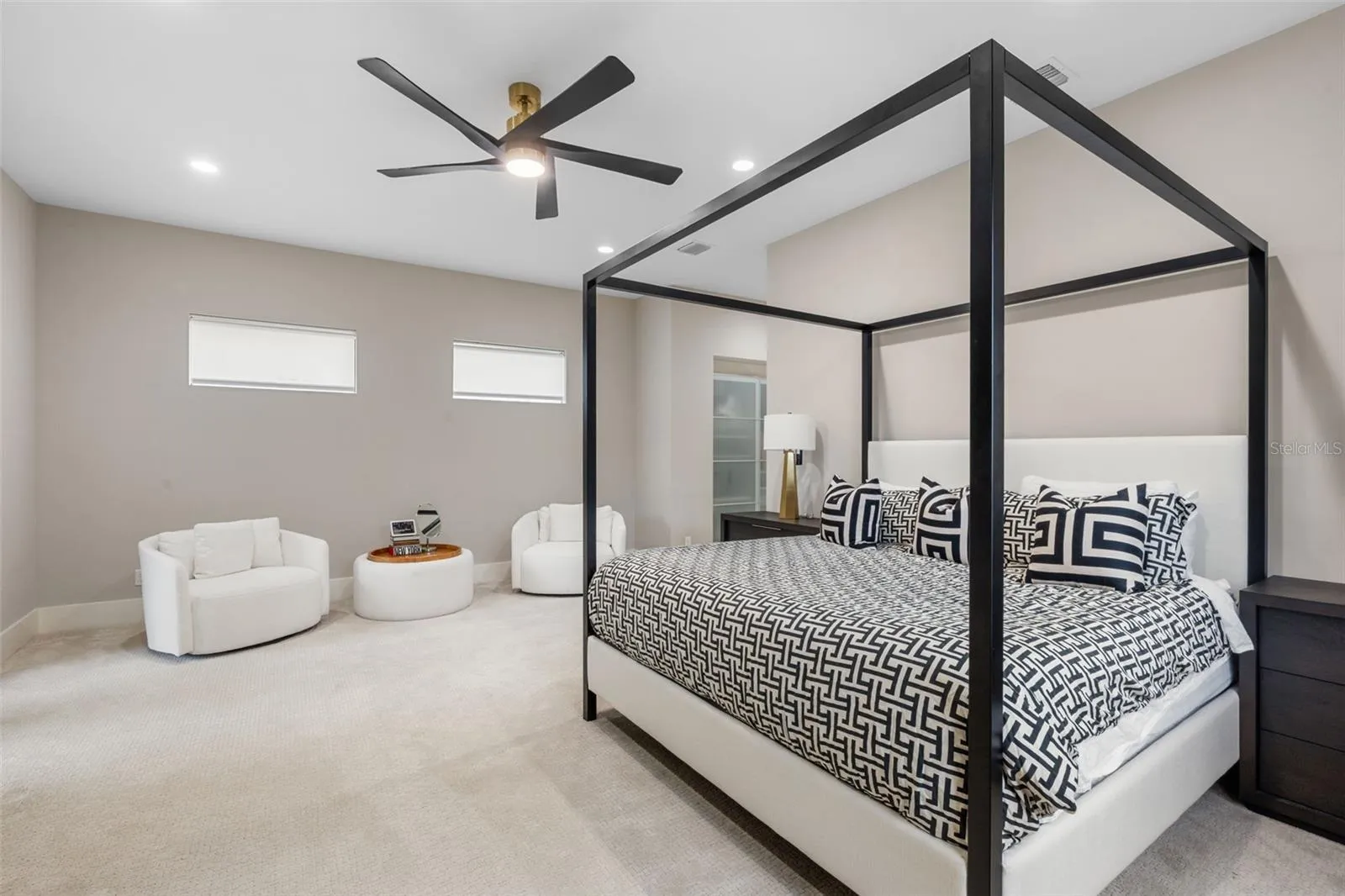 The primary suite is a true retreat, offering direct access to a private upper deck overlooking the backyard. The spa-inspired bathroom features a dual-head glass-enclosed shower, floating double vanity, custom closets, and elegant lighting.