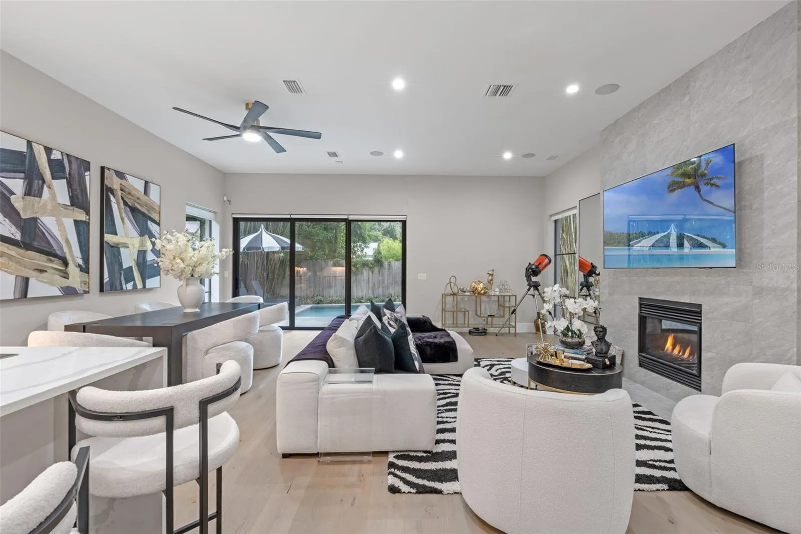 Tall glass doors and expansive windows blur the lines between inside and out. A collapsible sliding glass wall opens to the private backyard, featuring a cocktail pool, outdoor shower, lounge deck, and built-in plumbing for a future summer kitchen. Mature landscaping ensures privacy and serenity.