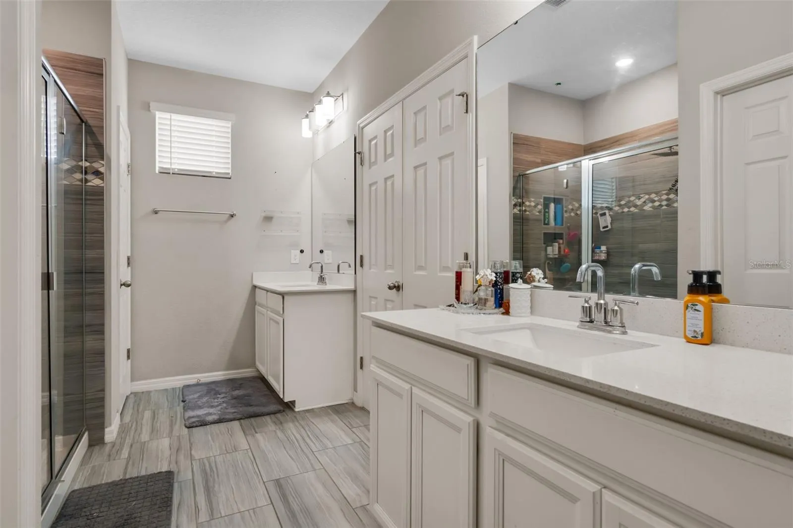 The upstairs has an additional family room, a large laundry room, and all bedrooms. The primary suite is tucked in the back with upgraded tile, separated dual sinks, a large shower, and a large walk-in closet with custom shelving and drawers. An x-large driveway with pavers leads into your two-car attached garage. The neighborhood has two community pools, including a deluxe resort-style pool and a splash pad equipped with cabanas, a nearby gym, and a viewing terrace of the Disney fireworks!