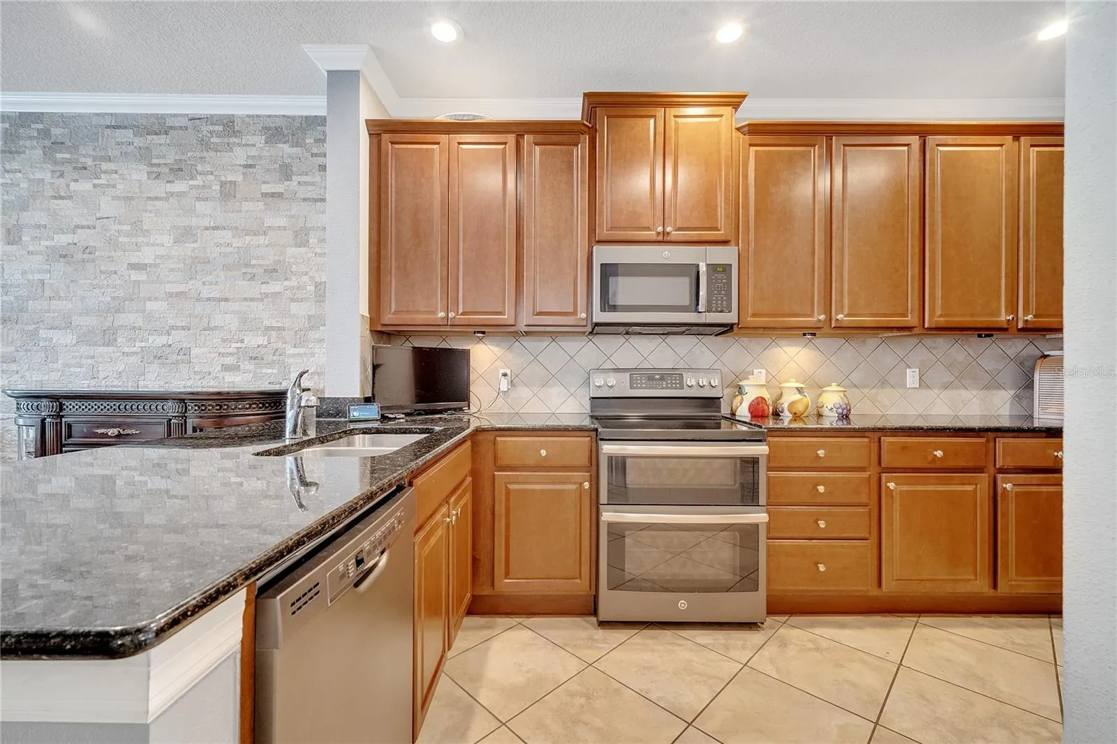 Situated in the desirable community of VillageWalk at Lake Nona, this Cayman II model townhome by DiVosta Homes is ready for its new owners. As you enter, you’ll be greeted by elegant tile flooring, crown molding throughout, and timeless plantation shutters that add charm and sophistication to the first floor. The spacious living room features a striking stone accent wall and flows seamlessly into the gourmet kitchen, which boasts granite countertops, stainless steel appliances, and ample cabinetry, perfect for both everyday living and entertaining. A guest bedroom on the first floor is highlighted by rich bamboo flooring and offers private access to a covered patio, along with a convenient full guest bathroom. Sliding glass doors in the living area open to a generously sized paver patio, ideal for outdoor gatherings and connecting you to a detached double-car garage. Upstairs, the stone feature wall continues along the staircase, enhanced by bamboo steps and decorative iron railing. The second floor includes a newly carpeted primary suite, featuring a private balcony for morning coffee or evening relaxation, and a secondary primary suite offers a dedicated sitting area and private bathroom, and walk-in closet. The updated laundry room is thoughtfully designed with a custom folding counter, built-in cabinetry for extra storage, and a hanging rod for delicates. This home offers both comfort and functionality, with carefully selected finishes and upgrades throughout.