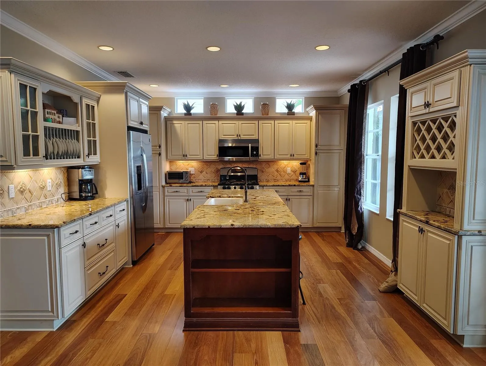 The professionally designed kitchen is well-equipped and thoughtfully laid out with Omega cabinetry, level five granite countertops, and custom travertine backsplashes. The spacious center island houses a large farmhouse sink, hidden dishwasher, and multiple electrical outlets, and a number of discrete storage options. Along with the minibar, space for seating along the island’s far side is convenient for breakfast, casual dining, or late-night snacking. The kitchen and family room directly access the screened pool deck, pool and spa, with a dedicated outdoor grilling gas line — great for whether relaxing with family or entertaining friends.