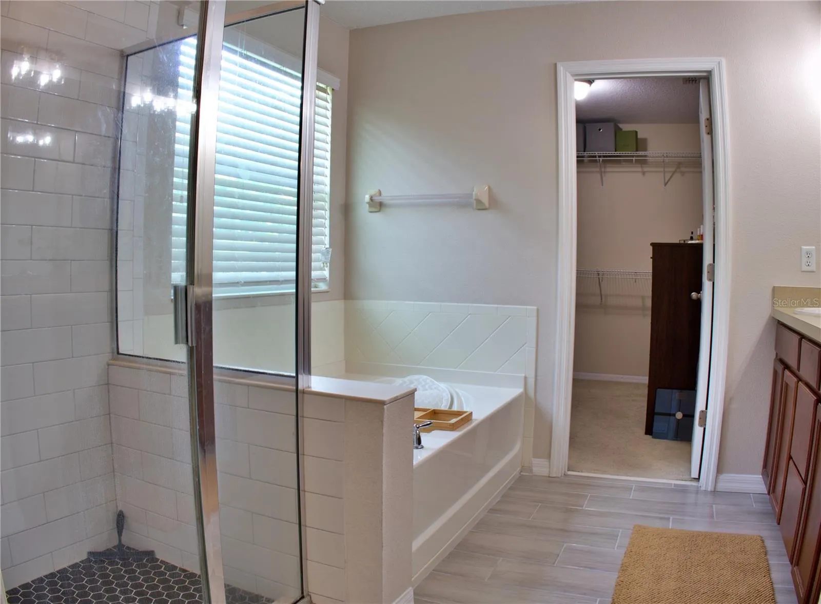 • Upstairs master suite with a beautifully updated bathroom: dual sinks, large vanity, walk-in shower, relaxing tub, and generous