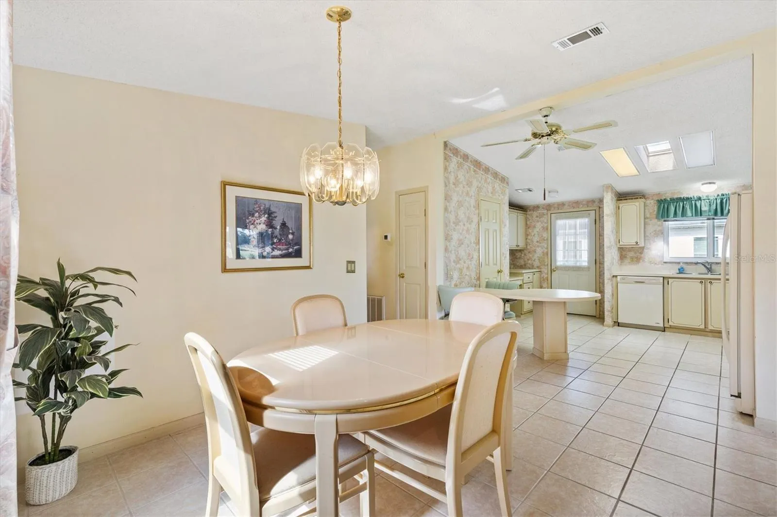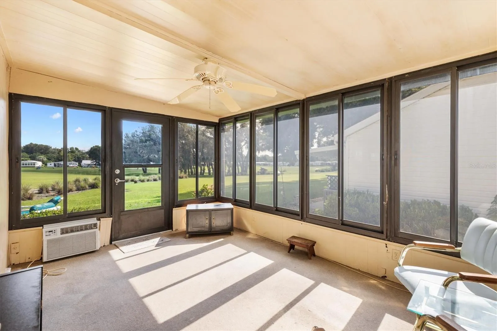 ON GOLF COURSE 2/2 Manufactured Home 4th Hole Silver Springs Golf Course. ROOF 2021 HVAC 2018 NO BOND! Stunning fairway views from the comfort of your living room. Enjoy natural light and picturesque scenery through the large windows or relax in the enclosed lanai accessed by sliding glass doors—perfect for year-round comfort. Step outside to the back outdoor patio, soak in the tranquil setting and watch the golfers. Inside, you’ll find a spacious living and dining area featuring a built-in bar and cabinets, as well as an entry coat closet for added convenience. The eat-in kitchen is both functional and charming, with a pantry closet, built-in desk with extra storage, a skylight, and built in seating area. The primary suite features a walk-in closet and an updated ensuite bathroom with a glass-door shower, single vanity (with space to convert to dual), and an additional large closet. The guest bath with has a tub/shower combo with glass doors. Additional highlights include: Ceiling fans and blinds throughout, Partially furnished for easy move-in, Mirrored closets for added brightness. Utility room with washer, dryer, utility sink, and shelving. Whether you’re looking for a seasonal escape or full-time residence, this home offers comfort, storage, and unbeatable golf course views. Just a short golf cart ride to the Silver Lake Community Pool and Hot Tub and less than 2 miles to Spanish Springs Town Square for entertainment, dining and shopping. This location can’t be beat. Make this home your own and start living the Villages dream. View our video and make your appointment to see this home today!
