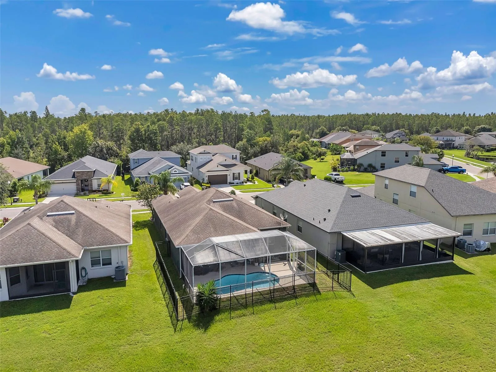 This 3-bedroom, 2-bath pool home offers nearly 2,000 sq ft of open-concept living in a top-rated, amenity-rich community. The interior features a striking kitchen with 42″ maple cabinets, granite countertops, ceramic tile backsplash, stainless steel appliances, and a cozy eat-in café. New wood-look laminate flooring runs throughout, with ceramic tile in all wet areas. The spacious primary suite includes dual walk-in closets, dual vanities, a walk-in shower, and a garden tub. Upgrades include a Pelican no-salt whole-house water softener, whole-home surge protection, professionally tinted windows, and a CAT-4 resistant garage door with LiftMaster opener. The fully fenced backyard features a beautifully landscaped yard, a crystal-blue inground pool (re-tiled in 2019, pump replaced in 2021), and a covered patio overlooking open greenspace for added privacy.