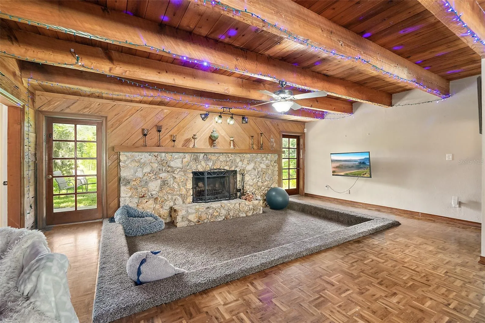 This expansive 6-bedroom, 4.5-bathroom property includes three primary suites, each designed with comfort and luxury in mind. From the moment you enter, you’re greeted by vaulted cedar ceilings and walls, coquina stone fireplaces, and rich parquet wood flooring — all creating a welcoming, organic atmosphere that’s hard to find in today’s market.
