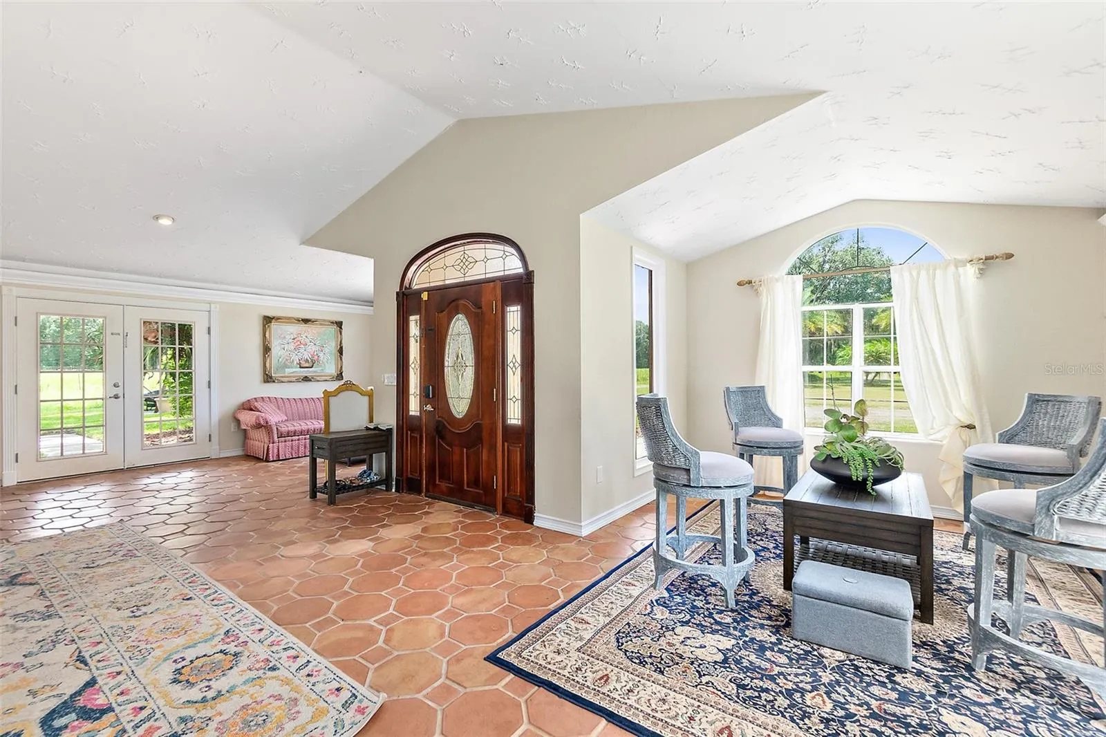 Formal living room with soaring ceilings and a dramatic coquina fireplace