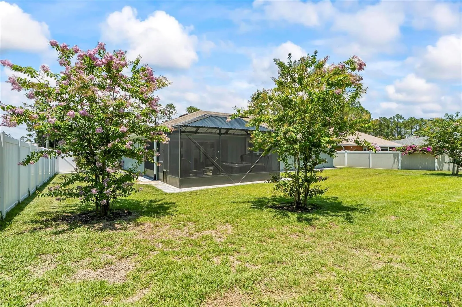 Enjoy the comfort of an open-concept layout, modern finishes, and abundant natural light throughout. The kitchen boasts contemporary cabinetry and ample counter space, perfect for entertaining or everyday living. Step outside to your private backyard oasis, complete with a **screened lanai and hot tub**—ideal for relaxing after a long day. The **fully fenced yard** offers privacy, safety, and plenty of space for pets or play.