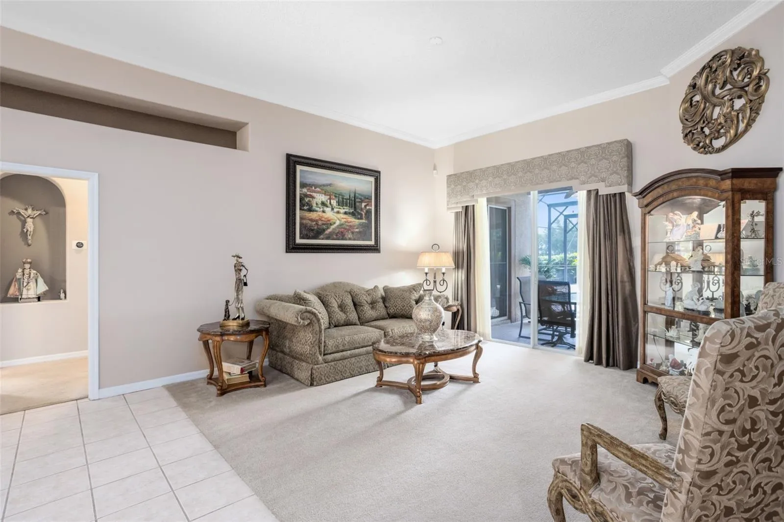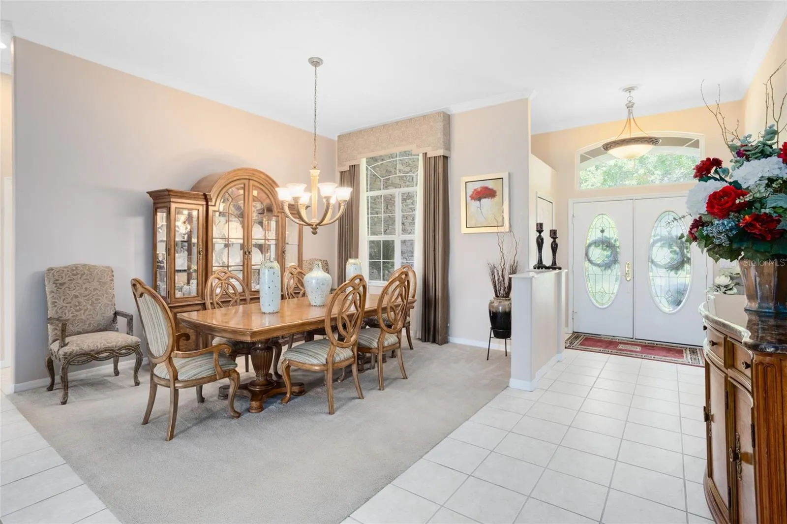The kitchen features Samsung appliances, Corian countertops, and a sunny dinette overlooking the screened pool and patio. The family room shines with custom built-ins and natural light, while the formal living and dining rooms create elegant spaces for gatherings. Three sets of sliding glass doors make indoor-outdoor living effortless.