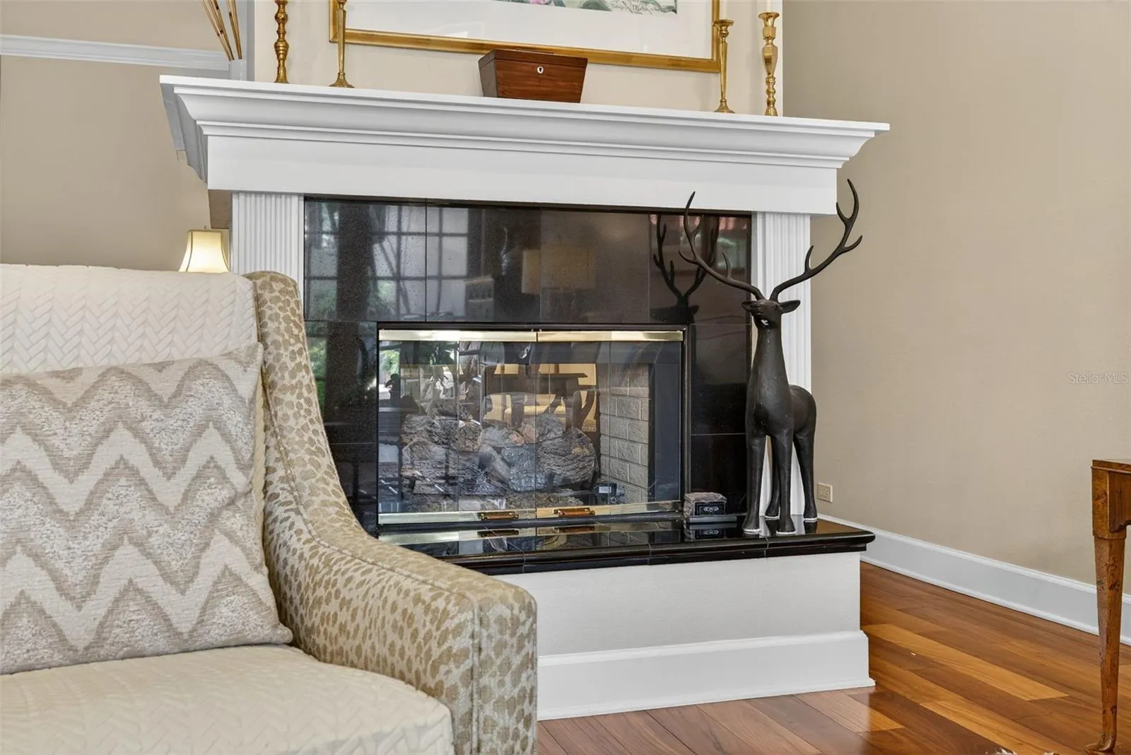 Inside, this home welcomes you with rich hardwood floors, crown molding, 12′ volume ceilings and a flexible layout designed for both everyday living and elegant entertaining. The first floor features a formal living room, dining room, and a spacious bedroom with en suite bath and French doors serving as a dual primary bedroom. A two-sided gas fireplace adds warmth and ambiance to both the living and dining areas, and a dry bar adds functionality and charm.