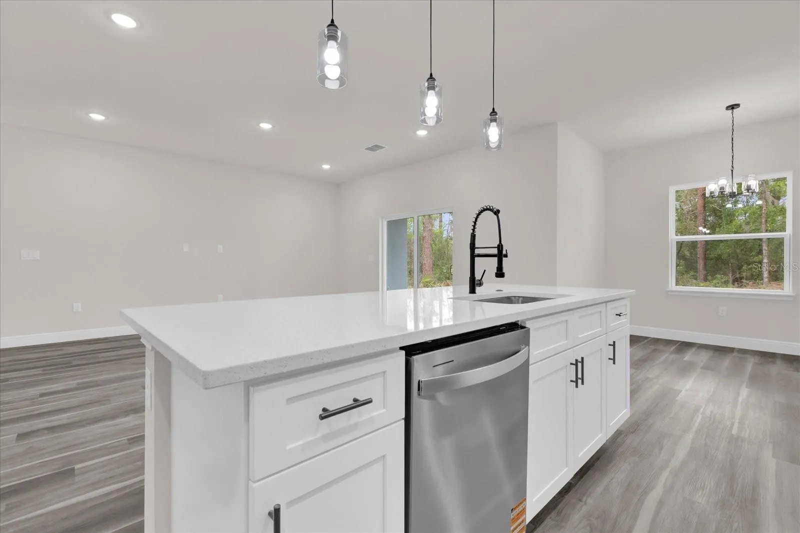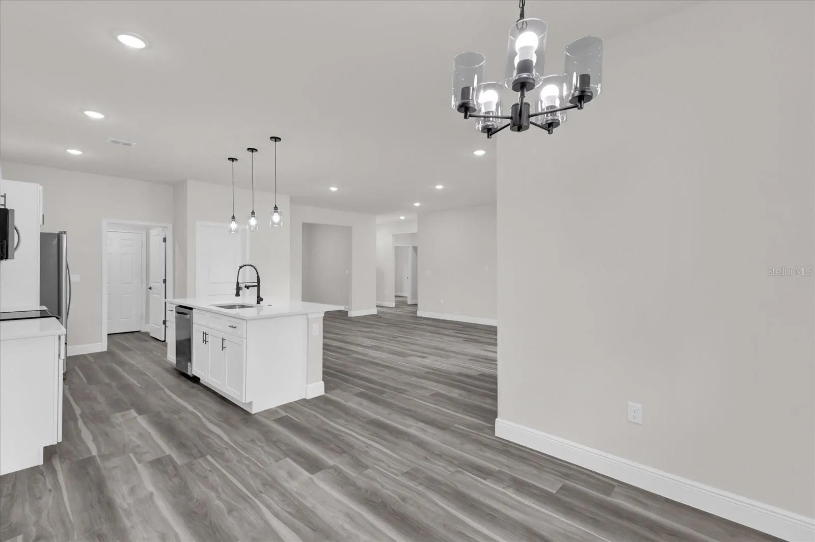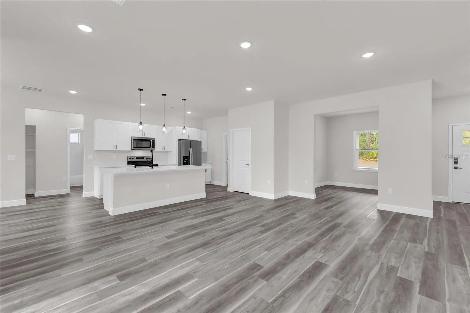 Upon entry, you’ll find elegant touches throughout, including luxury vinyl plank flooring, plenty of natural light, and an open-concept layout ideal for everyday living and entertaining. The chef’s kitchen features quartz countertops, shaker cabinets, stainless steel appliances, and a spacious island that anchors the living area.