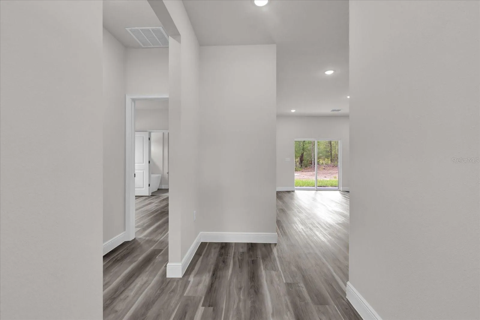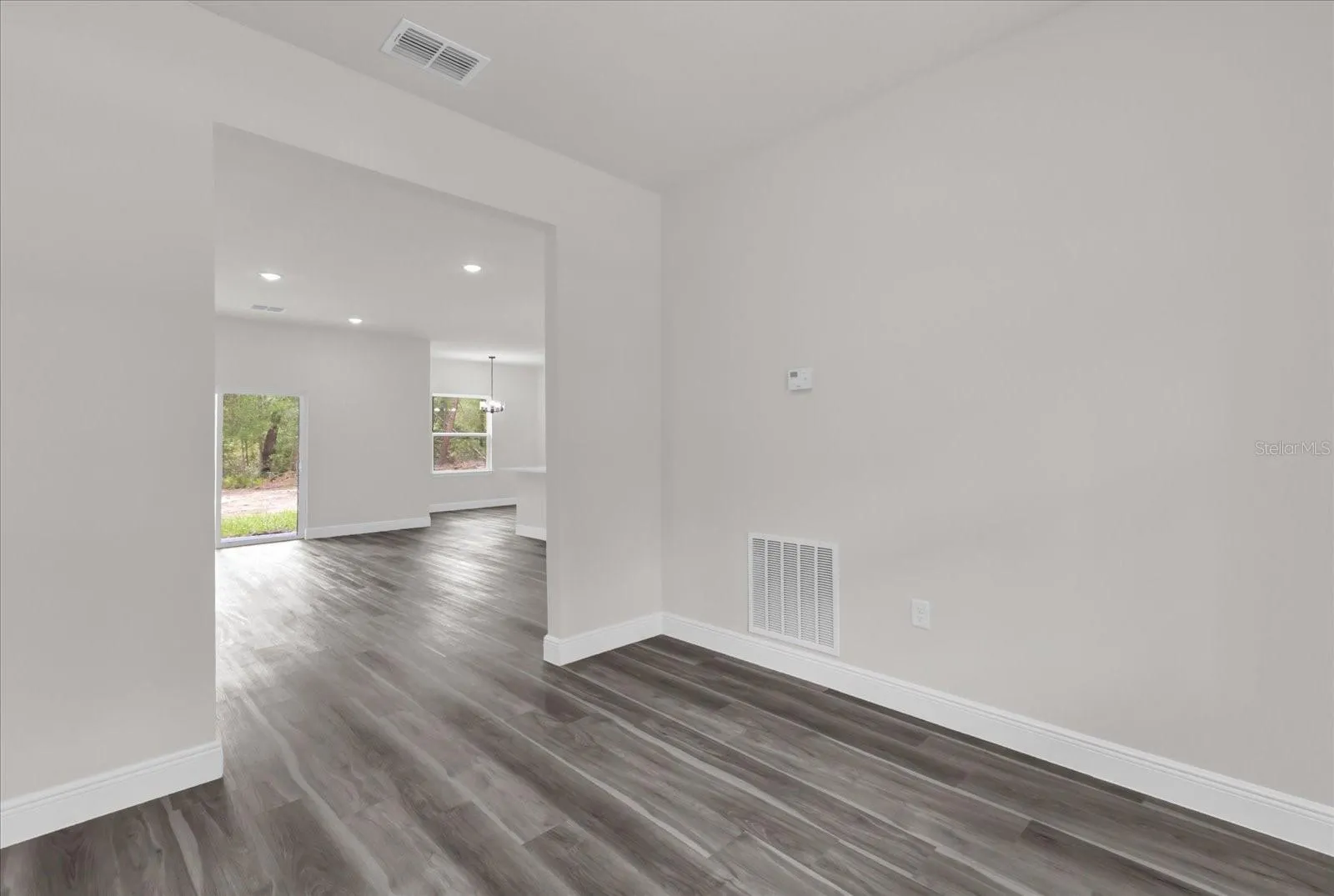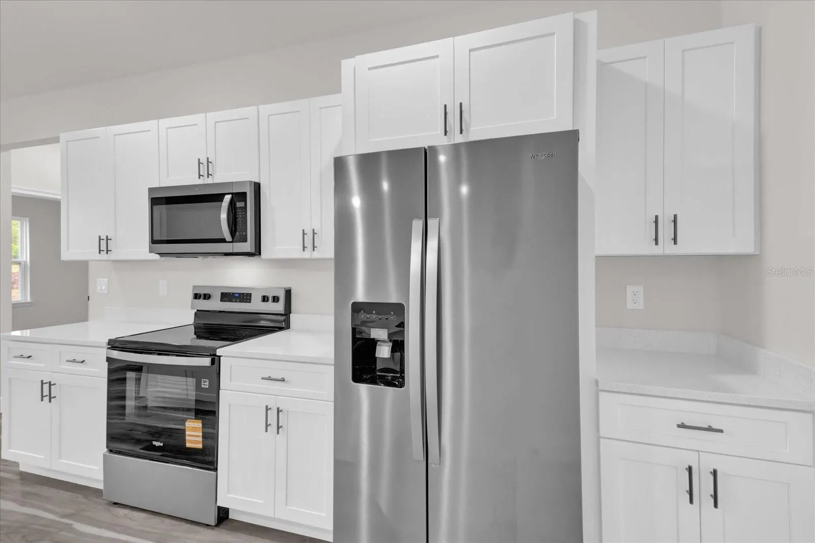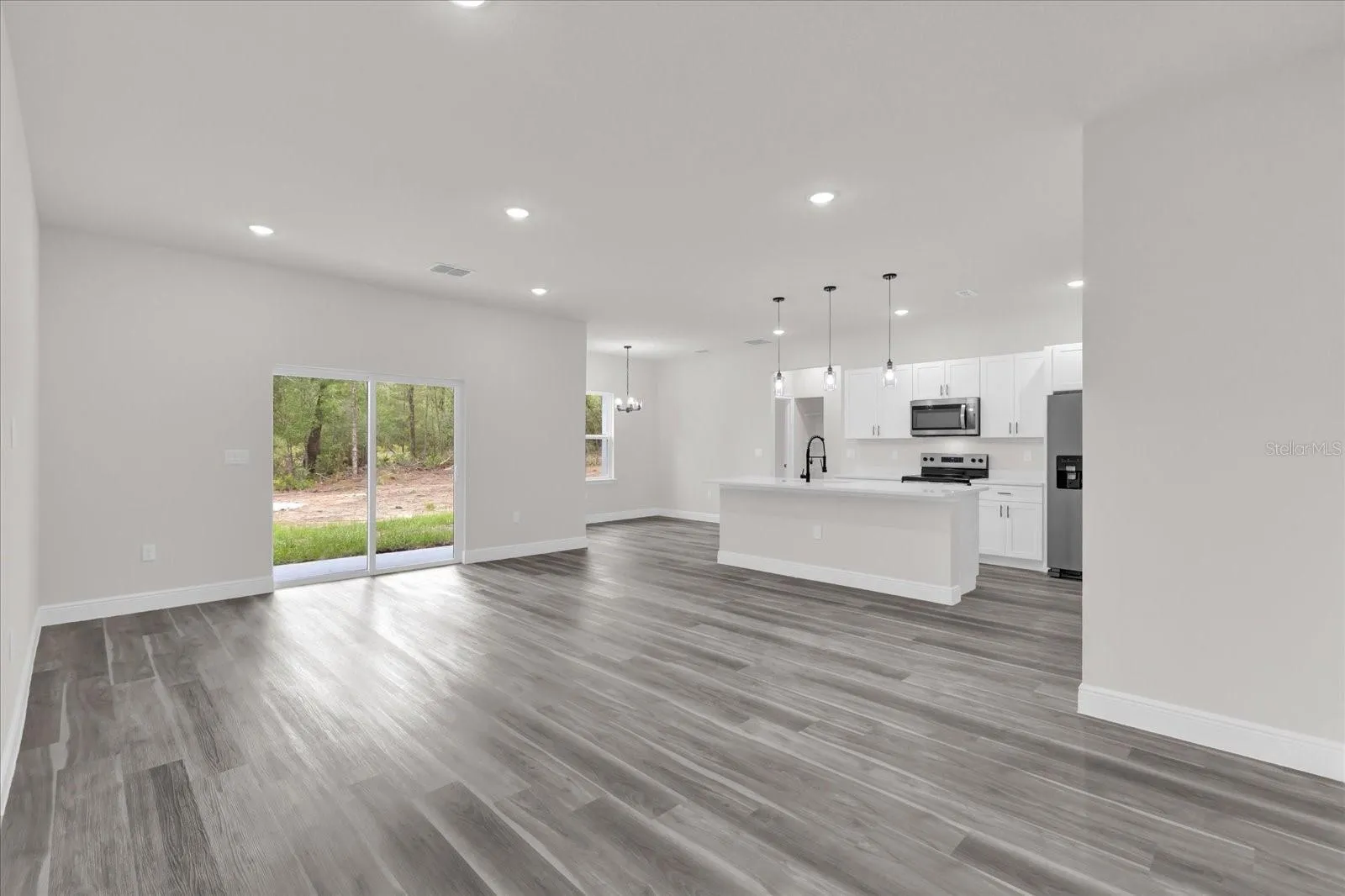 Upon entry, you’ll find elegant touches throughout, including luxury vinyl plank flooring, plenty of natural light, and an open-concept layout ideal for everyday living and entertaining. The chef’s kitchen features quartz countertops, shaker cabinets, stainless steel appliances, and a spacious island that anchors the living area.
