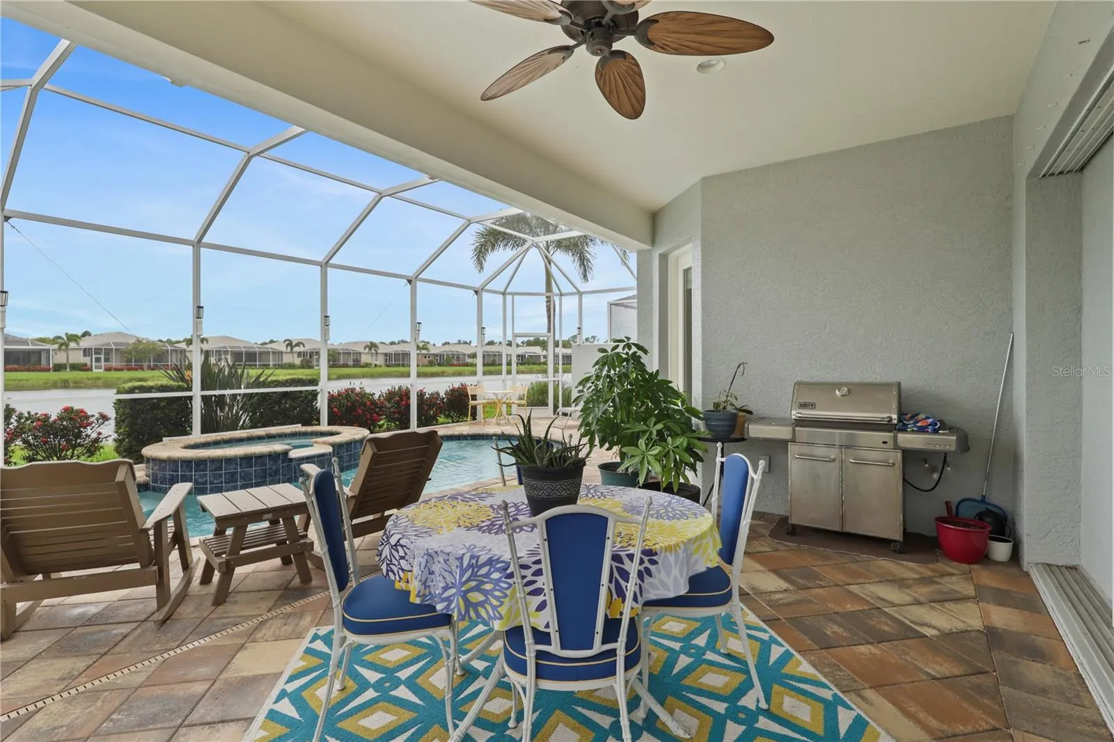 Inside, the home is bright and open with soaring ceilings, elegant double tray accents, custom built-ins, plantation shutters, and refined finishes throughout. The gourmet kitchen is a standout with a large center island, walk-in pantry, granite countertops, stainless steel appliances, and double wall ovens. The kitchen also features a cozy breakfast nook tucked into a bay window allowing you to enjoy your morning coffee bathed in natural sunlight. The sparkling pool has southern exposure and the jetted hot tub is the perfect spot to soak in stunning Florida sunsets. The screened lanai includes covered space and has been plumbed for an outdoor kitchen. The primary suite is a private retreat featuring direct access to the pool, two walk-in closets, dual vanities, a walk-in shower, and a jetted soaking tub for the ultimate in relaxation. The home’s split floor plan is ideal for guests, featuring a guest suite with private bath and walk-in closet, plus a third bedroom (currently used as a den) with convenient access to a half bath. This villa is equipped with impact-glass hurricane windows and clear Lexan panel shutters for the sliding glass doors, ensuring you’re well-prepared for storm season. Optional membership at The Plantation Golf & Country Club opens the door to two championship golf courses, 13 Har-Tru tennis courts, six pickleball courts, bocce ball, fitness center, Jr. Olympic pool, and fantastic dining and social activities. NO CDD FEES. Located just minutes from Venice’s Gulf beaches, Wellen Park Downtown, the Atlanta Braves Spring Training Stadium, shopping, dining, and easy access to I-75, this lakefront villa located on a quiet cut-de-sac offers it all.This is Florida living—simplified, elevated, and ready for you.